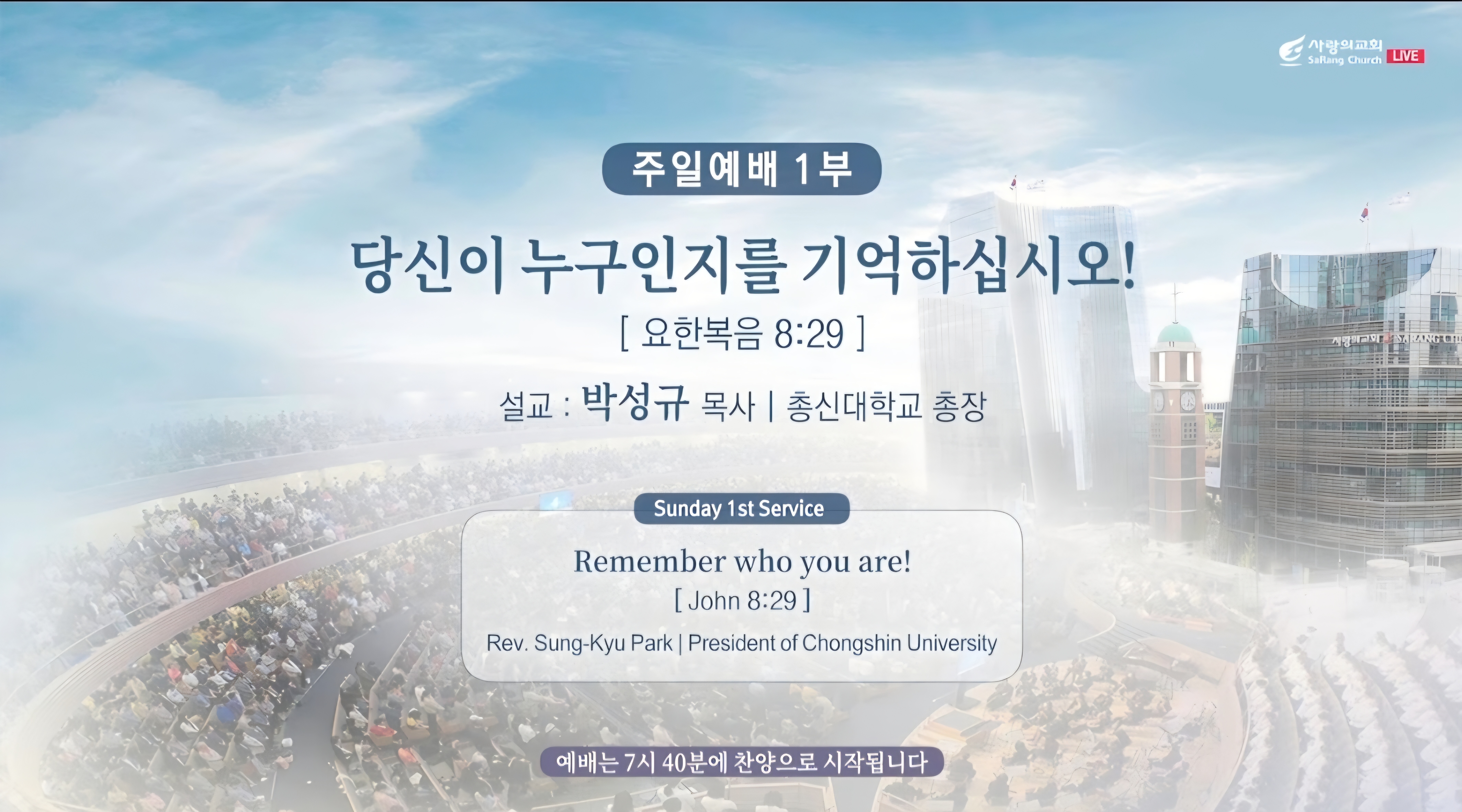 ♣주일예배(주후 2026년 4월 26일) 제목: "당신이 누구인지를 기억하십시오(Remember who you are!)” 말씀: 요한복음 8:29 찬양인도: 쉐키나(이 다니엘 부목사님), 영광찬양대 대표기도: 남동우 부목사님(장애인선교부) 사회: 임병영 부목사님(1부),이기호(2부), 장단희(3부), 임상규(4부)부목사님 설교자: 박성규 목사님 초빙(총신대학교 총장) ---- *요한복음 8:29, 29 나를 보내신 이가 나와 함께 하시도다 나는 항상 그가 기뻐하시는 일을 행하므로 나를 혼자 두지 아니하셨느니라. ---- ▶오늘 말씀은 슬라이드를 준비했는데 보십시오. 당신이 누구인지를 기억하십시오. 라이온 킹이라는 영화를 아실 겁니다. 프라이드랜드에 ‘무파사’라는 훌륭한 왕이 있었는데, 그의 동생이 형을 죽이게 되죠. 그리고 왕이 됩니다. 심바라는 무파사의 어린 왕자는 삼촌을 피해 도망갈 수밖에 없었습니다. 아칸왕 스카의 통치하에 프라이드랜드는 점점 황폐한 땅이 되어버리고 말았습니다. 어느덧 시간이 흘러 심바가 어엿한 청년이 되었습니다. 이때 현자인 라피키가 심바를 찾아가 왕자의 신분을 잃고 방황하는 심바에게 연못에 비친 청년이 된 자기 모습을 보게 하며 아버지는 내 안에 살아계신다고 가르쳐 줍니다. 심바가 연못을 바라보며 자기의 모습을 보다가 거기서 아버지의 모습을 보게 되는 거죠. 그만큼 ‘심바’가 이제 성숙한 사자가 되었다는 거죠. 이때 무파사가 나타나 아들을 부릅니다. “심바”, “아빠, 너는 나를 잊고 있었구나.” 제가 언제요? 아빠 저는 아빠를 잊은 적이 없어요. 네가 누구인지를 잊은 것이 바로 나를 잊은 것이란다. 네, 내면을 보라. 넌 네. 생각보다 훨씬 더 나은 존재다. 내가 반드시 찾아야 할 왕의 자리를 회복하라. 제가 어떻게요? 이때 무파사가 중요한 말을 합니다. “Remember who you are?” “You are my son and the one true king. Remember, remember, remember” 그러면서 무파사는 사라집니다. 소리를 너무 과하게 썼던 것 같습니다. 이때 심바는 비로소 자신이 누구인지 알고 돌아가 황폐한 프라이드랜드를 평화의 나라로 회복시켰습니다. 이제 영화 한 편 다 보셨습니다. 우리도 심바처럼 우리가 누구인지 잊고 살지는 않았을까요? ‘Remember who you are.’ 하나님께서 우리에게 주시고 싶은 말씀이 아닐까요? 그럼 어떻게 우리가 누구인지를 알 수 있을까요? 오늘 본문의 예수님을 통해 배우기를 바랍니다. 죄송합니다. 제가 우리 대학의 기숙사 건축에 서울시청 심의가 5월 6일 앞두고 있어서 오전 금식을 하다 보니까 오늘 설교가 있는데, 아침을 먹어야 되나 말아야 되나 고민하다가 순전하게 금식하자. 그래서 안 했더니, 목이 좀 약간 영향을 받은 것 같습니다. 5월 6일 서울시 심의 잘 되도록 기도해 주시기 바랍니다. 오늘 본문의 예수님은 이런 말씀을 하십니다. 나를 보내시니가 나와 함께하시도다. 예수님을 보내신 성보 하나님을 말하고 있어요. 나는 항상 그가 기뻐하시는 일을 행함으로 내 기쁨이 아니라 나를 보내신 분의 기쁨을 추구하고 있다 라고 말해주고 있죠. 요한복음 8장 19절 이 말씀은 예수님께서 어떤 상황에서 하셨을까? 이것을 알면 이 말씀의 의미가 더 심화될 수 있죠. 먼저 요한복음 8장의 전문맥인 7장 1절부터 보시겠습니다. 1절 한번 읽어주십시오. 그 후에 예수께서 요한복음 7장에 와서는 유대인들이 예수님을 죽이려고 하는 매우 살벌한 분위기가 일어나고 있었습니다. 5절에 보면 형제들까지도 예수를 믿지 않고 오해하는 형이 메시아일 리 없다. 그러면서 심지어 형에게까지 비난까지 하는 그런 상황이었다는 것이죠. 7장 25절에 보면 예루살렘 사람 중에서 어떤 사람이 말하되 이는 그들이 죽이고자 하는 그 사람이 아니냐 예루살렘 사람 중에서 어떤 사람이 느낄 정도로 유대인 가운데 특별히 종교 지도자들이 예수님을 죽이려고 하는 그 의도를 읽어내고 있는 상황입니다. 45절에 오면 아랫사람들이 대제사장들과 바리새인들에게로 오니 이들은 사내들인 의원들이었을 겁니다. 그들이 묻되 어찌하여 잡아오지 않았느냐 라고 책임을 추궁하고 있죠. 아랫사람들의 대답을 들어보십시오. 그 사람이 예수님이 말하는 것처럼 말한 사람은 이때까지 없었나이다. 잡으러 갔다가 은혜를 받은 것이죠. 성령의 강력한 역사가 있을 때 이런 현상들이 나타납니다. 평양 대부분 운동 때 수많은 사람들이 자기의 죄를 회개한다는 소식을 듣고 경찰이 집회 장수에 왔다가 그 경찰이 회심하는 일들이 있었죠. 마치 그와 같은 역사가 있었다는 것이죠. 오늘 찬양대가 성령이오, 임하소서. 이것은 우리 모든 성도들이 추구해야 될 가장 중요한 기도의 제목이죠. 이제 뒤에 문맥으로 갈까요? 요한봉음 8장 29절이 오늘 본문인데 59절로 가면 그들이 돌을 들어 치려 하거늘 예수님을 현장에서 돌을 던져 죽이려고 하는 시도죠. 그러나 십자가의 때가 아직 되지 않았기 때문에 예수님께서는 숨어서 성전에서 나가셨습니다. 전후 문맥을 통해 예수님께서 오늘 본문인 요한복음 8장 29절을 어떤 상황에서 말씀하셨는지 알게 됩니다. 예수님을 오해하고 죽이려는 상황 속에서 하신 말씀입니다. 사람이 오해를 받고 나를 누군가 죽이