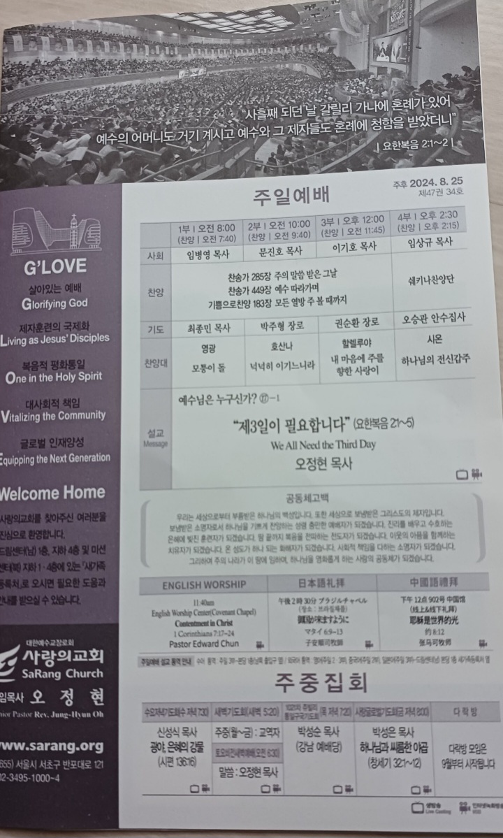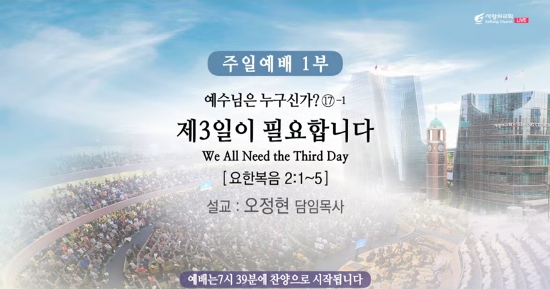 ♣주일예배(주후 2024년 8월 25일) 제목: "제3일이 중요합니다."-예수님은 누귀신가?⑰-1 말씀: 요한복음 2:1~5 찬양인도: 쉐키나(오준석 부목사님), 영광찬양대 외 대표기도: 최종민 부목사님 외 사회: 임병영,(1부) 문진호(2부), 이기호(3부), 임상규(4부)부목사님 설교자: 오정현 담임목사님 ㅡㅡㅡㅡㅡ *요한복음 2:1~5, 1 사흘째 되던 날 갈릴리 가나에 혼례가 있어 예수의 어머니도 거기 계시고. 2 예수와 그 제자들도 혼례에 청함을 받았더니. 3 포도주가 떨어진지라 예수의 어머니가 예수에게 이르되 저들에게 포도주가 없다 하니. 4 예수께서 이르시되 여자여 나와 무슨 상관이 있나이까 내 때가 아직 이르지 아니하였나이다. 5 그의 어머니가 하인들에게 이르되 너희에게 무슨 말씀을 하시든지 그대로 하라 하니라. ㅡㅡㅡㅡㅡ 사랑하는 형제자매 여러분, 찬양대 정성을 다한 귀한 찬양을 주님이 받으신 줄 믿습니다. 역대 급 무더위를 통과하신 거 축하합니다. 아 정말 대단한 지난여름이었습니다. 이 무더위를 통과하고 이 본격적인 이 가을 사역을 시작할 수 있도록 우리에게 환경 주시고, 또 믿음 주시고 또 건강 주시고 은혜 주시고 또 기대감을 주신 주님을 찬양합니다. 사랑의 교회는 항상 이 8월 마지막 주일이 가을 사역의 시작 주일입니다. 여러분, 오늘 어떻게 오셨는지 모르지만 저는 오늘 ‘하나님 아버지, 이 가을 사역에 주실 은혜들을 오늘 정말 기대감을 갖고 온 모든 성도들을 한 명도 그냥 돌려보내지 마시고 유아 부부터 시작해서 포에버까지 우리 교회를 이 성령 충만한 가사 일이 되게 하여 주시옵소서.’ 기도하고 준비했습니다. 자, 오늘 제가 ‘제 3일이 필요합니다.’ 라는 제목으로, 여러분 잘 아시는 가나 혼인 잔치인, 가나혼인 잔치 이 말씀을 전할 텐데, 어 교회 생활을 오래 하시는 분들은 이 내용을 많이들 다 잘 알고 계시죠? 잘 알고 계시는데 안다고 아는 건 아니고, 내 것이 되어야 아는 것이에요. 뒤에 보면 나오지만 연회장(宴會長)은 이 사건의 핵심을 몰랐지만 물 떠온 하인들은 알더라. 그랬어요. 지식을 보나 지위를 보나 연회장, 그 잔치의 제일 책임자는 몰랐지만, 물 떠 온 하인들은 알더라. 2008년도에 베이징 올림픽이 있었는데요. 그때 m모 지상 방송에서 아프리카 가나가 나오니까요. 저 아프리카 가나가 예수님이 가나 혼인 잔치를 한 곳입니다. 라고 하더라구요. 지상 방송에서?? 제가 하나도 틀림이 없어요. 그러니까 그런 식의 엉터리가 되면 안 된다는 거예요. 아시겠어요? 우리가 다 아는 것 같지만 그래서 오늘은 제가 특별히 “제 3일이 필요합니다.” 라는 제목으로 오늘 일절에 보면 사흘째 되던 날 이렇게 나오죠? 일절에, 그런데 그 앞에 요한복음 2장 1절 앞은 어디에 되게 어렵습니까? *요한복음 2:1, 1 사흘째 되던 날 갈릴리 가나에 혼례가 있어 예수의 어머니도 거기 계시고. -1장 51절에, 1장 51절에 뭐라고 나와 있냐? 요한복음 1장 바로 앞 절입니다. *요한복음 1:51, 51 또 이르시되 진실로 진실로 너희에게 이르노니 하늘이 열리고 하나님의 사자들이 인자 위에 오르락 내리락 하는 것을 보리라 하시니라, -바로 시작 하늘이 열리고, 하나님의 사자들이 하늘이 열리고, 하나님의 사자들이 인자는 누굽니까? 예수님, 당신 스스로를 말씀하시는 거죠? 바로 하나님의 아들(The Son of Man), 그 바로 그 하나님의 아들, 성자 예수 그리스도를 말하는데 하늘이 열리고, 인자 되신 예수 그리스도를 깨닫게 되었다. 오르락 내리락 깨닫게 되었다. 오늘 안아주심의 본당에 이 하늘 문이 열리고, 인자 되신 예수 그리스도를 깨닫는 그런 영광스러운 시간 되면 좋겠어요. 변화의 능력자 되신 예수 그리스도, 우선 첫 번째 질문이 있습니다. 왜 예수님께서 갈릴리 가나 혼인 잔치에서 첫 표적을 행하셨을까요? -이제 이게 너무 중요한데 오늘 주일 다음 주일 두 주일에 걸쳐서 말씀을 드릴 텐데, 다음 주에는 교회사 쪽으로 좀 말씀을 드릴 거고, 오늘은 이제 본문을 통해 말씀드리는데 왜 그랬을까요? 예수님의 첫 표적을 시장에서 시장 거리에서 행할 수도 있고, 예수님의 첫 표적을 어떤 그 병원에서 행할 수도 있고, 예수님이 첫 표적을 뭐 일반적인 어떤 다른 장소에도 행할 수도 있지만 왜 이제 표정을 갈릴리 가나 혼인 잔치에서 하셨을까요? 여기 이 질문에 대한 여러 해석이 있지만 오늘 이 질문에 대한 답은 뭐냐 하면 첫 표적을 혼인 잔치 하신 이유가 뭐냐 하면, 우리 정통적인 신약의 해석은 종말론적인 기쁨의 잔치를 예표 하는 것이다. 소위 우리가 나중에 주님 나팔 볼 때, 나의 이름, 우리가 정말 주님의 품에 안겨 가지고 우리가 천국 갈 때 어린 양의 혼인 잔치에 참여한다. 그런 말 들어보셨죠? 그러니까 이 첫 표적을 그러니까 제자들이 말이죠. 제자들이 11절에 보니까, *요한복음 2:11, 11 예수께서 이 첫 표적을 갈릴리 가나에서 행하여 그의 영광을 나타내시매 제자들이 그를 믿으니라. -예수님이 첫 표적을 갈릴리 가나 혼인 잔치에 행심에 비로소 제자들이 예수님을 뭐예요? 믿으니라. 그 전에는 안 믿었어요. 그전에는 예수님을 그냥 선지자다. 그냥 예수님을 좋은 선생님이다. 좋은 귀한 분이다