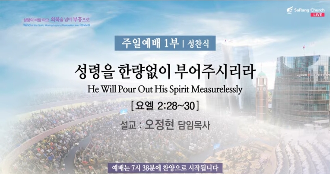 주일예배(주후 2023년 8월 13일) 제목: "눈물로 꿈꾸는 추수" 말씀: 시편 123:1-6 찬양인도: 쉐키나(이 다니엘 부목사님), 영광찬양대 대표기도: 양은규 부목사님 사회: 천동원 부목사님(1부) 설교자: 오정현 담임목사님 ------------- *시편 123:1-6, 1 여호와께서 시온의 포로를 돌려 보내실 때에 우리는 꿈꾸는 것 같았도다. 2 그 때에 우리 입에는 웃음이 가득하고 우리 혀에는 찬양이 찼었도다 그 때에 뭇 나라 가운데에서 말하기를 여호와께서 그들을 위하여 큰 일을 행하셨다 하였도다. 3 여호와께서 우리를 위하여 큰 일을 행하셨으니 우리는 기쁘도다. 4 여호와여 우리의 포로를 남방 시내들 같이 돌려 보내소서. 5 눈물을 흘리며 씨를 뿌리는 자는 기쁨으로 거두리로다. 6 울며 씨를 뿌리러 나가는 자는 반드시 기쁨으로 그 곡식 단을 가지고 돌아오리로다. ------------- ▶담임 목사님께서 “눈물로 꿈꾸는 추수”라는 제목으로 78주년 광복절 특별 메시지를 전해주시겠습니다.