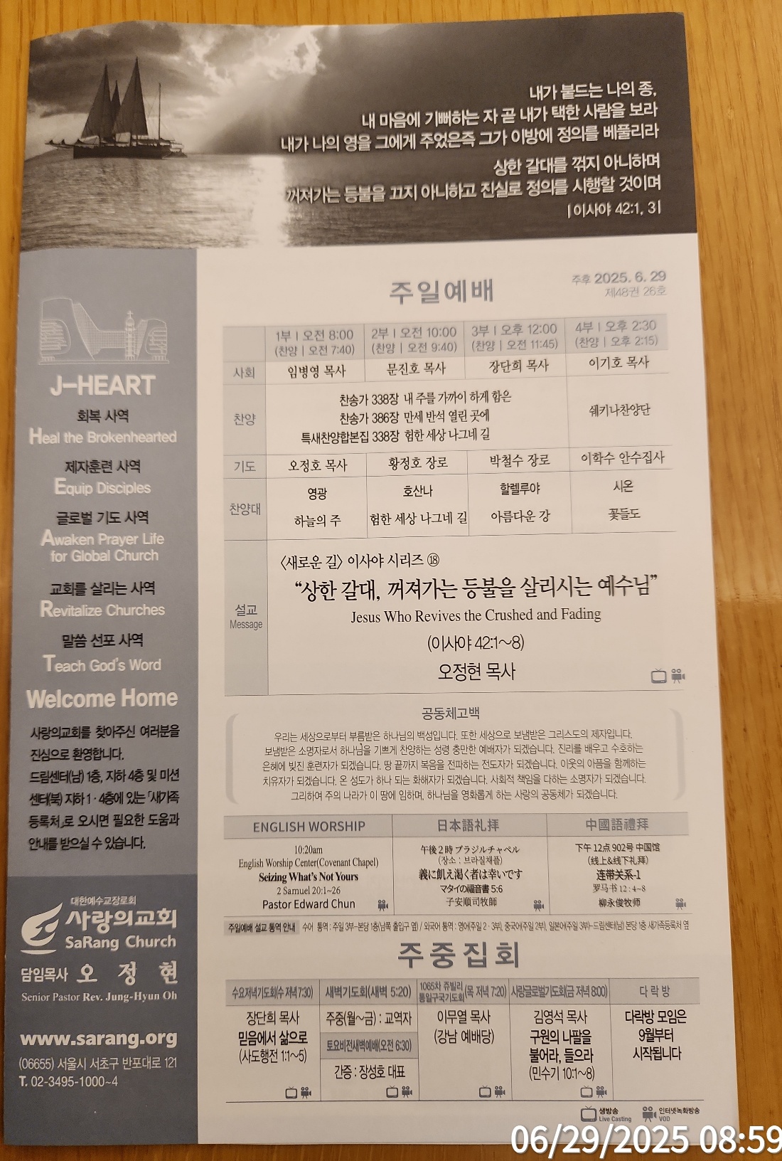 ♣주일예배(주후 2025년 8월 17일) 설교제목: 광복을 위한 물맷돌"(A Slingstone for Liberation) 성경본문: 사무엘상 17:45~49, 사무엘하 8:6 찬양인도: 쉐키나(이 다니엘 부목사님), 영광찬양대(1부) 대표기도: 장명철 부목사님(1부) 사회: 임병영 부목사님 헌금찬송: 테너 김요한 집사님 설교자:오정현 담임목사님 ---- *사무엘상 17:45~49, 45 다윗이 블레셋 사람에게 이르되 너는 칼과 창과 단창으로 내게 나아 오거니와 나는 만군의 여호와의 이름 곧 네가 모욕하는 이스라엘 군대의 하나님의 이름으로 네게 나아가노라. 46 오늘 여호와께서 너를 내 손에 넘기시리니 내가 너를 쳐서 네 목을 베고 블레셋 군대의 시체를 오늘 공중의 새와 땅의 들짐승에게 주어 온 땅으로 이스라엘에 하나님이 계신 줄 알게 하겠고. 47 또 여호와의 구원하심이 칼과 창에 있지 아니함을 이 무리에게 알게 하리라 전쟁은 여호와께 속한 것인즉 그가 너희를 우리 손에 넘기시리라. 48 블레셋 사람이 일어나 다윗에게로 마주 가까이 올 때에 다윗이 블레셋 사람을 향하여 빨리 달리며. 49 손을 주머니에 넣어 돌을 가지고 물매로 던져 블레셋 사람의 이마를 치매 돌이 그의 이마에 박히니 땅에 엎드러지니라. *사무엘하 8:6, 6 다윗이 다메섹 아람에 수비대를 두매 아람 사람이 다윗의 종이 되어 조공을 바치니라 다윗이 어디로 가든지 여호와께서 이기게 하시니라. ----- ▶자 오늘 아름답고 영광스러운 광복절인데 주님만의 높임을 받기를 바랍니다. 그리고 여러분들 이 자리에 주님 사모해 나오셨는데 아무도 그냥 돌아가지 마시기를 바라고 삶의 모든 우수사려 또 큰 삶의 모든 짐들이 벗겨지기를 소망합니다. 저는 오늘 광복 80주년을 맞이하여 광복절을 위한 다윗의 물맷돌이라는 제목으로 오늘 말씀을 전하겠습니다. 우리는 광복 70주년을 지났습니다. 그리고 80주년이 됐는데, 10년 전에 저희들이 큰 기대를 가지고 있었습니다. 뭐냐 하면 이스라엘 백성들이 바빌론에서 포로 몇 년 했죠? 70년 했죠. 70년 지나면 해방된 것처럼 대한민국도 남북이 분단됐는데, 70년이 지나면 하나님 무언가 은혜를 주실 줄 믿습니다. 하고 많이 기대를 했는데 낫띵 해픈,,, 뭐 무슨 일이 일어나지 않았어요. 그런데 오늘 80주년을 맞이하면서 제가 묵상하고 하는 가운데 마음의 소원이 생겼어요. 이 80이라는 숫자는 뭐 여러 가지 의미가 있지만 모세라는 하나님의 신실한 종에게는 80이 모세가 사명 받은 시간이었어요. 80세, 40세 미디안에 쫓겨가서 위대한 광야에 40년 있다가 80세 때 하나님과 소명을 떠 호렙 산의 떨기나무 가운데서 받았어요. 그리고 80세 받고 난 다음에 그가 시편 90편을 쓰면서 시편 90편 10절에, *시편 90:10, 10 우리의 연수가 칠십이요 강건하면 팔십이라도 그 연수의 자랑은 수고와 슬픔뿐이요 신속히 가니 우리가 날아가나이다. -무슨 말인가 하면 모세가 인생의 유한함도 얘기했지만, 더 중요한 것은 여러분 80살이 되면 자기 마음대로 못 삽니다. 80살이 되면, 하나님 의뢰해야 합니다. 제가 지금 좋은 말로 얘기하는 겁니다. 젊을 때는 뭐 힘이 있다고 그러지만 80이 넘으면 하나님 의뢰하지 않고는 살 수가 없어요. 그가 뭐 어느 학벌이 좋든 뭐 그가 재산이 크든 뭐 세상 적으로 대단하든, 80 넘으면 인간은 다 똑같아요. 하나님만을 전적으로 위탁해야 합니다. 마찬가지로, 제가 이 80주년을 하면서 제 마음의 소원이 하나님, 대한민국이 이제 하나님만을 전적으로 의탁하게 하여 주십시오. 대한민국의 이제 이 정치 경제 문화, 사회 이 수많은 어려운 난제(難題)들과 다른 길이 없습니다. 하나님만을 전적으로 위탁하오니 이 80주년이 의미가 있게 하여 주십시오. 의미가 있게 하여 주십시오. 오늘 80이라는 나이는 하나님이 도우심이 있어야 살아갈 수 있는 나이인데 여러분, 이 가운데 연세 드신 분들 제 말이 맞아요?. 틀려요? 나이가 젊어 갖고 대답을 할 수 없나요? 그래서 오늘 이 시간은 하나님을 전적으로 의지하면서 지금 말씀 안 드려도 대한민국이라는 정치 경제 문화 사회적 환경을 들어보면 하나님의 도우심이 없이는 대한민국은 하루도 견딜 수 없는 절박한 상황이 되었어요. 그래서 이 80주년을 맞이하면서 우리는 하나님의 초월적 개입과 초자연적인 은혜가 있기를 바라는 것입니다. 그리고 하나님의 초월적(超越的) 개입과 초자연(超自然)적인 은혜의 어떤 대표가 오늘 다윗의 물멘돌이라고 할 수 있습니다. 여러분, 이 본문을 여러분 다 안다고 생각하지만 어릴 때부터 주일학교 많이 알지만 다 안다고 생각하지 말고 마음의 눈을 열어 가지고 국가적으로도 여러분 개인적으로도 하나님의 초자연적인 개입이 있기를 바라는 것입니다. 마음의 간절(懇切)함에서 젊은 분들뿐만 아니라, 오늘 70 80이 넘은 분들도 이 말씀 때문에 가슴이 뛰시기를 바랍니다. 70~80 넘은 분들, 젊은 분들, 언제 가슴이 뛰어 보셨어요? 목사님 저는 가슴 뛸 일이 헬스장밖에 없습니다. 그러면 안되죠. 말씀을 들어야 가슴이 뜁니다. 오늘 본문의 사무엘하 8장 6절에 뭐라고 되어 있느냐, 이렇게 나와 있습니다. 다윗이 같이 보죠. *사무엘하 8:6, 6 다윗이 다메섹 아람에 수비대를 두매 아람 사람