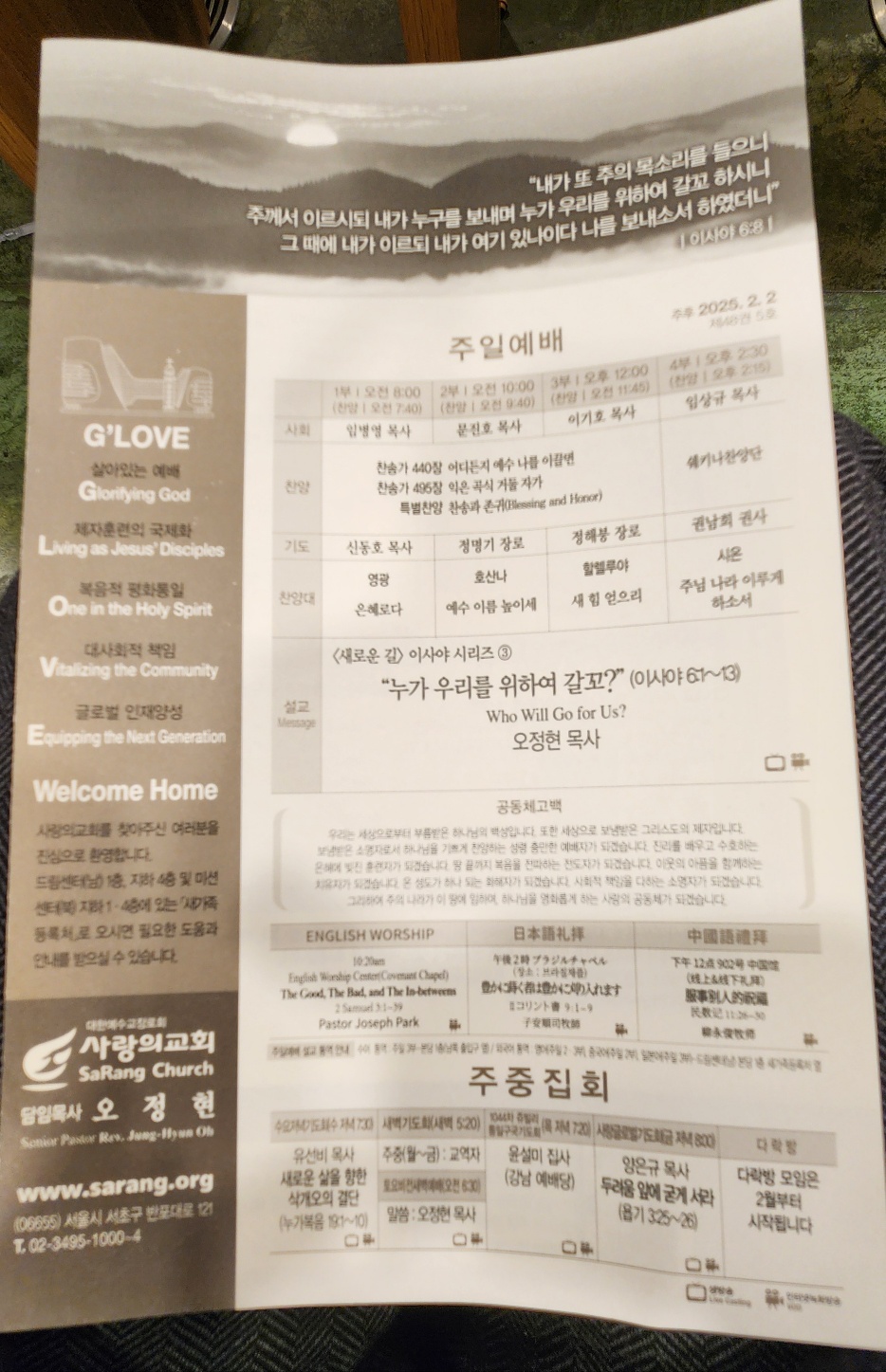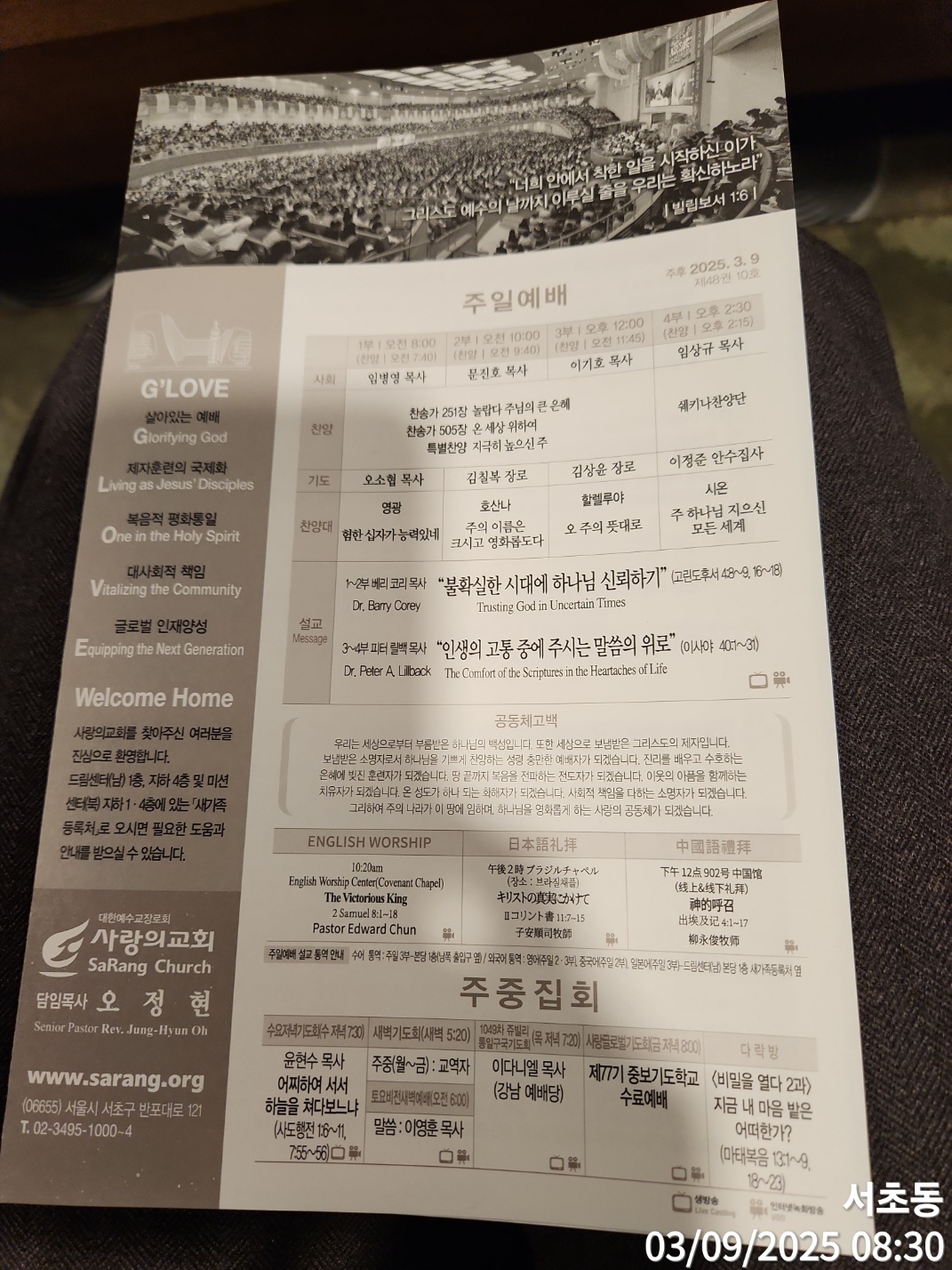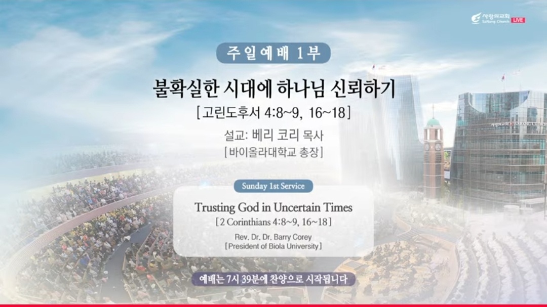♣주일예배(주후 2025년 3월 9일) 제목:1,2부: "불확실한 시대에 하나님 신뢰하기"(Tnusting God in Uncertain Times), 제목: 3,4부-"인생의 고통중에 주시는 말씀의 위로"(The Comfort of the Scriptures in the Heartaches of Life) 말씀: 고린도후서 4:8-9,16-18, 이사야 40:1-31 찬양인도: 쉐키나(이 다니엘 부목사님), 영광찬양대(1부 외) 대표기도: 오소협 부목사님(1부 외) 사회: 임병영 부목사님(1부 외) 설교자:베리 코리 목사님(Dr.Bary Corey):통역(김인기 부목사님), 피터 릴백 목사님(Dr. Peter A, Lilback):통역(정상익 부목사님) ----- *고린도후서 4:8-9, 16-18, 8 우리가 사방으로 욱여쌈을 당하여도 싸이지 아니하며 답답한 일을 당하여도 낙심하지 아니하며. 9 박해를 받아도 버린 바 되지 아니하며 거꾸러뜨림을 당하여도 망하지 아니하고. 16 그러므로 우리가 낙심하지 아니하노니 우리의 겉사람은 낡아지나 우리의 속사람은 날로 새로워지도다. 17 우리가 잠시 받는 환난의 경한 것이 지극히 크고 영원한 영광의 중한 것을 우리에게 이루게 함이니. 18 우리가 주목하는 것은 보이는 것이 아니요 보이지 않는 것이니 보이는 것은 잠깐이요 보이지 않는 것은 영원함이라. *이사야 40:1-31, 1 너희의 하나님이 이르시되 너희는 위로하라 내 백성을 위로하라. 2 너희는 예루살렘의 마음에 닿도록 말하며 그것에게 외치라 그 노역의 때가 끝났고 그 죄악이 사함을 받았느니라 그의 모든 죄로 말미암아 여호와의 손에서 벌을 배나 받았느니라 할지니라 하시니라. 3 외치는 자의 소리여 이르되 너희는 광야에서 여호와의 길을 예비하라 사막에서 우리 하나님의 대로를 평탄하게 하라. 4 골짜기마다 돋우어지며 산마다, 언덕마다 낮아지며 고르지 아니한 곳이 평탄하게 되며 험한 곳이 평지가 될 것이요. 5 여호와의 영광이 나타나고 모든 육체가 그것을 함께 보리라 이는 여호와의 입이 말씀하셨느니라. 6 말하는 자의 소리여 이르되 외치라 대답하되 내가 무엇이라 외치리이까 하니 이르되 모든 육체는 풀이요 그의 모든 아름다움은 들의 꽃과 같으니. 7 풀은 마르고 꽃이 시듦은 여호와의 기운이 그 위에 붊이라 이 백성은 실로 풀이로다. 8 풀은 마르고 꽃은 시드나 우리 하나님의 말씀은 영원히 서리라 하라. 9 아름다운 소식을 시온에 전하는 자여 너는 높은 산에 오르라 아름다운 소식을 예루살렘에 전하는 자여 너는 힘써 소리를 높이라 두려워하지 말고 소리를 높여 유다의 성읍들에게 이르기를 너희의 하나님을 보라 하라. 10 보라 주 여호와께서 장차 강한 자로 임하실 것이요 친히 그의 팔로 다스리실 것이라 보라 상급이 그에게 있고 보응이 그의 앞에 있으며. 11 그는 목자 같이 양 떼를 먹이시며 어린 양을 그 팔로 모아 품에 안으시며 젖먹이는 암컷들을 온순히 인도하시리로다. 12 누가 손바닥으로 바닷물을 헤아렸으며 뼘으로 하늘을 쟀으며 땅의 티끌을 되에 담아 보았으며 접시 저울로 산들을, 막대 저울로 언덕들을 달아 보았으랴. 13 누가 여호와의 영을 지도하였으며 그의 모사가 되어 그를 가르쳤으랴. 14 그가 누구와 더불어 의논하셨으며 누가 그를 교훈하였으며 그에게 정의의 길로 가르쳤으며 지식을 가르쳤으며 통달의 도를 보여 주었느냐. 15 보라 그에게는 열방이 통의 한 방울 물과 같고 저울의 작은 티끌 같으며 섬들은 떠오르는 먼지 같으리니. 16 레바논은 땔감에도 부족하겠고 그 짐승들은 번제에도 부족할 것이라. 17 그의 앞에는 모든 열방이 아무것도 아니라 그는 그들을 없는 것 같이, 빈 것 같이 여기시느니라. 18 그런즉 너희가 하나님을 누구와 같다 하겠으며 무슨 형상을 그에게 비기겠느냐. 19 우상은 장인이 부어 만들었고 장색이 금으로 입혔고 또 은 사슬을 만든 것이니라. 20 궁핍한 자는 거제를 드릴 때에 썩지 아니하는 나무를 택하고 지혜로운 장인을 구하여 우상을 만들어 흔들리지 아니하도록 세우느니라. 21 너희가 알지 못하였느냐 너희가 듣지 못하였느냐 태초부터 너희에게 전하지 아니하였느냐 땅의 기초가 창조될 때부터 너희가 깨닫지 못하였느냐 22 그는 땅 위 궁창에 앉으시나니 땅에 사는 사람들은 메뚜기 같으니라 그가 하늘을 차일 같이 펴셨으며 거주할 천막 같이 치셨고. 23 귀인들을 폐하시며 세상의 사사들을 헛되게 하시나니. 24 그들은 겨우 심기고 겨우 뿌려졌으며 그 줄기가 겨우 땅에 뿌리를 박자 곧 하나님이 입김을 부시니 그들은 말라 회오리바람에 불려 가는 초개 같도다. 25 거룩하신 이가 이르시되 그런즉 너희가 나를 누구에게 비교하여 나를 그와 동등하게 하겠느냐 하시니라. 26 너희는 눈을 높이 들어 누가 이 모든 것을 창조하였나 보라 주께서는 수효대로 만상을 이끌어 내시고 그들의 모든 이름을 부르시나니 그의 권세가 크고 그의 능력이 강하므로 하나도 빠짐이 없느니라. 27 야곱아 어찌하여 네가 말하며 이스라엘아 네가 이르기를 내 길은 여호와께 숨겨졌으며 내 송사는 내 하나님에게서 벗어난다 하느냐. 28 너는 알지 못하였느냐 듣지 못하였느냐 영원하신 하나님 여호와, 땅 끝까지 창조하신 이는 피곤하지 않으시며 곤비하지 않으시며 명철이 한이 없으시며. 29 피곤한 자에게는 능력을 주시며 무능한 자에게