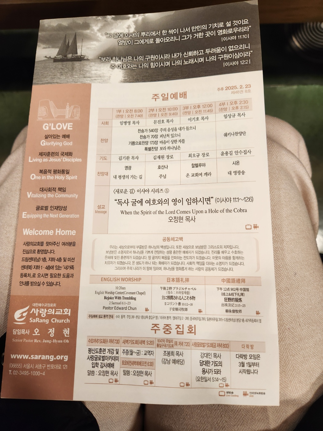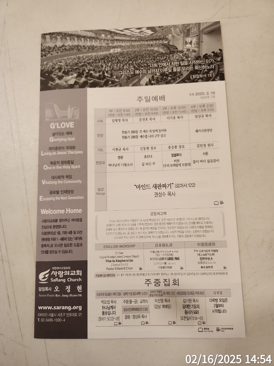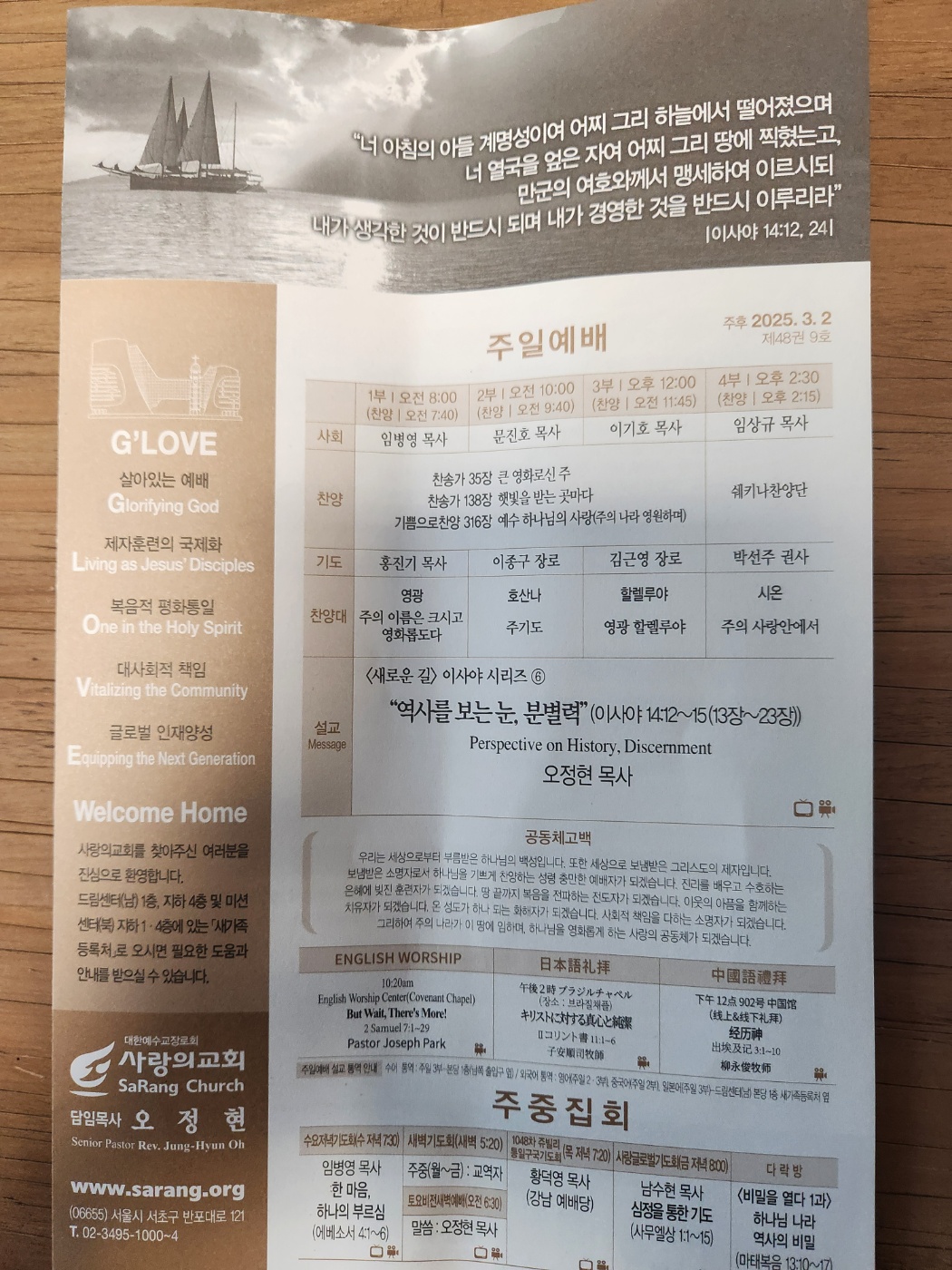 ♣주일예배(주후 2025년 3월 9일) 제목:1,2부: "불확실한 시대에 하나님 신뢰하기"(Tnusting God in Uncertain Times), 제목: 3,4부-"인생의 고통중에 주시는 말씀의 위로"(The Comfort of the Scriptures in the Heartaches of Life) 말씀: 고린도후서 4:8-9,16-18, 이사야 40:1-31 찬양인도: 쉐키나(이 다니엘 부목사님), 영광찬양대(1부 외) 대표기도: 오소협 부목사님(1부 외) 사회: 임병영 부목사님(1부 외) 설교자:베리 코리 목사님(Dr.Bary Corey):통역(김인기 부목사님), 피터 릴백 목사님(Dr. Peter A, Lilback):통역(정상익 부목사님) ----- *고린도후서 4:8-9, 16-18, 8 우리가 사방으로 욱여쌈을 당하여도 싸이지 아니하며 답답한 일을 당하여도 낙심하지 아니하며. 9 박해를 받아도 버린 바 되지 아니하며 거꾸러뜨림을 당하여도 망하지 아니하고. 16 그러므로 우리가 낙심하지 아니하노니 우리의 겉사람은 낡아지나 우리의 속사람은 날로 새로워지도다. 17 우리가 잠시 받는 환난의 경한 것이 지극히 크고 영원한 영광의 중한 것을 우리에게 이루게 함이니. 18 우리가 주목하는 것은 보이는 것이 아니요 보이지 않는 것이니 보이는 것은 잠깐이요 보이지 않는 것은 영원함이라. *이사야 40:1-31, 1 너희의 하나님이 이르시되 너희는 위로하라 내 백성을 위로하라. 2 너희는 예루살렘의 마음에 닿도록 말하며 그것에게 외치라 그 노역의 때가 끝났고 그 죄악이 사함을 받았느니라 그의 모든 죄로 말미암아 여호와의 손에서 벌을 배나 받았느니라 할지니라 하시니라. 3 외치는 자의 소리여 이르되 너희는 광야에서 여호와의 길을 예비하라 사막에서 우리 하나님의 대로를 평탄하게 하라. 4 골짜기마다 돋우어지며 산마다, 언덕마다 낮아지며 고르지 아니한 곳이 평탄하게 되며 험한 곳이 평지가 될 것이요. 5 여호와의 영광이 나타나고 모든 육체가 그것을 함께 보리라 이는 여호와의 입이 말씀하셨느니라. 6 말하는 자의 소리여 이르되 외치라 대답하되 내가 무엇이라 외치리이까 하니 이르되 모든 육체는 풀이요 그의 모든 아름다움은 들의 꽃과 같으니. 7 풀은 마르고 꽃이 시듦은 여호와의 기운이 그 위에 붊이라 이 백성은 실로 풀이로다. 8 풀은 마르고 꽃은 시드나 우리 하나님의 말씀은 영원히 서리라 하라. 9 아름다운 소식을 시온에 전하는 자여 너는 높은 산에 오르라 아름다운 소식을 예루살렘에 전하는 자여 너는 힘써 소리를 높이라 두려워하지 말고 소리를 높여 유다의 성읍들에게 이르기를 너희의 하나님을 보라 하라. 10 보라 주 여호와께서 장차 강한 자로 임하실 것이요 친히 그의 팔로 다스리실 것이라 보라 상급이 그에게 있고 보응이 그의 앞에 있으며. 11 그는 목자 같이 양 떼를 먹이시며 어린 양을 그 팔로 모아 품에 안으시며 젖먹이는 암컷들을 온순히 인도하시리로다. 12 누가 손바닥으로 바닷물을 헤아렸으며 뼘으로 하늘을 쟀으며 땅의 티끌을 되에 담아 보았으며 접시 저울로 산들을, 막대 저울로 언덕들을 달아 보았으랴. 13 누가 여호와의 영을 지도하였으며 그의 모사가 되어 그를 가르쳤으랴. 14 그가 누구와 더불어 의논하셨으며 누가 그를 교훈하였으며 그에게 정의의 길로 가르쳤으며 지식을 가르쳤으며 통달의 도를 보여 주었느냐. 15 보라 그에게는 열방이 통의 한 방울 물과 같고 저울의 작은 티끌 같으며 섬들은 떠오르는 먼지 같으리니. 16 레바논은 땔감에도 부족하겠고 그 짐승들은 번제에도 부족할 것이라. 17 그의 앞에는 모든 열방이 아무것도 아니라 그는 그들을 없는 것 같이, 빈 것 같이 여기시느니라. 18 그런즉 너희가 하나님을 누구와 같다 하겠으며 무슨 형상을 그에게 비기겠느냐. 19 우상은 장인이 부어 만들었고 장색이 금으로 입혔고 또 은 사슬을 만든 것이니라. 20 궁핍한 자는 거제를 드릴 때에 썩지 아니하는 나무를 택하고 지혜로운 장인을 구하여 우상을 만들어 흔들리지 아니하도록 세우느니라. 21 너희가 알지 못하였느냐 너희가 듣지 못하였느냐 태초부터 너희에게 전하지 아니하였느냐 땅의 기초가 창조될 때부터 너희가 깨닫지 못하였느냐 22 그는 땅 위 궁창에 앉으시나니 땅에 사는 사람들은 메뚜기 같으니라 그가 하늘을 차일 같이 펴셨으며 거주할 천막 같이 치셨고. 23 귀인들을 폐하시며 세상의 사사들을 헛되게 하시나니. 24 그들은 겨우 심기고 겨우 뿌려졌으며 그 줄기가 겨우 땅에 뿌리를 박자 곧 하나님이 입김을 부시니 그들은 말라 회오리바람에 불려 가는 초개 같도다. 25 거룩하신 이가 이르시되 그런즉 너희가 나를 누구에게 비교하여 나를 그와 동등하게 하겠느냐 하시니라. 26 너희는 눈을 높이 들어 누가 이 모든 것을 창조하였나 보라 주께서는 수효대로 만상을 이끌어 내시고 그들의 모든 이름을 부르시나니 그의 권세가 크고 그의 능력이 강하므로 하나도 빠짐이 없느니라. 27 야곱아 어찌하여 네가 말하며 이스라엘아 네가 이르기를 내 길은 여호와께 숨겨졌으며 내 송사는 내 하나님에게서 벗어난다 하느냐. 28 너는 알지 못하였느냐 듣지 못하였느냐 영원하신 하나님 여호와, 땅 끝까지 창조하신 이는 피곤하지 않으시며 곤비하지 않으시며 명철이 한이 없으시며. 29 피곤한 자에게는 능력을 주시며 무능한 자에게