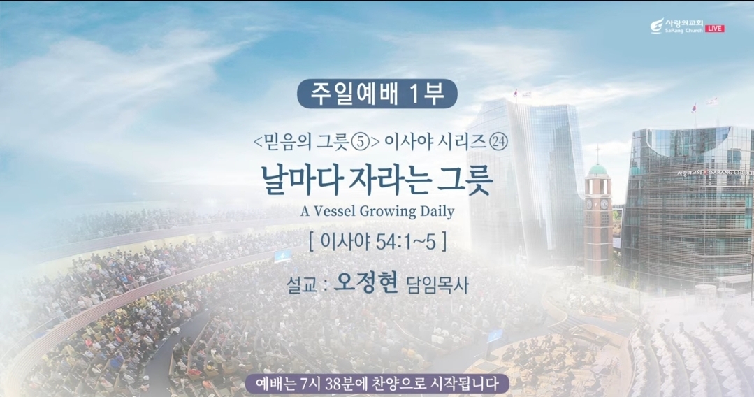 저는 지금 아 믿음의 그릇 시리즈 이사야 강해, 오늘 이제 강해로서는 오늘 24번째인데 믿음의 그 시리즈로는 오늘 다섯 번째가 되겠습니다. 제가 이 말씀을 준비하면서 지난주일 날 사명 계승의 은혜를 얘기하면서 육신의 목숨은 유통기한이 있지만 사명의 그릇은 유통기한이 없다. 그리고 이 사명의 그릇이 유통 기한이 없이 오래 보존되려면 성장이라는 음식을 먹어야 한다. 뭘 먹어야 한다고요? ‘성장’이라는 음식을, 그 성장이라는 음식을 중단하는 순간에