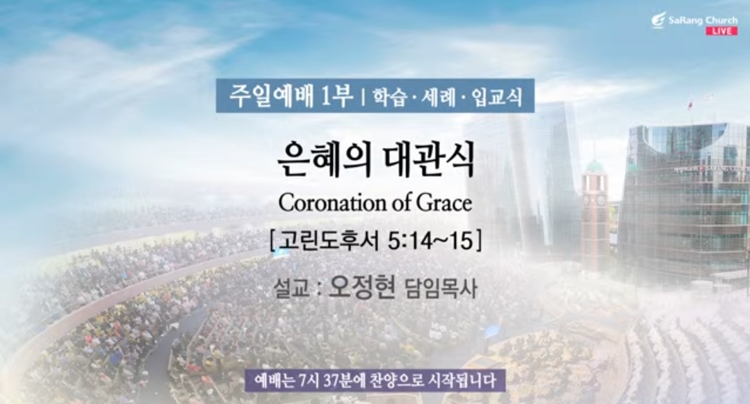 주일예배(주후 2023년 11월 12일)-세례식 제목: “은혜의 대관식” 말씀: 고린도후서 5:14~15 찬양인도: 쉐키나(이 다니엘 부목사님), 영광찬양대 대표기도: 김은석 부목사님(1부) 사회; 천동원 부목사님(1부) 세례식 간증: 이현우, 이정혜 성도(1부) 설교자: 오정현 담임목사님 ㅡㅡㅡㅡㅡ *고린도후서 5:14~15, 14 그리스도의 사랑이 우리를 강권하시는도다 우리가 생각하건대 한 사람이 모든 사람을 대신하여 죽었은즉 모든 사람이 죽은 것이라. 15 그가 모든 사람을 대신하여 죽으심은 살아 있는 자들로 하여금 다시는 그들 자신을 위하여 살지 않고 오직 그들을 대신하여 죽었다가 다시 살아나신 이를 위하여 살게 하려 함이라. ㅡㅡㅡㅡ -10월 23일 날 7천여 명의 목회자들과 천년 교회 사역자들이 참석하시는 제2회 한국교회 섬김 나에 대한 은혜의 진리를 한 번씩 맹맹하고 있습니다. 많은 곳 사람들이 힘들게 못 했는데 힘을 얻고 다시 잡을 수 있는 어떤 그런 방향을 잡았다. 얘기를 하시고 그다음에 이제 그 목사님들이 목회하시는 교회 성도들에 대한 반응을 들어 이게 뭐냐 하면 우리 목사님이 한교섬에 갔다 오시더니 너무너무 새로워지고 달라지셨어요. 그렇게 하고 “목사님 한국교회 섬기는 말을 한 번만 말고 계속하시죠.” 우리 성도들 정말 수고 많이 하시고 하나님께 영광을 올려드립니다. 오늘 366분의 학습, 세례, 입교, 여러분들이 가지시는 게 신앙인 교회가 계속해서 이 복음의 능력 생수의 강의 한 달에 한 번씩 하면 더 영광 올려 드립니다. 그리고 세례 받게 되기까지의 과정이 단계는 보통이 아닙니다. 수많은 어려움들을 극복하고 오늘 세례 받게 되는 거 진심으로 축하하고 격려를 드립니다. 오늘 말씀의 제목은 "은혜의 대관식" 세례식을 통한 은혜의 대관식에 대해서 말씀드리겠습니다. 본문은 우선 세례에 대한 가장 중요한 부분은 마태복음 16장 17절에 나와 있는데, *마태복음 3:16~17, 16 예수께서 세례를 받으시고 곧 물에서 올라오실 새 하늘이 열리고 하나님의 성령이 비둘기 같이 내려 자기 위에 임하심을 보시더니. 17 하늘로부터 소리가 있어 말씀하시되 이는 내 사랑하는 아들이요 내 기뻐하는 자라 하시니라. -16장 17절에 나오는데 예수께서 세례를 받으시고 곧 물에서 올라오셨어요. 첫째 뭐가 됐어요? 성령이 비둘기같이 내려 예수님께 이 말씀을 보느니 그다음에 하늘로부터 소리가 있어 말씀하시되 이는 내 사랑 아들이여 내 기뻐하는 자라 하더라. 그랬습니다. 이 말씀이 너무 중요하기 때문에 나가보도록 그렇게 합니다. 누가 보든 상관이냐 공관복음에 다 이 내용이 다 나와 있습니다. 특별히 예수님의 세례를 받으신 분이에요. 세례를 통해서 이런 “내 사랑하는 아들이요 내 기뻐하는 자라.” 정체성 회복이 돼 정체성을 갖게 되죠. 그러니까 예수님의 사역에 예수님의 사역의 정체성 섬김의 정체성 예수님은 이 땅에서 사역하시는 내 사랑하는 아들이요 왜 기뻐하는 사랑이 그 내용으로 그게 이제 공포가 되고 그게 확인이 되고 이렇게 되었을 때, 그 다음에 이제 마태복음 37절 끝나고, 바로 4장 1절에 *마태복음 4:1, 1 그 때에 예수께서 성령에게 이끌리어 마귀에게 시험을 받으러 광야로 가사. 예수께서 성령이 그 마귀에게 시험을 그러니까 과정들을 다 이겨낼 수 있는 힘과 원동력을 세례를 통한 예수님의 정체성을 통하여 확인하게 되는 것입니다. 하나님의 아들 되시고 공개적인 선포와 실체를 체험할 수 있게 하시고 하나님의 아들에 대한 인 치심, 즉위식 은혜의 대관식을 하고 난 다음에 그 ‘은혜의 대관식’을 통하여 왕의 면류관을 씌어주신 것입니다. 그래서 다시 한 번 그것 때문에 예수님께서 앞으로 수많은 사역의 고난과 모든 질고와 아픔을 이겨내실 수가 있는 것입니다. 하나님과의 하나님이 맡길 수 있는 정체성에 대한 확신이 그 이후에 수많은 사탄의 시험도 이길 수 있도록 만들어 주실 것이에요. 따라서 오늘 세례 받는 모든 성도들 이 자리가 내 사랑하는 아들이여, 내 기뻐하는 자라고 하는 '은혜의 대관식'의 자리가 되기를 소망합니다. 그리고 이미 세례 받은 모든 성도들은 내가 받은 대관식이 얼마나 될 대단한지 다시 한 번 돌아보는 계기가 되었으면 좋겠습니다. 그리고 웬만한 시험은 좀 이겨낼 수 있도록 그 능력을 받고 오늘 돌아가기를 바라는 것입니다. 이 은혜의 대관식을 경험한 사람들에게 나타난 공통적인 현상은 다 안에 있는데, 오늘 우리가 본문 뒤에 이전 것은 지나갔으니 고나 뭐예요 다 너무나 익숙하게 하는 말씀 암송하는 말씀이에요. ‘새로운 피조물이 되었도다.’ 근데 지금 개혁 우리 지금 새로운 번역 우리 새 번역에서는 ‘새로운 창조물이 되었도다.’ 새롭게 되었다. 세례 받고 난 다음에 나타난 가장 중요한 핵심은 뭐냐 ‘새로운 창조물이 되었도다.’ 새로운 정체성을 갖게 되었도다. 근본적인 변화를 갖게 되었도다. 특별히 사도행전에 보면 이방인들 대표적인 이방인들이 세례를 받은 것이 나와요. 하나는 뭐냐 하면 고넬료 백부장 고넬료가 세례를 받고 난 다음에 성령이 충만해지고, 그다음 빌립보 간수가 바울을 죽이려고 하던 그 빌립보 간
