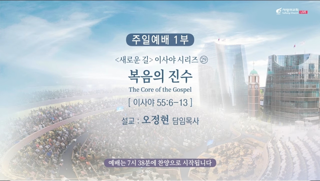 ♣주일예배(주후 2025년 11월 16일)-새로운 길(이사야 시리즈 ㉙) 제목; "복음의 진수“-The core of the Gospel 말씀: 이사야 55:6-13 찬양인도: 쉐키나(이 다니엘 부목사님), 영광찬양대 대표기도: 전승현 부목사님(1부) 사회: 임병영 부목사님(1부) 설교자: 오정현 담임목사님 ----- *이사야 55:6-13, 6 너희는 여호와를 만날 만한 때에 찾으라 가까이 계실 때에 그를 부르라. 7 악인은 그의 길을, 불의한 자는 그의 생각을 버리고 여호와께로 돌아오라 그리하면 그가 긍휼히 여기시리라 우리 하나님께로 돌아오라 그가 너그럽게 용서하시리라. 8 이는 내 생각이 너희의 생각과 다르며 내 길은 너희의 길과 다름이니라 여호와의 말씀이니라. 9 이는 하늘이 땅보다 높음 같이 내 길은 너희의 길보다 높으며 내 생각은 너희의 생각보다 높음이니라. 10 이는 비와 눈이 하늘로부터 내려서 그리로 되돌아가지 아니하고 땅을 적셔서 소출이 나게 하며 싹이 나게 하여 파종하는 자에게는 종자를 주며 먹는 자에게는 양식을 줌과 같이. 11 내 입에서 나가는 말도 이와 같이 헛되이 내게로 되돌아오지 아니하고 나의 기뻐하는 뜻을 이루며 내가 보낸 일에 형통함이니라. 12 너희는 기쁨으로 나아가며 평안히 인도함을 받을 것이요 산들과 언덕들이 너희 앞에서 노래를 발하고 들의 모든 나무가 손뼉을 칠 것이며. 13 잣나무는 가시나무를 대신하여 나며 화석류는 찔레를 대신하여 날 것이라 이것이 여호와의 기념이 되며 영영한 표징이 되어 끊어지지 아니하리. ----- ▶찬양대가 고백한 대로 한 분, 한 분 성령의 기름 부으심을 통하여 하늘의 영광을 체험하는 은혜가 있기를 바랍니다. 오늘 저는 ‘복음의 진수’란 제목으로 말씀을 드릴 텐데, 오늘 복음의 능력, 또 복음의 은혜, 복음의 기쁨 감사가 넘치는 그 체험되는 시간 되기를 바랍니다. 우리는 지난 한 주간 동안 새생명축제를 했습니다. 인생 10월을 보내고 그 수고 가운데서도 복음 선포에 대한 그 열정에 집중해 가지고 작년도 보다도 더 많은 분들이 결신을 했습니다. 놀랍고도 감사한 일입니다. 은혜 게시판에 보니까? 이번 2025년 새생명축제 프로그램을 대해서 너무 귀하고 특별하고 훌륭했다. 그러면서 ‘설교 말씀이나 간증이 어찌 그리 금은보화 같은지요. 구원의 핵심이 녹아 있습니다. 저도 여러번 대풀리에서 듣고 친구들에게도 소개할 예정입니다.’ 근데 이 그 집사님의 마음이 우리의 마음이에요. 그리고 오늘 이사야 55장이 본문은 ‘복음의 진수’에 대해서 아주 깊이와 풍성함이 담겨 있습니다. 그러니까? 오늘 복음의 진수에 대해서 한 명도 예 없이 다. 체험하고 돌아가기를 바랍니다. 먼저 그럼 ‘복음의 진수’의 출발이 어디일까? 이 진수(Core)란 말은 코어라는 말 핵심인데, 복음의 핵심의 출발이 뭐냐? 주님의 간절한 초청이 출발이다. I. 첫째, 복음의 진수의 출발은 주님의 간절한 초청이다. 오늘 1절에 보니까? 제가 본문을 이렇게 너무 길어 가지고 6절부터 13절까지 여러분들 봉독했습니다만은 1절부터인데 1절에 뭐라고 나와 있냐면 이렇게 나와 있습니다. *이사야 55:1, 1 오호라 너희 모든 목마른 자들아 물로 나아오라 돈 없는 자도 오라 너희는 와서 사 먹되 돈 없이, 값 없이 와서 포도주와 젖을 사라. -오라라는 단어가 세 번 나와 있어요. 오라, 영어로는 come 이라는 단어인데, 이라는 단어를 세 번이나 사용했어요. 오라. 오라 오라 2절에 보니까? 2 너희가 어찌하여 양식이 아닌 것을 위하여 은을 달아 주며 배부르게 하지 못할 것을 위하여 수고하느냐 내게 듣고 들을지어다 그리하면 너희가 좋은 것을 먹을 것이며 너희 자신들이 기름진 것으로 즐거움을 얻으리라. -듣고 들을지어다. 옛날에는 개혁판에서는 청종하라. 이렇게 나와 있습니다. 그다음에 3절에 보니까, 3 너희는 귀를 기울이고 내게로 나아와 들으라 그리하면 너희의 영혼이 살리라 내가 너희를 위하여 영원한 언약을 맺으리니 곧 다윗에게 허락한 확실한 은혜이니라. -그리고 6절에 보니까, 6 너희는 여호와를 만날 만한 때에 찾으라 가까이 계실 때에 그를 부르라. 7 악인은 그의 길을, 불의한 자는 그의 생각을 버리고 여호와께로 돌아오라 그리하면 그가 긍휼히 여기시리라 우리 하나님께로 돌아오라 그가 너그럽게 용서하시리라. -그러니까? 주님의 어떤 간절한 심정이 여러분들에게 이렇게 느껴질 것입니다. 간절한 심 그런데다가 올라를 초청할 뿐만 아니라 2절에 보니까? 이렇게 나와 있습니다. *이사야 55:2, 2 너희가 어찌하여 양식이 아닌 것을 위하여 은을 달아 주며 배부르게 하지 못할 것을 위하여 수고하느냐 내게 듣고 들을지어다 그리하면 너희가 좋은 것을 먹을 것이며 너희 자신들이 기름진 것으로 즐거움을 얻으리라 -그러니까 왜 가장 중요한 인생의 생명을 쓸데없는 것과 무가치한 것과 공허한 것과 바꾸려고 하느냐? 그게 진정한 충만함도 없고 그게 가짜 행복인데 그게 인생을 낭비하지 말라고 주님은 질타하시는 것이에요. 그게 인생을 낭비하지 말라고 쥠은 질타하시는 것이에요. 그리고 안타까운 심령을 가지고 계속 초대를 하시는데, 어떻게 초대를 하시는가? 초청 대상자들을 잘 봐야 돼요. 1절