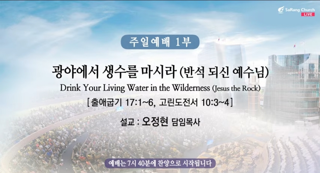 ♣주일예배(주후 2024년 02월 18일)-예수님은 누구신가? 세 번째 시리즈. 제목: "광야에서 생수를 마셔라"(반석 되신 예수님) -Drink your living water in the wilderness(Jesus The Rock) 말씀: 출애굽기 17:1~6, 고린도전서 10:3~4 찬양인도: 쉐키나(이 다니엘 부목사님), 영광찬양대 대표기도: 홍진기 부목사님(1부) 사회: 임병영 부목사님(1부) 설교자: 오정현 담임목사님 ㅡㅡㅡㅡㅡ *출애굽기 17:1~6, 1 이스라엘 자손의 온 회중이 여호와의 명령대로 신 광야에서 떠나 그 노정대로 행하여 르비딤에 장막을 쳤으나 백성이 마실 물이 없는지라. 2 백성이 모세와 다투어 이르되 우리에게 물을 주어 마시게 하라 모세가 그들에게 이르되 너희가 어찌하여 나와 다투느냐 너희가 어찌하여 여호와를 시험하느냐. 3 거기서 백성이 목이 말라 물을 찾으매 그들이 모세에게 대하여 원망하여 이르되 당신이 어찌하여 우리를 애굽에서 인도해 내어서 우리와 우리 자녀와 우리 가축이 목말라 죽게 하느냐. 4 모세가 여호와께 부르짖어 이르되 내가 이 백성에게 어떻게 하리이까 그들이 조금 있으면 내게 돌을 던지겠나이다. 5 여호와께서 모세에게 이르시되 백성 앞을 지나서 이스라엘 장로들을 데리고 나일 강을 치던 네 지팡이를 손에 잡고 가라. 6 내가 호렙 산에 있는 그 반석 위 거기서 네 앞에 서리니 너는 그 반석을 치라 그것에서 물이 나오리니 백성이 마시리라 모세가 이스라엘 장로들의 목전에서 그대로 행하니라. *고린도전서 10:3~4, 3 다 같은 신령한 음식을 먹으며. 4 다 같은 신령한 음료를 마셨으니 이는 그들을 따르는 신령한 반석으로부터 마셨으매 그 반석은 곧 그리스도시라. ----- ▶여러 회중 찬송을 하는데 ‘만세 반석이 열린 곳에 내가 숨어 있으니, 원수마귀 손 못 대고 환난 풍파 없도다.’!~ 만세 반석이 열린 곳에 나의 반석 구주 예수 나를 숨겨 주십시오.!~~ 몇 분들 보니까 울면서 부르시네요. 여러분 오늘 반석 대신 주님께서 오늘 응답하시고 더 필요한 말씀 꼭 허락해 주시기를 바랍니다. 제가 개척교회 할 때는요. 설교하기 전에 이러면 그냥 찬송해요. 그냥 우리도 할까요? 말씀한 1절만 더 하겠습니다. ♬~만세반석 열린 곳에... 1 만세반석 열린 곳에 내가 숨어 있으니 원수 마귀 손 못 대고 환난 풍파 없도다. 2 죄에 매여 죽을 인생 편히 쉬기 바라니 주의 가슴 넓은 품에 내가 찾아 안기네. 3 이 땅 위에 평안 없고 기쁜 일을 몰라도 주예수의 참사랑을 내가 이제 알았네. 4 험한 풍파 지나도록 순풍으로 도우 사 평화로운 피난처에 길이 살게 하소서. 후렴) 만세반석 열린 곳에 내가 편히 쉬리니 나의 반석 구주예수 나를 숨겨 주소서. 아멘!~ -그대로 되기를 바랍니다. 제가 지금 ‘예수님은 누구신가?’ 시리즈 오늘 세 번째 “광야에서 생수를 마시라.” 부제는 ‘반석 되신 예수 그리스도’ 오늘 이 말씀을 통하여 특별히 말씀 자체를 통하여 여러분과 저의 영안이 열리기를 간절히 소망합니다. 제가 계속해서 3주 동안 구약의 본문과 또 신약의 해석이라고 말할 수 있어요. 구약의 본문과 신약의 해석 신약은 구약의 해설서다. 이렇게도 말할 수 있도록 그래서 제가 구약과 신약을, 신약을 같이 하고 있는데 여러분 성경은 신구약으로 나누어져 있지만 한문입니다. 맞습니까? 66권이지만 한 권입니다. 하나의 메시지 하나의 복음 하나의 계시가 되는 것입니다. 그래서 우리가 우리 복음주의 권에서 우리 개혁주의 권에서는 늘 이렇게 얘기합니다. 구약은 시작, 신약의 시작 신약은 구약에 감추어져 있고, 구약은 아멘 그래서 구약은 신약을 미리 표하고 예언하는 것이기 때문에 구약에 더 깊이 들어갈수록 신약을 더 잘 깨닫는 은혜가 있는 것입니다. 따라서 구약을 제대로 깨달으면 구약 안에서 예수님의 음성을 지금 들을 수 있는 것이에요. 출애굽기 17장에서 주님의 음성을 듣는 거예요. 부활하신 주님의 음성을 오늘 구약의 본문에서 듣기를 바라는 것입니다. 본문을 해석합니다. 오늘 본문은 이스라엘 백성들이 출애굽에서 홍해를 건넌 이후에 시내 산을 향하여 가는 도중 일어난 사건이에요. 앞에 17장 앞에 17장 앞에는 몇 장이에요? 그것도 해석이 안 됩니까? 16장에 16장 1절에 보니까 애굽에서 나온 후 둘째 달 언제예요? *출애굽기 16:1, 1 이스라엘 자손의 온 회중이 엘림에서 떠나 엘림과 시내 산 사이에 있는 신 광야에 이르니 애굽에서 나온 후 둘째 달 십오일이라. -이스라엘 백성이 애굽에서 나온 지 한 6주쯤 됐어요. 6주, 그래서 르비딤 이라는 곳에 하나님께 ‘르비딤’으로 인도하셨어요. 그러니까 홍해의 기적을 체험한 지 얼마 안 되어서 이 사건이 일어난 것입니다. 예를 들어서 이스라엘이 홍해를 건너는 엄청난 은혜를 받았는데 그 은혜가 앞에 또 마라의 선물이 있는데요. 3일을 못 갔어요. 사일을 여기서 제가 깨닫는 것이 뭐냐 하면 은혜의 유통기간이 3일밖에 안 돼요. 홍해의 기적 같은 사건을 체험했으면서도 3일 후에 불평하기 시작한 것이에요. 홍해를 지나면 그 이유는 홍해를 지나면 이제는 다 고생 끝, 이렇게 이제 편안함 시장 이렇게 될 줄 알았어요. 홍해를 지나면 더 좋은 환경이 기다리고 있을 줄 알았는데 뭐가 기다리
