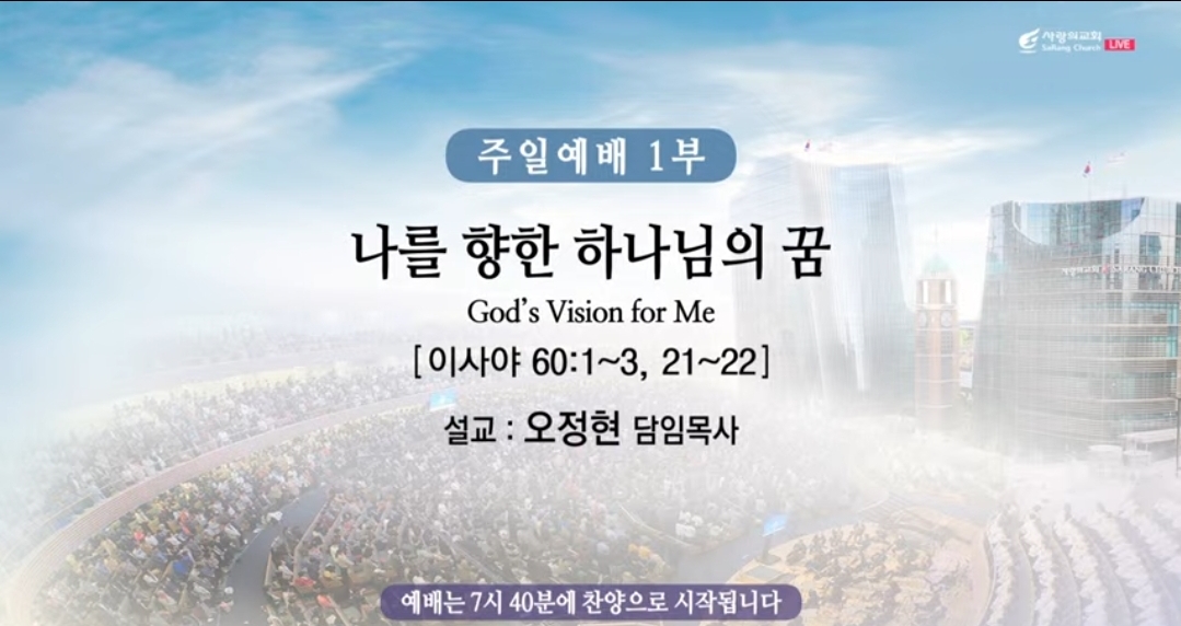 -정말 이사 60장의 서두와 마무리는 영광스러운 말씀이에요. 어떻게 보면 독보적인 계신 말씀입니다. 이 말씀은 당시에 이스라엘과 예루살렘을 향한 명령이자 또 오늘 한국 교회 또 하나의 백성들 또 사랑의 교회 선두들 한 분, 한 분에게 하시는 말씀이라고 믿으셔야 합니다.