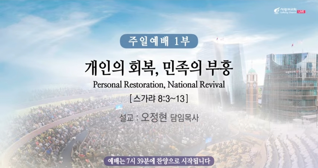 ♣주일예배(주후 2024년 10월 13일) 제목: "개인의 회복, 민족의 부흥" 말씀: 스가랴 8:3-13 찬양인도: 쉐키나(이 다니엘 부목사님), 영광찬양대(1부) 대표기도: 홍성민 부목사님 사회: 임병영 부목사님(1부) 설교자: 오정현 담임목사님 ----- *스가랴 8:3-13, 1 만군의 여호와의 말씀이 임하여 이르시되. 2 만군의 여호와가 이같이 말하노라 내가 시온을 위하여 크게 질투하며 그를 위하여 크게 분노함으로 질투하노라. 3 여호와가 이같이 말하노라 내가 시온에 돌아와 예루살렘 가운데에 거하리니 예루살렘은 진리의 성읍이라 일컫겠고 만군의 여호와의 산은 성산이라 일컫게 되리라. 4 만군의 여호와가 이같이 말하노라 예루살렘 길거리에 늙은 남자들과 늙은 여자들이 다시 앉을 것이라 다 나이가 많으므로 저마다 손에 지팡이를 잡을 것이요. 5 그 성읍 거리에 소년과 소녀들이 가득하여 거기에서 뛰놀리라. 6 만군의 여호와 이같이 말하노라 이 일이 그 날에 남은 백성의 눈에는 기이하려니와 내 눈에야 어찌 기이하겠느냐 만군의 여호와의 말이니라. 7 만군의 여호와가 이같이 말하노라 보라, 내가 내 백성을 해가 뜨는 땅과 해가 지는 땅에서부터 구원하여 내고. 8 인도하여다가 예루살렘 가운데에 거주하게 하리니 그들은 내 백성이 되고 나는 진리와 공의로 그들의 하나님이 되리라. 9 만군의 여호와가 이같이 말하노라 만군의 여호와의 집 곧 성전을 건축하려고 그 지대를 쌓던 날에 있었던 선지자들의 입의 말을 이 날에 듣는 너희는 손을 견고히 할지어다. 10 이 날 전에는 사람도 삯을 얻지 못하였고 짐승도 삯을 받지 못하였으며 사람이 원수로 말미암아 평안히 출입하지 못하였으니 내가 모든 사람을 풀어 서로 치게 하였느니라. 11 만군의 여호와의 말씀이니라 이제는 내가 이 남은 백성을 대하기를 옛날과 같이 아니할 것인즉. 12 곧 평강의 씨앗을 얻을 것이라 포도나무가 열매를 맺으며 땅이 산물을 내며 하늘은 이슬을 내리리니 내가 이 남은 백성으로 이 모든 것을 누리게 하리라. 13 유다 족속아, 이스라엘 족속아, 너희가 이방인 가운데에서 저주가 되었었으나 이제는 내가 너희를 구원하여 너희가 복이 되게 하리니 두려워하지 말지니라 손을 견고히 할지니라. ---- ▶대한민국의 지난 70년의 역사는 기적의 역사였습니다. 어떤 역사였다고요. 기적의 역사였습니다. 2차 세계대전 이후에 원조 받는 나라의 나라들 가운데서 유일하게 지금 저희들이 다른 나라를 이렇게 지원하는 우리가 수혜국에서 지원국으로 바뀌게 되었습니다. 너무나 놀라운 기적의 역사였고 특별한 하나님의 은혜였습니다. 하나님의 특이 크신 섭리가 있었고, 한국 교회 그리스도인들에 최선을 다한 기도가 큰 뒷받침을 했다고 확신합니다. 그러나 현재 우리의 형편은 우리의 머리에는 제가 요번에 그런 표현을 좀 했는데. 우리의 머리에는 핵을 이고 있고, 북한에 저 말도 안 되는 공간을 치는 핵을 이고 있고, 우리의 등에는 수천 조의 가계 빚을 지고 있고, 그다음에 우리 허리에는 허리가 끊어져서 출생률이 아주 힘든 이런 형편에 처해있습니다. 이런 상황을 앞에 놓고 사랑의 교회는 지난 8월 달에 청계산으로 수천 명이 올라가 가지고 산에 올라갔고 주여 우리 민족을 살려주시옵소서!! 그렇게 기도 하고 또 이제 내일부터 있을 특새,- 특별 새벽 부흥회, 또 10월 21일, 22일 있을 우리 한국 교회 8천명의 목회자 성김의 날, 그리고 중요한 10월 27일 날, ‘한국 교회 200만 연합여배와 큰 기도회’를 앞에 놓았습니다. 놓고 저는 마치 무슨 마음인가 하면 지난 1주간 동안 의성들과 함께 금식 기도를 하면서, 하나님 우리 힘으로는 안 되오니 마치 여호사밧이 모압과 암몬과 마온의 큰 대군이 쳐들어왔을 때에, 무슨 다른 무슨 계획이 없고 다른 무슨 어떤 방법이 없어 가지고 찬양대 앞세우고 그리고 여호사밧이 고백합니다. “주님 오직 주만 바라보나이다.” 그래서 오늘 이 예배를 통하여 오직 주님만 바라보기를 원합니다. 세상의 모든 복잡한 마음의 창문들을 다 닫아 걸고 부활하신 주님 말씀하신 주님을 바라보기를 원하는 것입니다. 그래서 무슨 해결 방법이 없나 한국에 지금 이 해결 방법이 없을까? 그 해결방법을 오늘 말씀 제목을 ‘개인의 회복이 민족의 부흥’을 가져야만 하는 것입니다. 그러니까 펄스널 레스트레이션(Personal Restoration)이 내셔널 리바이벌(National Revival)로 가야 되는 거에요. 그래서 오늘 이것이 여러분들에게 해결 방법이 되기를 바랍니다. 그리고 이 해결 방법은 제 말이 아니라, 오늘 하나님의 말씀에 의거한 해결 방법이 돼야 하는 것이에요. 오늘 본문에 계속해서 ‘만군의 여호와가 말하노라. 하나님이 말씀하시노라.’ 이 말씀은 이 말씀은 오늘 우리에게 지난 수천 년 동안 변함이 없는 하나님의 언약의 말씀인 줄로 확신하는 것이에요. 그 제가 물어보겠습니다. 사랑하는 형제자매 여러분, 우리는 누구의 백성입니까? 하나님의 백성이죠. 그런데 조금 더 정확하게 말하면 하나님의 언약의 백성인 것입니다. 그래서 저는 유아세례를 줄 때도 우리 아이들이 언약의 자손들이라고, 그리고 제가 오죽하면 우리 교회에 우리 건축할 