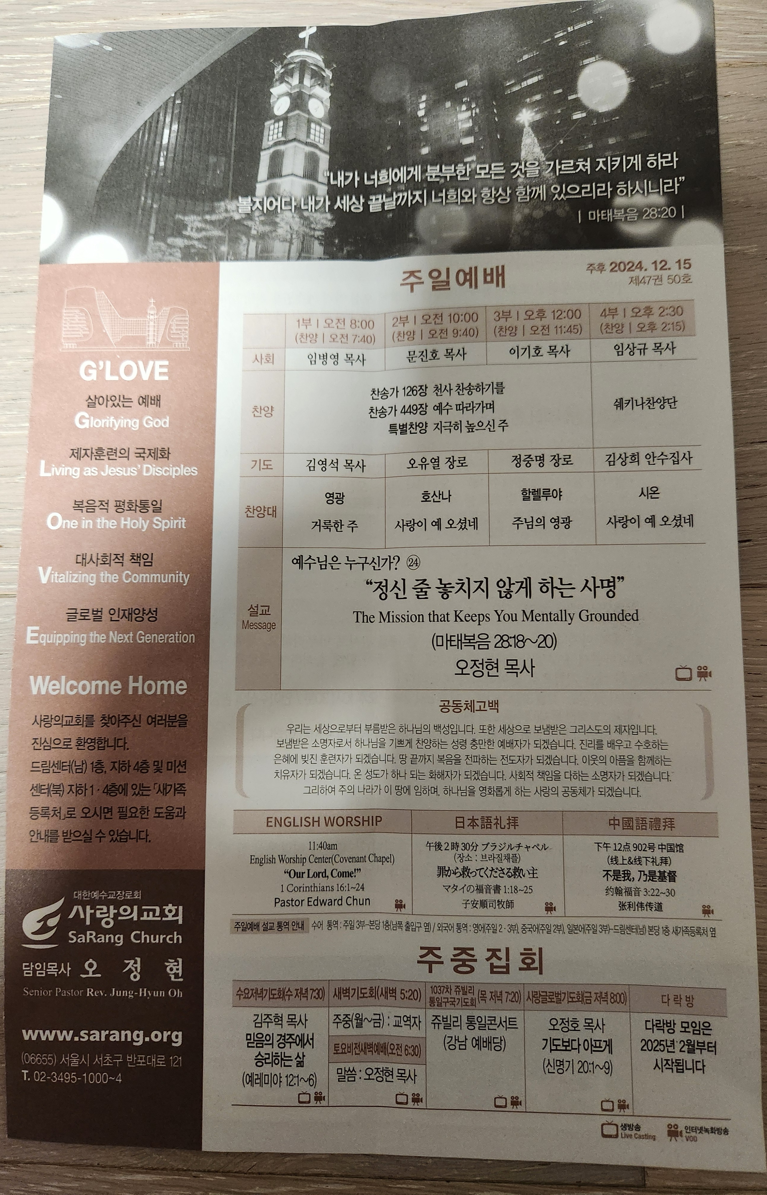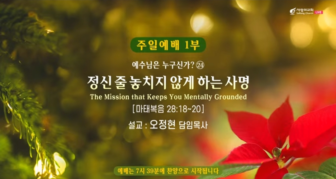 ♣주일예배(주후 2024년 12월 15일) 제목: "정신 줄 놓치지 않는 사명(The Mission that Keeps You Mentally Grounded) -"예수님은 누구신가? 24번째 말씀: 마태복음 28:18-20 대표기도: 김영석 부목사님(1부) 찬양인도: 쉐키나(이 다니엘 부목사님), 영광찬양대(1부) 사회: 임병영 부목사님(1부) 설교자: 오정현 담임목사님 ----- *마태복음 28:18-20, 18 예수께서 나아와 일러 가라사대 하늘과 땅의 모든 권세를 내게 주셨으니. 19 그러므로 너희는 가서 모든 족속으로 제자를 삼아 아버지와 아들과 성령의 이름으로 세례를 주고. 20 내가 너희에게 분부한 모든 것을 가르쳐 지키게 하라 볼찌어다 내가 세상 끝날까지 너희와 항상 함께 있으리라 하시니라. ----- ▶우리 정성으로 준비한 찬양대의 찬양을 주님이 기뻐받으신 줄로 확신합니다. 제가 지금 우리 예수님은 누구신가? 시리즈 하고 있는데, 이제 2번 정도 남았습니다. 지난주는 ‘교회를 붙잡고 계시는 예수님’ 기억이 나십니까? 자 뭘 붙잡고 계신다고요? ‘교회를 붙잡고 계신다.’ 오늘은 우리에게 ‘대 사명을 주시는 예수님’ 그래서 부제로 제가 제목을 주제는 대사명을 주시는 예수님인데 오늘 설교 제목을 ‘정신 줄을 놓치지 않는 사명’에 대해서 근데 제가 제목을 붙여놓고도 이거 좀 과한 게 아닌가? 과한 게 아닌가, 그런데 앞 예배 마치고 어떤 분들이 목사님 딱 맞는 제목이라고 그래서 위로를 제가 받았습니다. 받았는데 지금 참 마음 지키기가 쉽지 않습니다. 그리고 나라의 모든 상황도 그러고 우리의 삶의 여정도 그러고, 우리가 깨어 있기가 쉽지 않습니다. 오늘 이 말씀이 우리의 마음을 지키는 또 우리의 어떤 사역에 인생에 또 사명에 심을 오늘 좀 이렇게 내 것으로 꽉 붙잡을 수 있도록 은혜주시길 바랍니다. 마음 지키기가 쉽지 않은 이유는 삶은 수고입니다. 인생은 수고입니다. 어떤 분들은 인생은 삶은 계란이라고 그럽니다. 옛날 좀 그런 거 있잖아요. 옛날 유머인데,,, 물이 영어로 뭐냐? 물은 셀프다. 그럽니다. 그러면 또 군만두는 영어로 뭐냐? 서비스다. 그런 얘기합니다. 제가 오늘 하도 답답하니까 제가 이런 얘기를 합니다. 저희는 평소에 잘 안 하잖아요. 안 하는데, 하여튼 우리가 정신 바짝 차리고 오늘 주님께 주신 음성을 듣기를 바랍니다. 삶이 왜 수고냐? 무엇에도 그런 얘기 했잖아요? 인생은 참 수고와 슬픔 뿐이다. 개인적으로도 제가 지난 며칠 전에 우리 우리가 살아가는 참 우리 교회 목사님 같은 하영록 목사님, 우리 여기 말씀 전하고 10월 달에 특새하시고 난 다음에 미국 가서 지금 갑자기 심장이 정지가 와가지고 그래서 이제는 더 이상 어떻게 코마 상태 산소 호흡기로만 연명하셔서, 이제는 이 고통을 이제 정리해야 되겠다고, 우리 손 사모님이 이 산소 호흡기 떼기 전에 내가 목사님한테 먼저 전화해야 되겠다고 제가 그 얘기를 그저께 듣는데, 내가 아!!! 정말 인생이 정말 먹먹하구나!!! 그 가족들을 위해서 기도도 하고 그렇습니다. 삶이란 게요 이게 정말 이게 수고입니다. 민족적으로도 국가도 마찬가지입니다. 지금 나라가 되어 가는 사태에 대해서 성도들끼리도 심지어 집안에서도 생각이 다른 분들이 많습니다. 근데 오늘 이 사태를 여러분, 우리나라의 사태를 겉으로만 드러나는 현상으로 보면 안 됩니다. 이게 영적인 문제입니다. 그러니까 우리가 지금 정신 바짝 차리고 주여, 이 나라를 생명 싸개로 보호하여 주옵소서. 그리고 이 나라는 하나님의 절대 주권 아래에 있을 줄로 믿습니다. 그리고 오늘 이 말씀 듣고 여러분 잘 적용하면, 하나님이 이 나라의 수많은 난제들을 한꺼번에 홍해를 건너듯이 주님이 해결해 주실 것입니다. 예, 믿음입니다. 그리고 여러분 인생은 인생도 어렵고 나라도 어렵지만 사실 우리가 이 땅을 살아가면서 우리의 인생 우리 영적으로 볼 때에 우리들의 본래 우리 영적인 주소와 그리스도인들의 영적인 주소는 땅입니까? 하늘입니까? 우리의 영적 본석이 어디예요. 하늘나라에요. 헤븐, 더 헤븐(The Christian's address is heaven). 홈 애드레스Home address), 그리스도인들의 본래의 주소는 천국입니다. 우리의 본적이 천국입니다. 그래서 천국시민의 라이프스타일이 있어요. 저는 어릴 때 지방에 있다. 서울로 올라와 가지고 18살에 올라와서 저는 뭐 이 신앙적인 어떤 그런 흐름에 쭉 살다가 와 가지고 와 서울 사람 깍쟁이들이에요. 여기는 보니까 앞뒤를 다 살피고 그러더라고요. 아 그러면서 야 인생이 이거 만만하지 않구나! 그리고 자취할 때 혼자 집에 들어가면요 야 타향살이 몇 해던가 손꼽아 헤어보니... 그리고 해는 져서 어두운데 찾아오는 사람 없고 혼자 들어가는데 밝은 달만 쳐다보니 눈물만 흐른다고 눈물 뚝 떨어뜨리고... 이게 뭐냐 하면 지방에서 서울 올라오는데도 이게 맞지가 않는 거에요. 이게 이게 이 라이프 스타일이... 그런데 우리가 우리의 주소는 우리의 주소가 천국 주소예요. 우리는 그리스도인들이라고요. 그런데 세상적인 가치관하고 잘 맞지가 않아요. 우리는 늘 정치, 경제, 사회, 문화, 교육 이런 사회에서 살아가면서 진짜 그리스도인들이 삶의 현장에서 수많은 부딪힘과 가치관과 기독교 가치로 