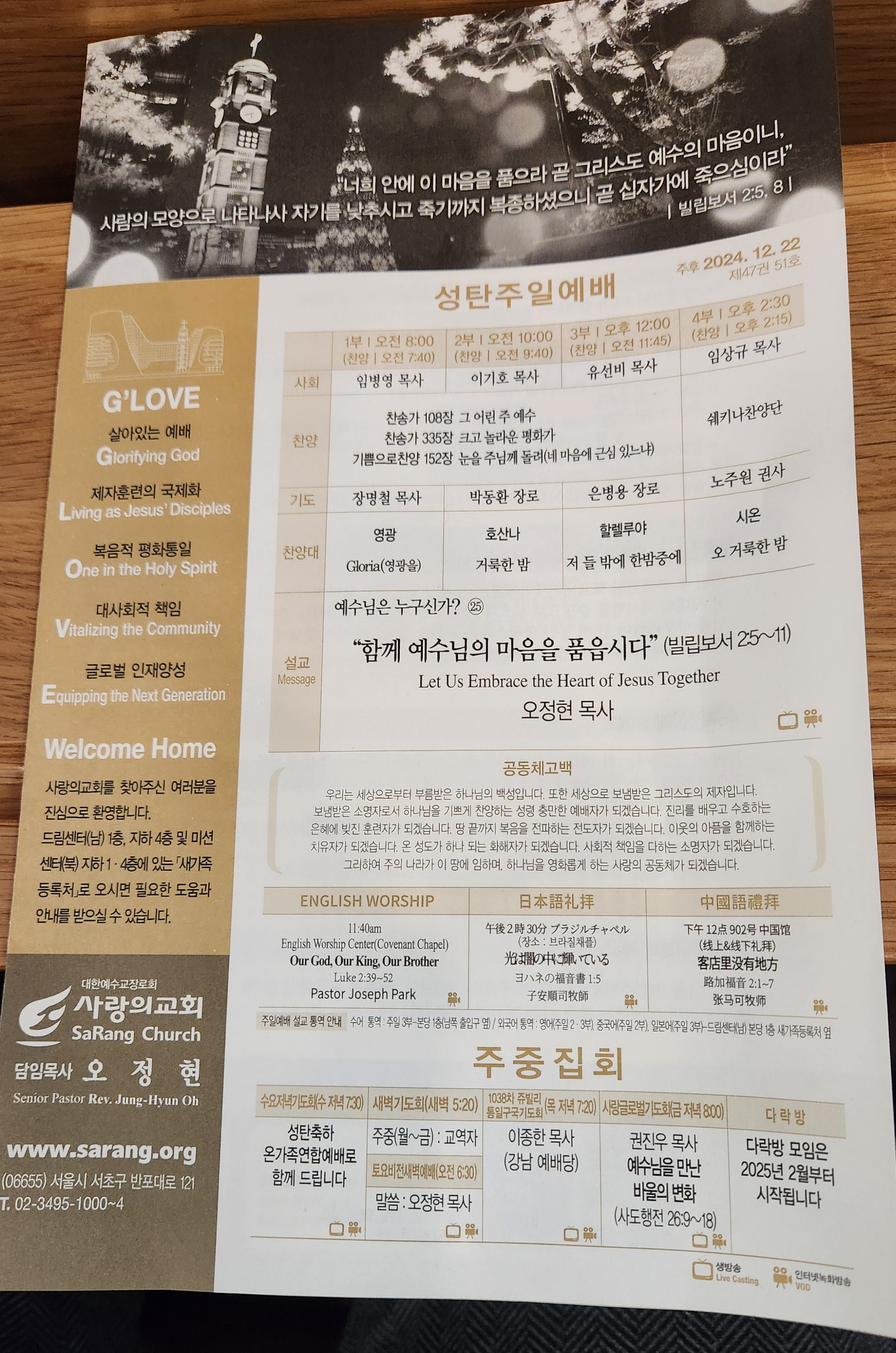 ♣주일예배(주후 2024년 12월 22일) 제목: "함께 예수님의 마음을 품읍시다"-예수님은 누구신가?25번째 말씀: 빌립보서 2:5:11 대표기도: 장명철 부목사님 찬양인도: 쉐키나(이 다니엘 부목사님), 영광찬양대 사회: 임병영 부목사님 설교자: 오정현 담임목사님 ---- * 빌립보서 2:5:11, 5 너희 안에 이 마음을 품으라 곧 그리스도 예수의 마음이니. 6 그는 근본 하나님의 본체시나 하나님과 동등됨을 취할 것으로 여기지 아니하시고. 7 오히려 자기를 비어 종의 형체를 가져 사람들과 같이 되었고. 8 사람의 모양으로 나타나셨으매 자기를 낮추시고 죽기까지 복종하셨으니 곧 십자가에 죽으심이라. 9 이러므로 하나님이 그를 지극히 높여 모든 이름 위에 뛰어난 이름을 주사. 10 하늘에 있는 자들과 땅에 있는 자들과 땅 아래 있는 자들로 모든 무릎을 예수의 이름에 꿇게 하시고. 11 모든 입으로 예수 그리스도를 주라 시인하여 하나님 아버지께 영광을 돌리게 하셨느니라. ---- ▶귀한 성탄 주일을 허락하신 주님을 찬양합니다. 어제 새벽에 저희 교회는 성탄 주일 바로 직전 토요 새벽 예배는 토요 새벽송 예배라고 해서 했는데 어제 새벽에 유치부 아이들이 230명이 나가지고 이렇게 합창을 하는데요. 예뻐 죽겠어요. 너무너무 예뻤어요. 저는 그렇게 생각합니다. 아이들이 성탄에 대한 아름다운 기억이 있고 성탄 예배의 따뜻함을 경험한 사람은 은혜의 주류에서 벗어나지 아니하고 우리 아이들도 평생 그 기억을 하면서 살아가는 가운데 이상한 판단 이상한 행동 신앙에 헛발질을 하지 않을 것입니다. 저는 오늘 함께 “예수님의 마음을 품으십시다” 라는 제목으로 이제 예수님 시리즈 딱 하나 남았습니다. 다음 줄 마지막 남았는데 오늘 이 말씀을 통하여 모두가 다 예수님의 마음을 품었으면 좋겠어요. 예수님의 어릴 때 배웠어요. 예수님의 마음은 고요한 연못~~ 알 사람만 알도다. 주님의 마음을 본받는 자 내 마음의 평강이 찾아옴은~~ 정말 주님의 마음, 오늘 이 메시지가 수많은 갈등과 고통을 멈추게 하는 하나님이 주신 메시지를 믿습니다. 그래서 오늘 이 말씀의 본문은 빌립소서 2장 5절부터 11절 이 본문을 여러분들 봉독하셨는데 이 말씀은 성경 말씀 가운데 정말 원터풀한 말씀이에요. 예수님의 성육신에 대해서 여러 군데가 나오지만 말씀의 봉우리들이 있잖아요. 좀 이렇게 다 말씀이 귀하지만 말씀의 봉우리도 예를 들어서 우면산 정도의 높이가 있다. 혹은 뭐 설악산 정도의 높이가 있다. 그런다면 오늘 이 본문은요, 예수님의 성욕심과 예수님의 겸손과 낮아지심에 대해서 알프스의 연봉이요. 에베레스트의 최고의 고봉중에 하나라고 말씀할 수가 있는 것입니다. 놀라운말씀 그래서 장엄한 말씀입니다. 핵심은 이것입니다. 어떻게 영원하신 하나님 스스로 계신 하나님, 창조주로서 영존하신 하나님께서 인간의 몸을 입고 오셔가지고, 시간을 초월하셔서 역사 속으로 들어오셨는지 하나님의 놀라운 마스터플랜을 우리에게 보여주시는 것입니다. 당시 로마 제국의 산하이에 조그만 도시 빌립보 성도들에게 보낸 이 짧고도 소박한 이 서신서 속에 빌립보 속에서 우리 인간이 상상할 수 없는 아주 그냥 깊고도 영광스러운 진리가 포함되어 있는 것입니다. 그래서 이 본문은 조직신학적으로도 놀랍고 또 우리 기동론이라고 하는데 예수 그리스도에 관해서 크리스톨라지, 기동론에 관한 최고의 봉이 될 수가 있는 것입니다. 그리고 오늘 이 말씀이 저와 여러분에게 무슨 의미가 있겠는가? 오늘 이 땅에 있는 우리들에게 무슨 관계가 있겠는가? 그걸 살펴볼 때에 그 당대의 현실은 그때 1차 수신자였던 빌립보 교회 오늘 특별히 유오디아와 순도교라는 요즘 우리 식으로 말하면 그 당시에 권사님들이 그 교회 중직 권사님들이 서로 다투고 충돌하고 파당을 짓고 갈등을 일으키고 있었어요. 그래서 권사님들 스토리예요. 그냥 거기에 대한 답을 주시고자 이 말씀을 오늘 선포하고 있습니다. 그리고 우리 신앙생활의 중요한 원칙 중에 하나가 하나됨인데, 성령 안에서 하나됨인데 하나됨을 위한 최고의 비밀이 예수님의 낮아지심과 겸손한 것임을 표현하고 있는 것입니다. 사실 빌립보 교회도 다양한 어떤 배경을 갖고 있었죠. 빌립보 교회 성도들 가운데 빌리포 간수가 있었고, 예심이 있고 간수로부터 열심히 있고 또 자주장사 루디아라는 여성 사업가도 있었고, 귀신 들린 여종이었다가 귀신 들렸다가 회심해서 이렇게 변화된 그런 성도들도 있었고, 여러 종류의 다양한 배경을 갖고 있었습니다. 오늘 이 예배도 수많은 분들이 예배를 드리시는데 여러분 모두가 다양한 배경을 갖고 있잖아요. 근데 우리가 하나 된다. 이거 쉬운 일이 아닌데 오늘 그 일을 어떻게 해결할 수가 있겠는가? 그렇게 오늘 이제 본문의 배경이 되고 있습니다. 사실 갈등과 다툼이 있다는 것은 우리가 갈등 다툼의 어려움이 있다는 것은 가정적으로도 그렇고 모두가 다 자기의 프라이드, 자기 의, 자기 주장이 있다는 것이 조금 세게 나오면 교만이 있다는 것이에요. 오늘 이 말씀을 가지고 하나됨을 파괴하는 교만과 자기 의의를 오늘 이 말씀을 가지고 자기주장
