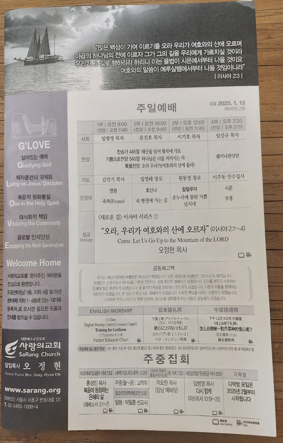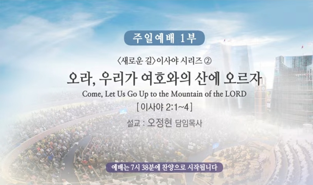 ▶여러분은 어느 산을 좋아하십니까? 가까이는 우리 우면산이 있고, 청계산이 있고 멀리는 우리 한라산이 있습니다만 오늘 우리가 여호와의 산에 오르기를 바랍니다. 이사야의 산에 올랐으면 좋겠습니다. 우리가 이사야에서 해석하는 것이 아니라, 이사야의 이 말씀이 우리의 삶을 해석할 수 있기를 바랍니다. 오늘 본당뿐만 아니라 별관 여러 별관에서 얘기해 드리는 모든 주의 종들, 방송으로 들어오시는 동일하게 이사야의 말씀이 오늘 우리 현실의 삶을 우리의 삶에 국가적인 여러 현상들도 충분히 해석해 주시기를 바랍니다. 잘 아시는 대로 이사야 이제 1장 끝나고 2장인데, 2장 1절은 이렇게 시작됩니다. 1장을 보겠습니다.
