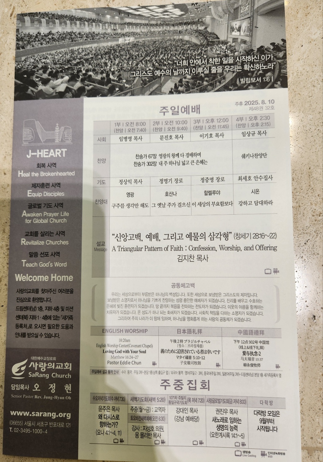 ☆ ♣주일예배(주후 2025년 8월 10일)"신앙고백, 예배, 그리고 예물의 삼각형"(김지찬 목사님(전 총신대 신학대학원 교수)-초빙)-사랑의 교회 ☆