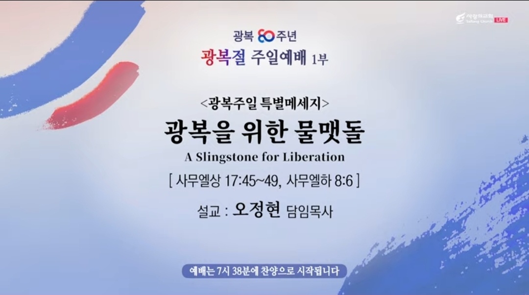 ♣주일예배(주후 2025년 8월 17일) 설교제목: 광복을 위한 물맷돌"(A Slingstone for Liberation) 성경본문: 사무엘상 17:45~49, 사무엘하 8:6 찬양인도: 쉐키나(이 다니엘 부목사님), 영광찬양대(1부) 대표기도: 장명철 부목사님(1부) 사회: 임병영 부목사님 헌금찬송: 테너 김요한 집사님 설교자:오정현 담임목사님 ---- *사무엘상 17:45~49, 45 다윗이 블레셋 사람에게 이르되 너는 칼과 창과 단창으로 내게 나아 오거니와 나는 만군의 여호와의 이름 곧 네가 모욕하는 이스라엘 군대의 하나님의 이름으로 네게 나아가노라. 46 오늘 여호와께서 너를 내 손에 넘기시리니 내가 너를 쳐서 네 목을 베고 블레셋 군대의 시체를 오늘 공중의 새와 땅의 들짐승에게 주어 온 땅으로 이스라엘에 하나님이 계신 줄 알게 하겠고. 47 또 여호와의 구원하심이 칼과 창에 있지 아니함을 이 무리에게 알게 하리라 전쟁은 여호와께 속한 것인즉 그가 너희를 우리 손에 넘기시리라. 48 블레셋 사람이 일어나 다윗에게로 마주 가까이 올 때에 다윗이 블레셋 사람을 향하여 빨리 달리며. 49 손을 주머니에 넣어 돌을 가지고 물매로 던져 블레셋 사람의 이마를 치매 돌이 그의 이마에 박히니 땅에 엎드러지니라. *사무엘하 8:6, 6 다윗이 다메섹 아람에 수비대를 두매 아람 사람이 다윗의 종이 되어 조공을 바치니라 다윗이 어디로 가든지 여호와께서 이기게 하시니라. ----- ▶자 오늘 아름답고 영광스러운 광복절인데 주님만의 높임을 받기를 바랍니다. 그리고 여러분들 이 자리에 주님 사모해 나오셨는데 아무도 그냥 돌아가지 마시기를 바라고 삶의 모든 우수사려 또 큰 삶의 모든 짐들이 벗겨지기를 소망합니다. 저는 오늘 광복 80주년을 맞이하여 광복절을 위한 다윗의 물맷돌이라는 제목으로 오늘 말씀을 전하겠습니다. 우리는 광복 70주년을 지났습니다. 그리고 80주년이 됐는데, 10년 전에 저희들이 큰 기대를 가지고 있었습니다. 뭐냐 하면 이스라엘 백성들이 바빌론에서 포로 몇 년 했죠? 70년 했죠. 70년 지나면 해방된 것처럼 대한민국도 남북이 분단됐는데, 70년이 지나면 하나님 무언가 은혜를 주실 줄 믿습니다. 하고 많이 기대를 했는데 낫띵 해픈,,, 뭐 무슨 일이 일어나지 않았어요. 그런데 오늘 80주년을 맞이하면서 제가 묵상하고 하는 가운데 마음의 소원이 생겼어요. 이 80이라는 숫자는 뭐 여러 가지 의미가 있지만 모세라는 하나님의 신실한 종에게는 80이 모세가 사명 받은 시간이었어요. 80세, 40세 미디안에 쫓겨가서 위대한 광야에 40년 있다가 80세 때 하나님과 소명을 떠 호렙 산의 떨기나무 가운데서 받았어요. 그리고 80세 받고 난 다음에 그가 시편 90편을 쓰면서 시편 90편 10절에, *시편 90:10, 10 우리의 연수가 칠십이요 강건하면 팔십이라도 그 연수의 자랑은 수고와 슬픔뿐이요 신속히 가니 우리가 날아가나이다. -무슨 말인가 하면 모세가 인생의 유한함도 얘기했지만, 더 중요한 것은 여러분 80살이 되면 자기 마음대로 못 삽니다. 80살이 되면, 하나님 의뢰해야 합니다. 제가 지금 좋은 말로 얘기하는 겁니다. 젊을 때는 뭐 힘이 있다고 그러지만 80이 넘으면 하나님 의뢰하지 않고는 살 수가 없어요. 그가 뭐 어느 학벌이 좋든 뭐 그가 재산이 크든 뭐 세상 적으로 대단하든, 80 넘으면 인간은 다 똑같아요. 하나님만을 전적으로 위탁해야 합니다. 마찬가지로, 제가 이 80주년을 하면서 제 마음의 소원이 하나님, 대한민국이 이제 하나님만을 전적으로 의탁하게 하여 주십시오. 대한민국의 이제 이 정치 경제 문화, 사회 이 수많은 어려운 난제(難題)들과 다른 길이 없습니다. 하나님만을 전적으로 위탁하오니 이 80주년이 의미가 있게 하여 주십시오. 의미가 있게 하여 주십시오. 오늘 80이라는 나이는 하나님이 도우심이 있어야 살아갈 수 있는 나이인데 여러분, 이 가운데 연세 드신 분들 제 말이 맞아요?. 틀려요? 나이가 젊어 갖고 대답을 할 수 없나요? 그래서 오늘 이 시간은 하나님을 전적으로 의지하면서 지금 말씀 안 드려도 대한민국이라는 정치 경제 문화 사회적 환경을 들어보면 하나님의 도우심이 없이는 대한민국은 하루도 견딜 수 없는 절박한 상황이 되었어요. 그래서 이 80주년을 맞이하면서 우리는 하나님의 초월적 개입과 초자연적인 은혜가 있기를 바라는 것입니다. 그리고 하나님의 초월적(超越的) 개입과 초자연(超自然)적인 은혜의 어떤 대표가 오늘 다윗의 물멘돌이라고 할 수 있습니다. 여러분, 이 본문을 여러분 다 안다고 생각하지만 어릴 때부터 주일학교 많이 알지만 다 안다고 생각하지 말고 마음의 눈을 열어 가지고 국가적으로도 여러분 개인적으로도 하나님의 초자연적인 개입이 있기를 바라는 것입니다. 마음의 간절(懇切)함에서 젊은 분들뿐만 아니라, 오늘 70 80이 넘은 분들도 이 말씀 때문에 가슴이 뛰시기를 바랍니다. 70~80 넘은 분들, 젊은 분들, 언제 가슴이 뛰어 보셨어요? 목사님 저는 가슴 뛸 일이 헬스장밖에 없습니다. 그러면 안되죠. 말씀을 들어야 가슴이 뜁니다. 오늘 본문의 사무엘하 8장 6절에 뭐라고 되어 있느냐, 이렇게 나와 있습니다. 다윗이 같이 보죠. *사무엘하 8:6, 6 다윗이 다메섹 아람에 수비대를 두매 아람 사람