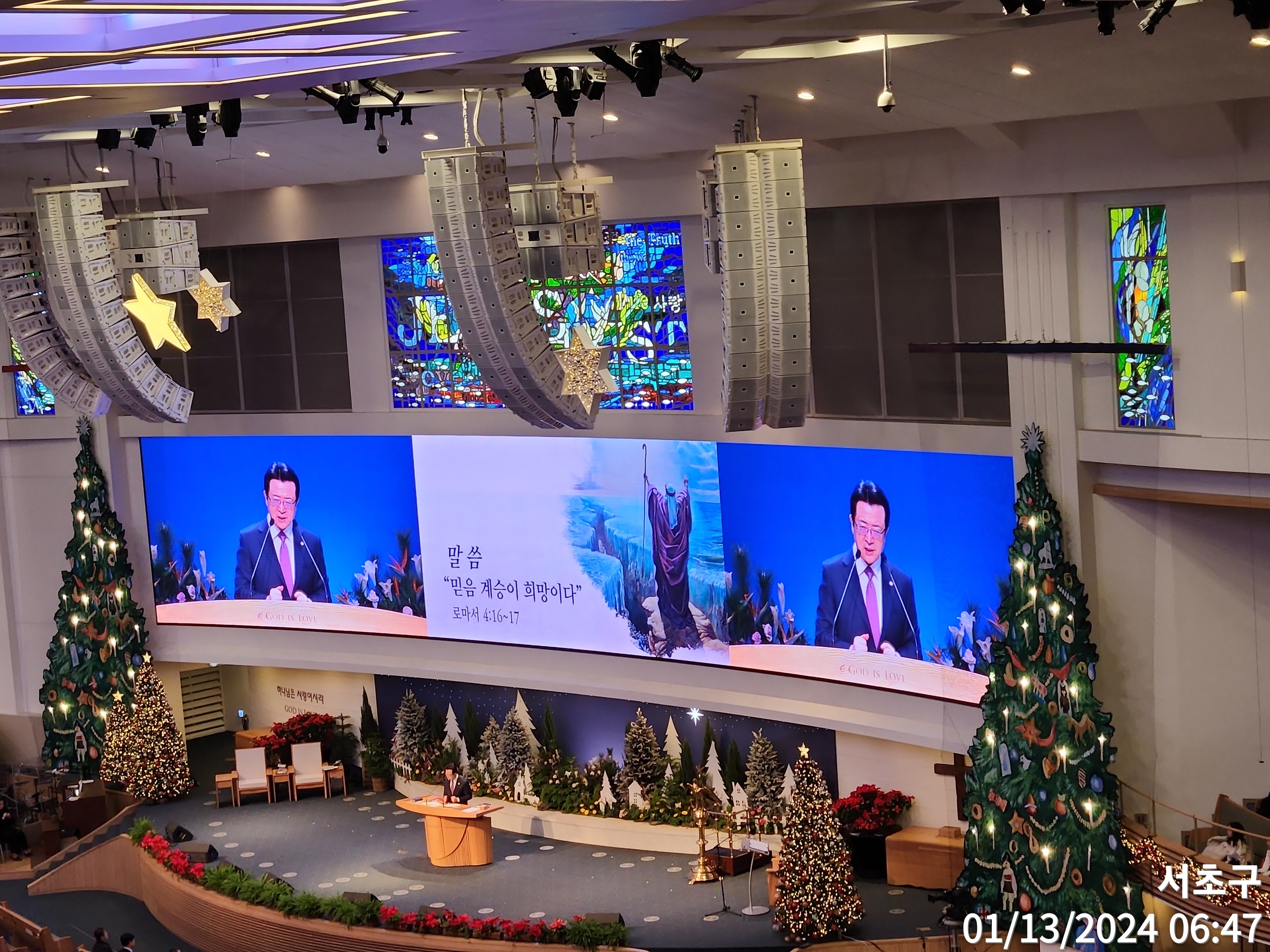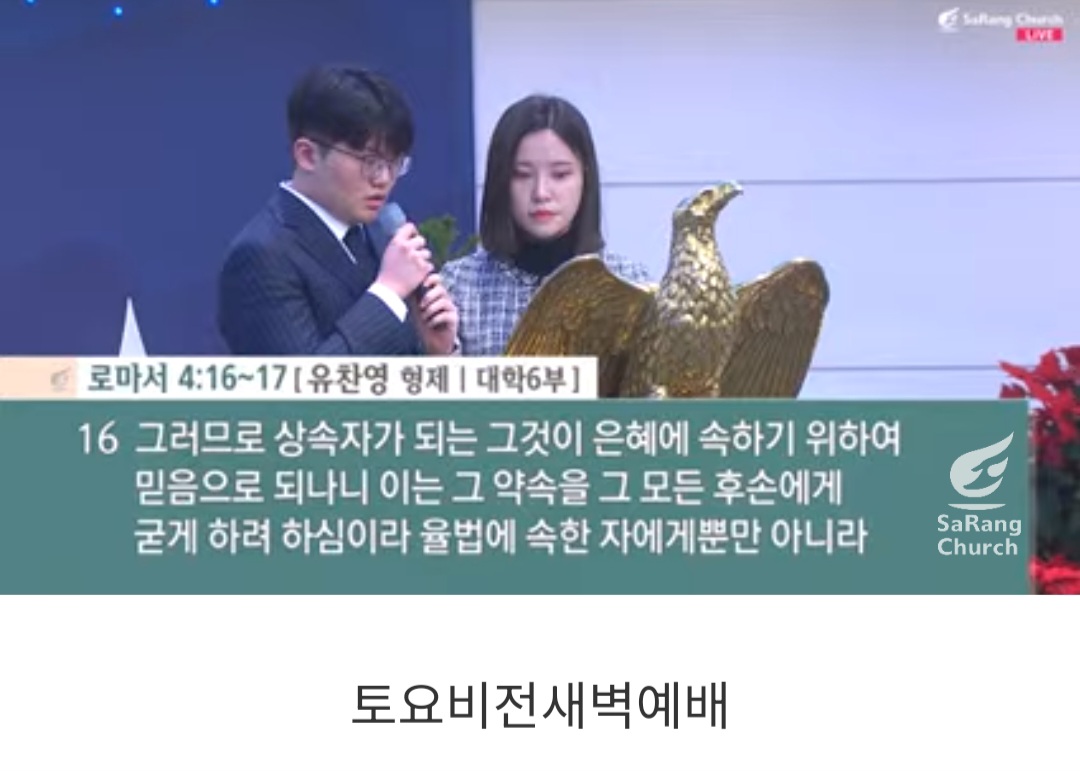 ♣부흥헌신 토요새벽비전예배(주후 2024년 01월 13일) 제목: "믿음 계승이 희망입니다" 말씀: 로마서 4:16~17 대표기도: 한승환 장로님(주일학교 담당) 찬양인도: 주일학교 연합 찬양대 사회: 김대규 부목사님 말씀읽기: 윤찬영 형제(대학6부), 윤선미 자매(청년N국) 설교자: 오정현 담임목사님 ㅡㅡㅡㅡㅡ *로마서 4:16~17, 16 그러므로 상속자가 되는 그것이 은혜에 속하기 위하여 믿음으로 되나니 이는 그 약속을 그 모든 후손에게 굳게 하려 하심이라 율법에 속한 자에게 뿐만 아니라 아브라함의 믿음에 속한 자에게도 그러하니 아브라함은 우리 모든 사람의 조상이라. 17 기록 된 바 내가 너를 많은 민족의 조상으로 세웠다 하심과 같으니 그가 믿은바 하나님은 죽은 자를 살리시며 없는 것을 있는 것으로 부르시는 이시니라. ▶토비새에 나온 여러분들 환영합니다. 오늘 이 이 본당뿐만 아니라, 지금 우리 대학부가 안성 수양관에서 대학 8부까지 있는데, 3부가 같이 모여서 이 아침 우리 겨울 수양회를 하고 있어요. 안성수양관 나오시면 박스 한 번 칩시다. 아니 한 번 더 가까이 보여줘 봐요. 이야 “여호와 닛시”....뭐라고 돼 있어요? 저기 히브리어 읽을 수 있어요? 저기 히브리어로 여호와 닛시가 뭡니까? 우리 대한국은 이번 시간을 통하여 놀라운 하나님의 사명과 비전을 발견하고 돌아올 수 있기를 바랍니다. 박수합니다. 감사합니다. -오늘은 이 칠천 기도회 목사 다음 세대 발대식을 마치고, 오늘 우리 공동의회가 있기 때문에 제가 오늘 짧게 말씀을 좀 드리겠습니다. 오늘 하나님 앞에 우리가 나와서 지금 이렇게 전철 이제 6시 한 20분 돼야 이제 전철이 들어오거든요. 그러니까 그런데도 불구하고 일찍 모셔서 기도한 여러분들 하나님 각자의 기도를 하나님이 응답해 주시기를 바랍니다. 평생의 기도의 제목이 응답되기를 바라는 것이에요. 저는 이렇게 기도합니다. 토요 비전 새벽 예배에 나와 가지고 매주 토요일마다 나와서 평생의 기도 제목을 가지고 기도할 때에 마치 여러분들이 여리고 성을 매일 하루에 한 바퀴, 마지막 7일째, 7바퀴 도니까 총 몇 바퀴입니까? 계산해야 됩니까? 총 13바퀴, 13바퀴 돌고 난 다음에 그 금성철벽 그 강고한 여리고성이 무너진 것처럼 사랑의 교회 모든 성도들 개인의 기도 제목들도 토비새에 나와서 계속 기도할 때, 우리 앞에 있는 열고 성이 무너질 줄로 확신합니다. 마찬가지로 또 국가를 위하여 기도할 때도 국가를 위한 간절한 기도의 제목이 해결되기를 바라는 것이에요. 저 지금 북한에서 김정은 해가지고 핵을 쏜다. 그리고 남한을 뭐 한다 지금 다 여리고성, 지금 11바퀴째까지 가고 있는 거예요. 지금 그러니까 우리가 여기서 결정적으로 매주 토비새 마다 앞으로 몇 달을 기도할 때 역사가 일어날 것이에요. 여러분 생각해 보시라고요. 전 세계에 어느 나라가 이런 토요일 날 다 자고 있어요. 토요일 날은요... 제가 지금 하는 겁니까? 수많은 나라 선진국, 후진국 할 것 없이 등산정은 토요일 날 쉬는 날이니까 아침에 다 자고 있어요. 근데 토요일 새벽에 우리 자녀들과 함께 나와 가지고 이렇게 기도하는 거 이것 자체가 희망 아닙니까? 이거 외에는 다른 희망이 또 있습니까? 그러니까 토비세가 희망인 거예요. 아시겠어요? 왜 토비새가 희망입니까? 나와서 기도하면 토비새를 통하여 주님이 주일 예배를 살려주시는 것이에요. 주일 예배가 살면 사랑의 교회가 사는 것이에요. 사랑의 교회가 살면, 우리 한국교회 같이 사는 것이에요. 한국교회가 살면 세계 복음주의 교회 쇠퇴를 막는 것이에요. 그래서 우리 시대에 세계 선교를 마무리할 수 있도록 하나님의 은혜의 은혜를 덧입혀 주시기를 바랍니다. 따라하겠습니다. ‘토비새가 살면 사랑의 교회가 살고, 사랑의 교회가 살면 한국교회가 살고, 한국교회가 살면 세계 복음주의 교회가 산다.’ 아멘 그런 마음을 가지고 이 새벽에 나온 여러분들의 기도가 주님 앞에 응답받기를 바랍니다. 너무너무 중요한 시간이에요. 다시 얘기합니다. 여러분들이 매주 토요일마다 와서 기도하는 기도의 이 걸음걸음, 기도의 간절함, 기도의 어떤 전체적으로 이렇게 교회 같이 할 때에 우리 앞에 있는 여리고성은 무너질 줄로 확신합니다. 그다음에 우리 토비새가 살면 우리 민족이 산다. 왜냐하면 제가 늘 말씀드리지만 토비새에 나온 여러분들은 영적 제곱근이에요. 제곱근이라는 말 아시죠? 우리 만 명이 변화되기 위하여 만 명은 만 명의 제곱근은 뭐예요? 사랑하는 교회 성도 여러분, 만 명의 제곱 그는 100X100이에요. 100 그쵸? 100 곱하기 100의 제곱은 만 아닙니까? 아주머니들, ㅋㅋㅋ!!!~~ 만 명이 바뀌기 위해서는 100명의 제곱근의 하나님의 백성들이 제곱근 적 기도를 하면 만 명이 바뀌는 것이에요. 그러면 4만 명이 바뀌려면 200명이 제곱근이라면 4만 명이 되는 거예요. 그러면 7천기도 용사가 바뀌면 7천기도 용사가 죽으라 기도하면 7X7이 49, 4,900만 명이 바뀌는 것이에요. 그러니 7천 기도 용서가 제대로 하면 이 민족이 바뀌는 것이에요. 이해가 됩니까? 영적 제곱권의 원리예요. 그러니까 토비새는 영적 제곱근의 토비새의 기도는 영적 제곱근의 