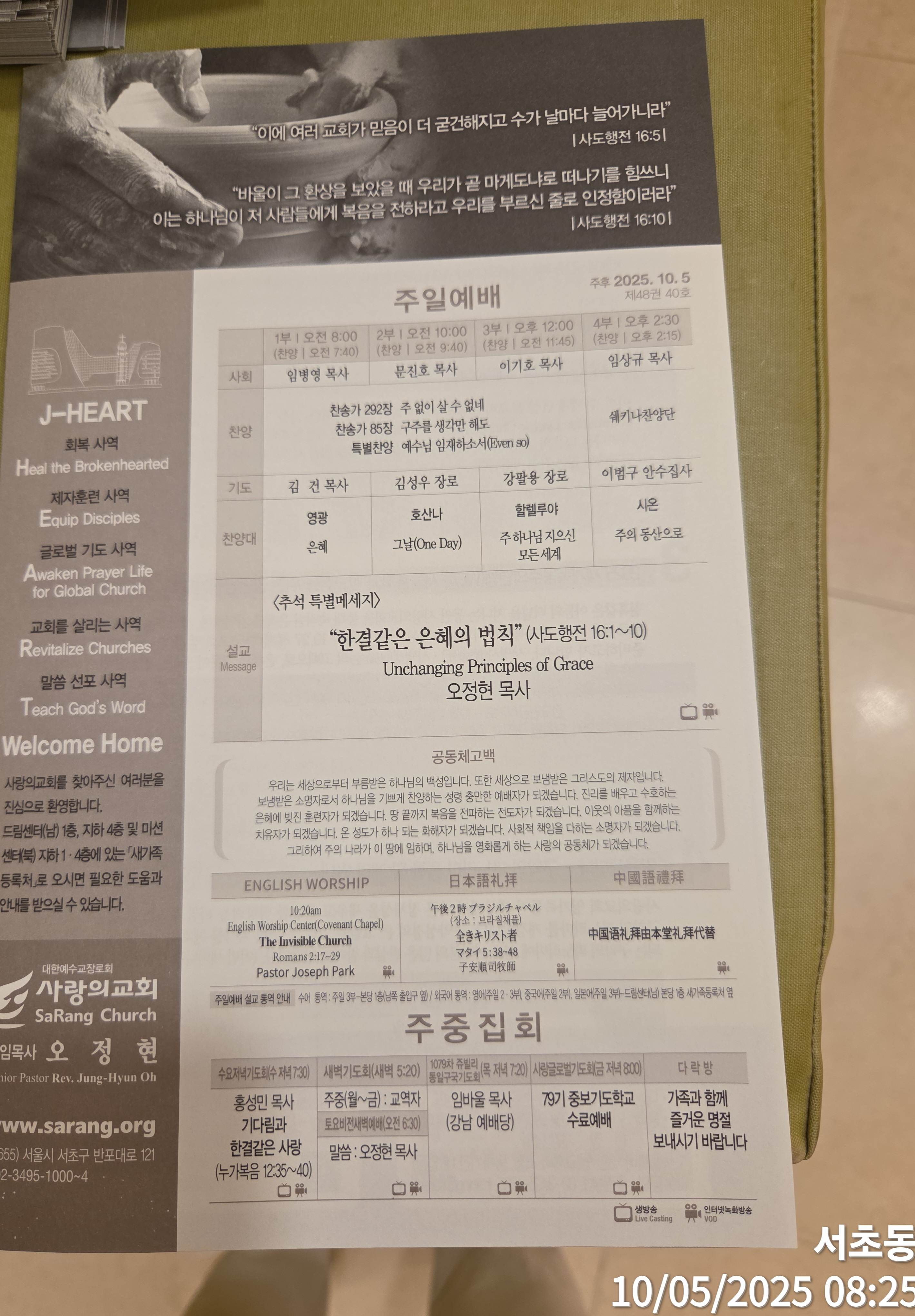 ♣주일예배(주후 2025년 10월 05일) 제목: “한결 같은 은혜의 법칙(Unchanging Principles of Grace)” 설교본문: 사도행전 16:1-10 찬양인도: 쉐키나(이 다니엘 부목사님), 영광찬양대(1부) 대표기도: 김건 부목사님 (1부) 사회: 임병영 부목사님(1부) 헌금송: 엄정화(소프라노) 설교자: 오정현 담임목사님 ----- *사도행전 16:1-10, 1 바울이 더베와 루스드라에도 이르매 거기 디모데라 하는 제자가 있으니 그 어머니는 믿는 유대 여자요 아버지는 헬라 인이라. 2 디모데는 루스드라와 이고니온에 있는 형제들에게 칭찬 받는 자니. 3 바울이 그를 데리고 떠나고자 할새 그 지역에 있는 유대인으로 말미암아 그를 데려다가 할례를 행하니 이는 그 사람들이 그의 아버지는 헬라인 인 줄 다 앎이러라. 4 여러 성으로 다녀 갈 때에 예루살렘에 있는 사도와 장로들이 작정한 규례를 그들에게 주어 지키게 하니. 5 이에 여러 교회가 믿음이 더 굳건해지고 수가 날마다 늘어 가니라. 6 성령이 아시아에서 말씀을 전하지 못하게 하시거늘 그들이 브루기아와 갈라디아 땅으로 다녀가 7 무시아 앞에 이르러 비두니아로 가고자 애쓰되 예수의 영이 허락하지 아니하시는지라. 8 무시아를 지나 드로아로 내려갔는데. 9 밤에 환상이 바울에게 보이니 마게도냐 사람 하나가 서서 그에게 청하여 이르되 마게도냐로 건너와서 우리를 도우라 하거늘. 10 바울이 그 환상을 보았을 때 우리가 곧 마게도냐로 떠나기를 힘쓰니 이는 하나님이 저 사람들에게 복음을 전하라고 우리를 부르신 줄로 인정함이러라. ----- ▶할렐루야. 오늘 명절 기간 주일인데 오늘이 코리안 땡스 기빙 선데이에요. 아, 많은 분들 이렇게 지방에 많이 내려가시고 또 어떤 분들은 어제 보니까? 유럽에도 우리 교우들이 많이 가 계세요, 지금. 목사님 회갑 기념으로 왔습니다. 그리고 또 인도에도 지금 우리 단계 선교 팀들 의료 팀들이 다가 계시고 오늘 보니까? 미국에서 또 역귀성 하셨는데, 우리나라 오셨는데, 새벽에 도착해 가지고 예배당에 왔다는 것이에요. 얼마나 귀한지 이른 비와 늦은 비를 주시는 하나님의 맞춤의 은혜가 여러분들이 있기를 바랍니다. 풍성한 결실이 있고 또 은혜가 무엇인지를 깨닫는 귀한 주일이 되었으면 좋겠습니다. 무엇보다도 황금 연휴인데도 쉬지 못하고 일하시는 분들, 알바는 청년들, 그리고 홀로 힘든 시간을 견디고 있는 수많은 분들에게도 하나님의 예배하신 특별한 은혜가 임하기를 소망합니다. 저는 특별히 명절 주일이 될 때마다. 우리가 평생 기억해야 할 어떤 신앙의 지침, 혹은 토대, 또 제 평소에 제 마음에 두고 있는 말씀을 나누고 있습니다. 그래서 이사야 강의를 잠깐 멈추고 오늘 명절 기념 어떻게 보면 추석에 여러분들 특별 음식도 먹는데 오늘이 말씀이 추석 특별 말씀의 양식이 되기를 바랍니다. 자 오늘 요절을 요절 주보에다 써 놓았는데요. 오늘 제목을 ‘한결 같은 은혜의 법칙’이다. 그랬는데 오늘 요절에 보니까? 사도행전 16장 5절 여러분들 읽었는데, *사도행전 16:5, 5 이에 여러 교회가 믿음이 더 굳건해지고 수가 날마다 늘어 가니라. -참 사도행전의 곳곳마다. 부흥 보고서가 나오지만 오늘 여기에도 특별한 부흥의 보고가 있습니다. 은혜가 있으면 부흥이 되는 것입니다. 그리고 여러분 평생에 여러분이 교회란 말을 당시의 초대교회 뿐만 아니라 여러분 한 분 한 분, 여러분의 생애가 믿음이 더 굳건해지고 여러분 날마다. 수가 더 늘어 가니라. 얼마나 좋겠어요? 부흥 특별 보고인데, 거기에 대한 내용은 오늘 1절부터 5절까지는 바울이 디모데를 얻는 것 때문에 믿음의 아들 디모데를 얻는 것 때문에 큰 은혜를 받았고, 6절부터 10절까지는 보면 바울이 마게도냐 환상을 보고, 그리고 그 본문 오늘 본문 이후로 유럽 교회의 장래가 결정되는 놀라운 내용이 나오고 있습니다. 그래서 제가 참 귀하게 생각하는 본문이고, 저도 이렇게 삶에 여러 형편이 있을 때마다 이 내용이 저에게는 어떤 면에서 사역의 어떤 지침 이라할까? 방향을 정해 주고 있습니다. 아주 귀한 말씀으로 제가 은혜를 받고 있습니다. 그래서 오늘 저는 이 말씀을 근거로 ‘한결 같은 은혜의 법칙이다’ 라는 제목을 썼는데 여러분 사람마다 스타일이 있고 기업들도 기업의 어떤 스타일이 있어요. 어떤 기업은 한국의 그 큰 기업들 가운데에 창의력과 저돌성을 강조하는 기업도 있고, 또 어떤 기업은 인재를 소중하게 생각하고 섬세하게 사람을 키우는 그런 기업도 있고, 또 어떤 기업은 인화력을 강조해 가지고 따뜻한 그런 기업 분위기가 있고 이래도 무슨 말인지 모르시겠어요? 제가 말씀드린 요지는 뭐냐 하면, 어떤 스타일, 그 그런 그 기업의 어떤 스타일이 그런 기업을 오랫동안 유지하게 하는 길이 되었다. 근데 우리 하나님의 일은 더한 것입니다. 하나님의 일은 반드시 잘되는 은혜의 법칙이 있는 줄로 믿습니다. 성경은 잘되는 형통의 스타일에 대해서 대표적으로 요셉은 창세기 39장 2절에 뭐라고 말씀하고 있느냐? *창세기 39:2, 2 여호와께서 요셉과 함께 하시므로 그가 형통한 자가 되어 그의 주인 애굽 사람의 집에 있으니. -여호와께서 요셉과 함께 하심으로 그가 뭐가 