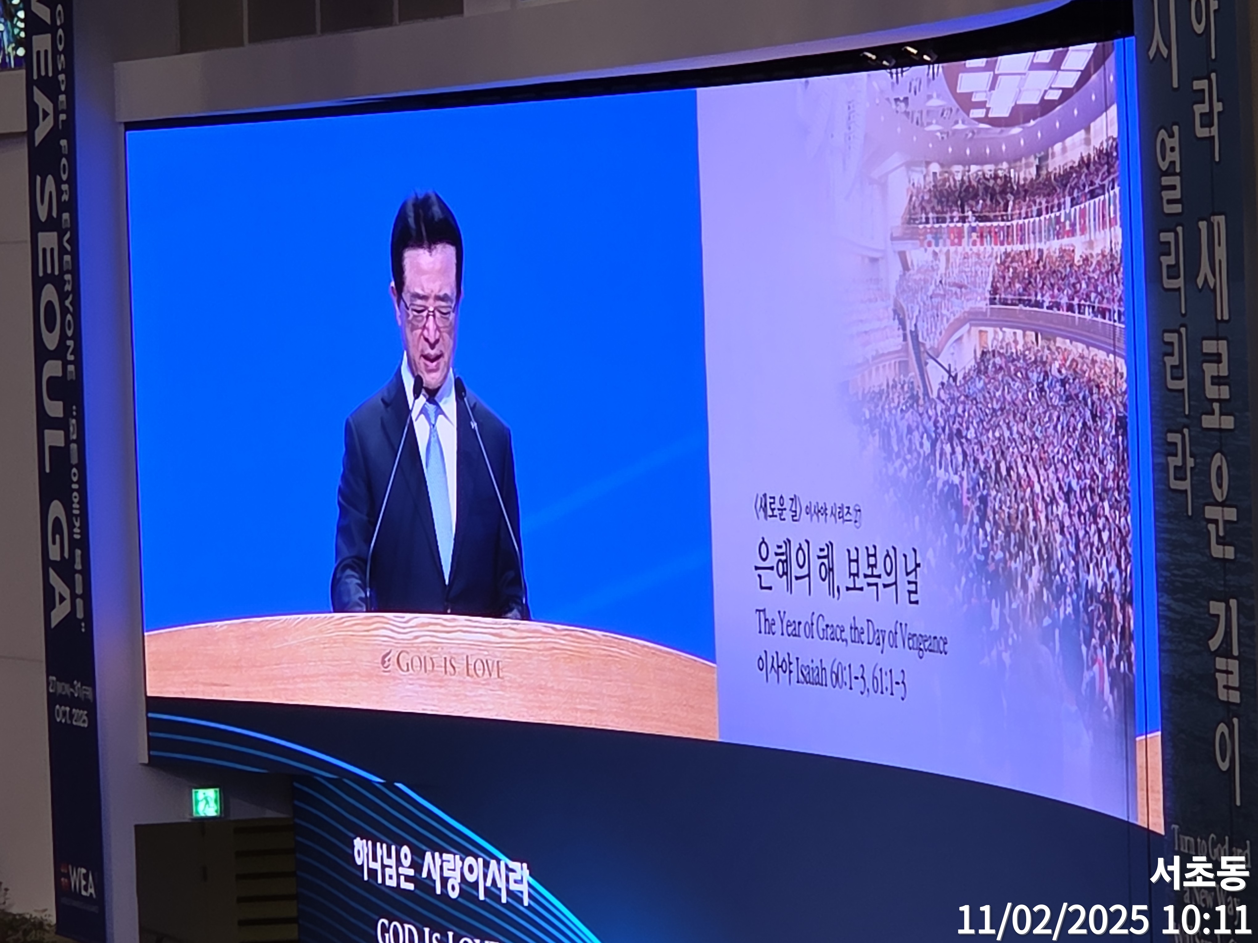 제가 오늘 이런 말씀의 은혜를 제가 갖고, 자 내가 최근에 받은 은혜가 뭘까? 내 생에 지난 은혜 1년, 은혜 2년이 무엇일까? 그래 생각하면서 우리는 ‘6.3 상암집회’부터 시작해 가지고 작년에 ‘10월 27일 차별 금지법 동성애 법’ 통과 온 교우들이 상암집회 15,000명이 거의 갔고, ‘12.27일 우리 다시 일어나 기적의 나라를 만들자’ 했을 때는 우리 거의 3만 여명 우리 교인들이 거의 다 참여했고 이번에 “WEA 세계 복음주의총회”, “한국 교회 섬김 날”에는 수많은 성도들이 함께 참여한 줄로 믿습니다. 그래서 하나님이 은혜를 어떻게 주셨나? 수많은 어려움도 있었지만 제가 이거 우리가 진행하면서 잘 모르는 분들이 오해하는 분들이 있었어요. 그런데 자 어떤 은혜를 주신다고 제가 생각하니까? 은혜의 해, 은혜의 평생, 그 은혜가 오늘 여러분들 정리된 것이 오늘 “WEA 세계 복음주의총회의 서울선언” 이거 받으셨어요?