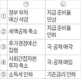[해설] 수능 정답 ③, 테샛 정답 ①. 두 문제 모두 경기 상황에 따라 어떤 재정정책과 통화정책을 써야 하는지 묻는다. 경기가 침체하면 확장(확대)정책, 과열되면 긴축정책을 쓴다. 중요한 것은 무엇이 확장정책이고, 무엇이 긴축정책인지 구분하는 것이다. 수능에서 갑국은 실업자 증가(경기침체)에 확대재정정책으로 대응한다. 따라서 (나)의 정책 목표는 ‘경기부양’이 옳다. 을국은 물가상승 전망에 따라 금리를 올리므로 (가)정책은 ‘긴축통화정책’이다. 테샛 문제는 구체적 인플레이션(물가상승) 대책을 고르라는 것이다. 재정정책은 긴축, 통화정책도 통화량을 줄이는 쪽으로 운용해야 한다. 지급준비율 인상 정책은 통화량 감소 요인이고, 지급준비율 인하는 통화량 증가 요인이다. 국공채 매입 정책은 통화량 증가 요인이고, 국공채 매각은 통화량 감소 요인이다. 추가경정예산 집행은 정부 지출을 늘리는 확장정책, 사회간접자본 투자 축소와 소득세 인하는 결국 정부 지출을 줄이는 긴축정책이다.