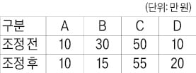 "표는 금융상품 A~D로 구성된 투자 포트폴리오의 조정 전후 상품별 금액을 나타낸다. 조정 후 전체 포트폴리오에서 입출금이 자유로운 상품의 비율은 변함이 없고, 이자수익을 기대할 수 있는 상품의 비율은 80%가 되었으며, 시세차익을 기대할 수 있는 상품만 비율이 모두 높아졌다."