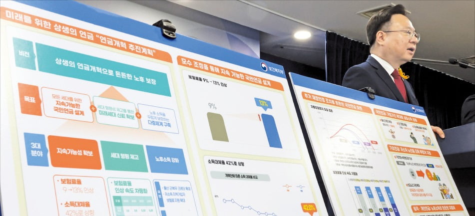 적어도 70년은 고갈 없이 갈 수 있어야 제대로 된 연금 개혁이라 할 수 있어요. 그런데 21대 국회 연금개혁특위가 올 초 내놓은 개혁안은 지난해 재정추계위원회가 제시한 안보다 후퇴했다는 평가가 많았습니다. 그래서 정부가 다시 나섰고, 이번 개혁안을 발표하기에 이른 겁니다. 일단 반응은 17년 만에 제대로 된 개혁안이란 얘기가 많습니다. 구체적으로 정부는 국민연금 보험료율을 9%에서 13%로 올리고, 소득대체율은 40%에서 42%로 높이기로 했습니다. 한마디로 ‘더 내고 더 받는 안’입니다. 세대 간 형평을 위해 보험료율을 인상할 때도 40~50대는 빨리 올리고, 젊은 세대는 천천히 올리게 하는 등 차등화하자고 합니다. 국민연금 지급 보장을 법률에 명문화하겠다고도 했습니다. 또 재정과 인구 여건에 따라 연금액을 자동으로 조정(연금 상승폭 조절)하는 자동조정장치 도입을 추진하겠다고 밝혔죠. 그렇게 해서 연금 고갈 시점을 현재 2056년에서 2088년으로 최대 32년 늦출 수 있다고 합니다.