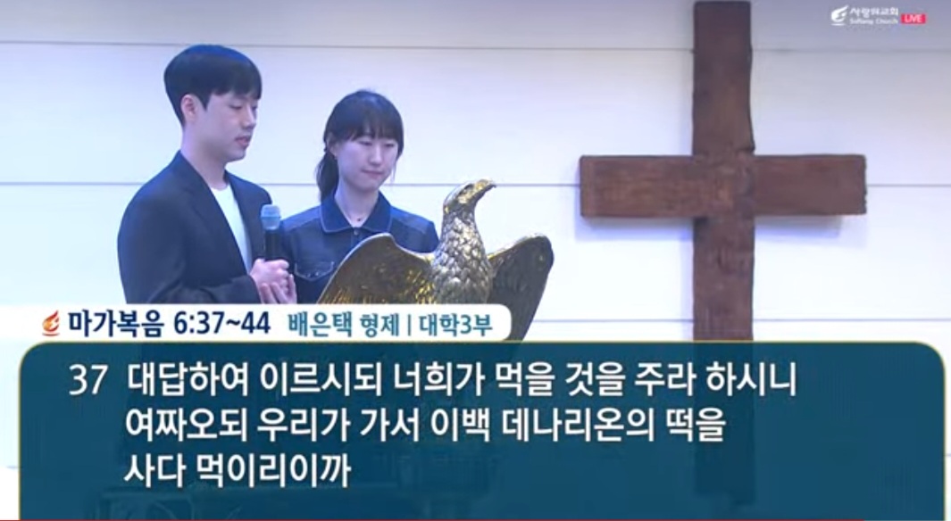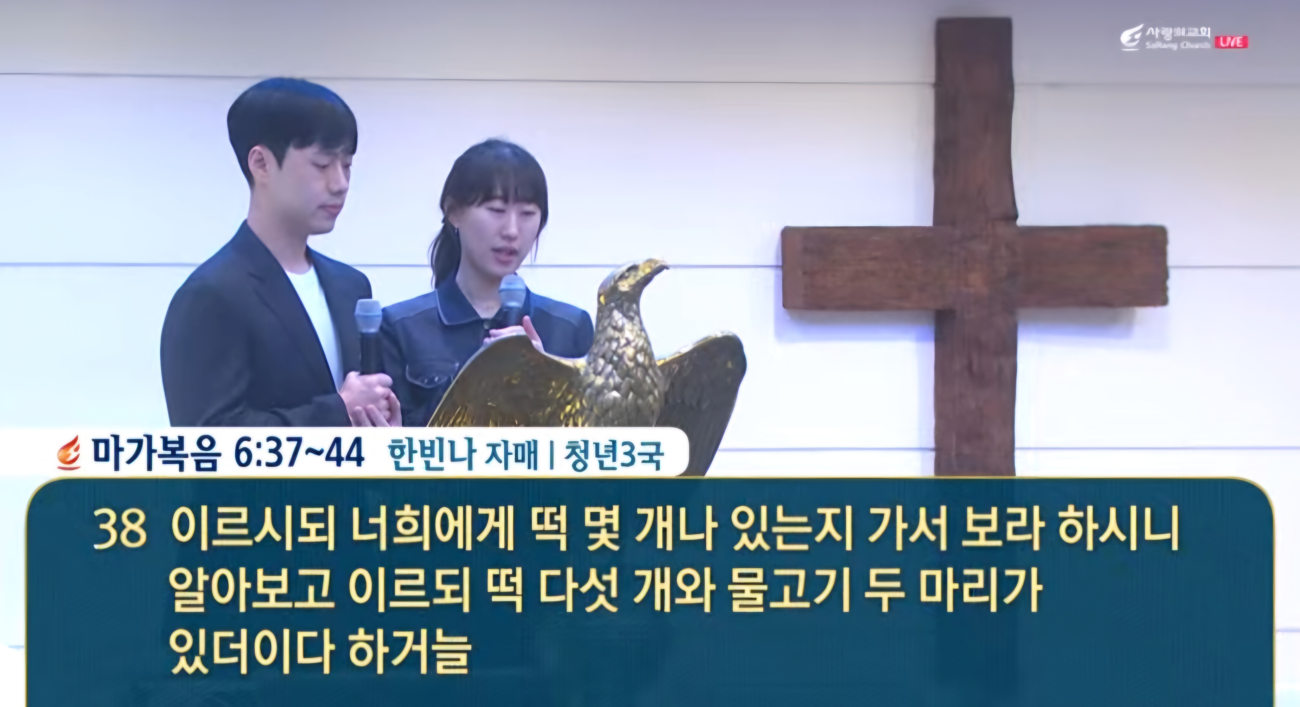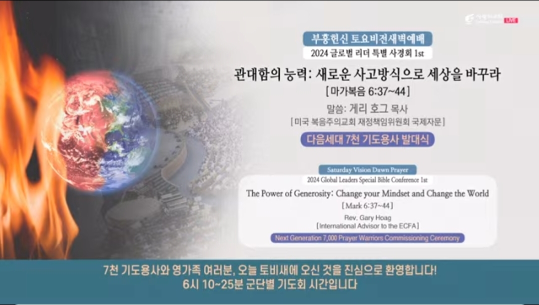 ♣부흥헌신 토요비전새벽예배(주후 2024년 9월 21일) 제목: “관대함의 능력” 말씀: 마가복음 6:37-44 찬양인도: 쉐키나 찬양단 성경봉독: 배은택 형제(대학3부), 한빈나 자매(청년3국) 설교자: 게흐 호그 목사님(미국 복음주의 교회 재정책임위원회 국제자문),통역:김인기 부목사님 ----- *마가복음 6:37-44, 37 대답하여 이르시되 너희가 먹을 것을 주라 하시니 여짜오되 우리가 가서 이백 데나리온의 떡을 사다 먹이리이까. 38 이르시되 너희에게 떡 몇 개나 있는지 가서 보라 하시니 알아보고 이르되 떡 다섯 개와 물고기 두 마리가 있더이다 하거늘. 39 제자들에게 명하사 그 모든 사람으로 떼를 지어 푸른 잔디 위에 앉게 하시니. 40 떼로 백 명씩 또는 오십 명씩 앉은지라. 41 예수께서 떡 다섯 개와 물고기 두 마리를 가지사 하늘을 우러러 축사하시고 떡을 떼어 제자들에게 주어 사람들에게 나누어 주게 하시고 또 물고기 두 마리도 모든 사람에게 나누시매. 42 다 배불리 먹고. 43 남은 떡 조각과 물고기를 열두 바구니에 차게 거두었으며. 44 떡을 먹은 남자는 오천 명이었더라. ----- ▶안녕하세요. 굿모닝!~~ -저의 열두 번째 방문에 사라의 교회 함께 할 수 있어서 너무나 큰 영광입니다. 특별히 오늘 이 시간 다음 세대 여러분들을 본다는 게 저에게 너무나 큰 감동인데요. 저와 함께 이곳에 GTP 스태프가 왔습니다. 이집트, 과테말라, 홍콩, 네팔, 필리핀, 남아공에서 왔습니다. 오늘 저는 예수님께서 모든 세대를 향해 말씀하신 이야기를 나누고자 합니다. 어린이 청소년 여러분! 오늘 이야기 속에서 나 자신을 발견하게 될 것입니다. 어떻게 하냐면 어떻게 하면 하나님 나라의 믿음의 영웅이 될 수 있는지를 배우게 될 것입니다. 특별히 어려운 상황 가운데서 하나님의 도우심을 체험하는 방법을 배우게 될 것입니다. 시작하기 전에 우리 함께 기도하겠습니다. -하늘에 계신 아버지 오늘 예수님의 가르침을 배우며 나아갈 때 우리의 심령에 말씀해 주시고 심령에 능력을 통해 우리가 어떤 역할을 시댁 가운데 감당해야 되는지 알게 하여 주옵소서. 오늘 말씀을 통하여 이 모든 것이 이루어질 것을 믿사오며 예수님의 이름으로 기도 드립니다. 아멘! 오늘 본문은 여러분들이 잘 아시는 이야기입니다. 이 이야기는 옛 예수님의 사역 중 4개 복음서 모두에 기록된 기적입니다. 바로 5천 명을 먹이신 기적입니다. 오늘 저는 5가지 포인트를 말씀드리고 한 영상을 짧게 보여 드린 후에 믿음의 비밀을 나누도록 하겠습니다. 어려운 상황 가운데서 하나님의 도우심을 체험하는 방법을 나누도록 하겠습니다. 첫 번째 포인트는 -함께 30절과 31절 제가 읽도록 하겠습니다. I. 첫 번째 포인트, 예수님 주위에 우리가 모여야 합니다. *마가복음 6:30-31, 30 사도들이 예수께 모여 자기들이 행한 것과 가르친 것을 낱낱이 고하니. 31 이르시되 너희는 따로 한적한 곳에 가서 잠깐 쉬어라 하시니 이는 오고 가는 사람이 많아 음식 먹을 겨를도 없음이라. -혹시 너무 바빠서 식사를 걸러보신 분계신가요? 그럴 때마다 예수님은 우리에게 말씀하십니다. 따로 한적한 곳에 가서 잠깐 쉬어라. 여러분 영적 성장을 방해하는 가장 큰 장애물이 바로 피로(疲勞)와 탈진(脫盡)이라는 사실을 알고 계신가요? 우리가 지칠 때 예수님은 우리를 주님의 품으로 초청하십니다. 성도 여러분, 오늘 만약 지치셨다면 예수 그리스도 안에서 쉼을 누르시길 바랍니다. 사역은 우리가 영육 간에 프레시 하고 피곤하지 않을 때, 가장 잘 감당할 수 있습니다. 제자들이 예수님과 쉰 후에 무슨일이 일어났는지 우리 함께 보도록 하겠습니다. 하나님의 도우심을 체험하기 위해 필요한 II. 두 번째 포인트, 예수님의 긍휼(矜恤)하신 가르침입니다. *마가복음 6:32-34, 32 이에 배를 타고 따로 한적한 곳에 갈새. 33 그들이 가는 것을 보고 많은 사람이 그들인 줄 안지라 모든 고을로부터 도보로 그 곳에 달려와 그들보다 먼저 갔더라. 34 예수께서 나오사 큰 무리를 보시고 그 목자 없는 양 같음으로 인하여 불쌍히 여기사 이에 여러 가지로 가르치시더라. -예수님은 한적한 곳에서 큰 무리를 보셨습니다. 예수님은 대부분의 사람들이 보지 못하는 것을 보고 계셨습니다. 바로 예수님은 사람들의 필요와 갈급함을 보셨고 사랑과 자비로 다가가셨습니다. 긍휼함이란 사랑을 행동으로 옮기는 것으로서 도움이 필요한 사람들에게 다가가는 것입니다. 그들에게 말씀의 가르침이 필요했기 때문에 예수님은 사랑으로 말씀을 가르쳐 주셨습니다. 만약 하나님께서 여러분들의 영안을 열어주신다면 여러분들은 서울에서 어떠한 피로와 갈급함을 볼 수 있을까요? 서울은 사람들이 참 많은 곳이지만 반대로 많은 사람들이 외로움을 느끼는 곳일지도 모르겠습니다. 혹시 여러분 주위에 홀로 외로이 있거나 도움이 필요한 사람이 떠오르시나요? 그들에게 사랑과 자비로 다가가는 모습은 어떠한 모습일까요? 하나님의 도심을 체험하기 위해 필요한 두 번째 포인트는 사고방식의 변화를 체험해야 합니다. -사고방식의 변화란 무엇일까요? 35절에서 38절까지 읽겠습니다. II. 두 번째 포인트, 사고방식의 변화를 체험해야 합니