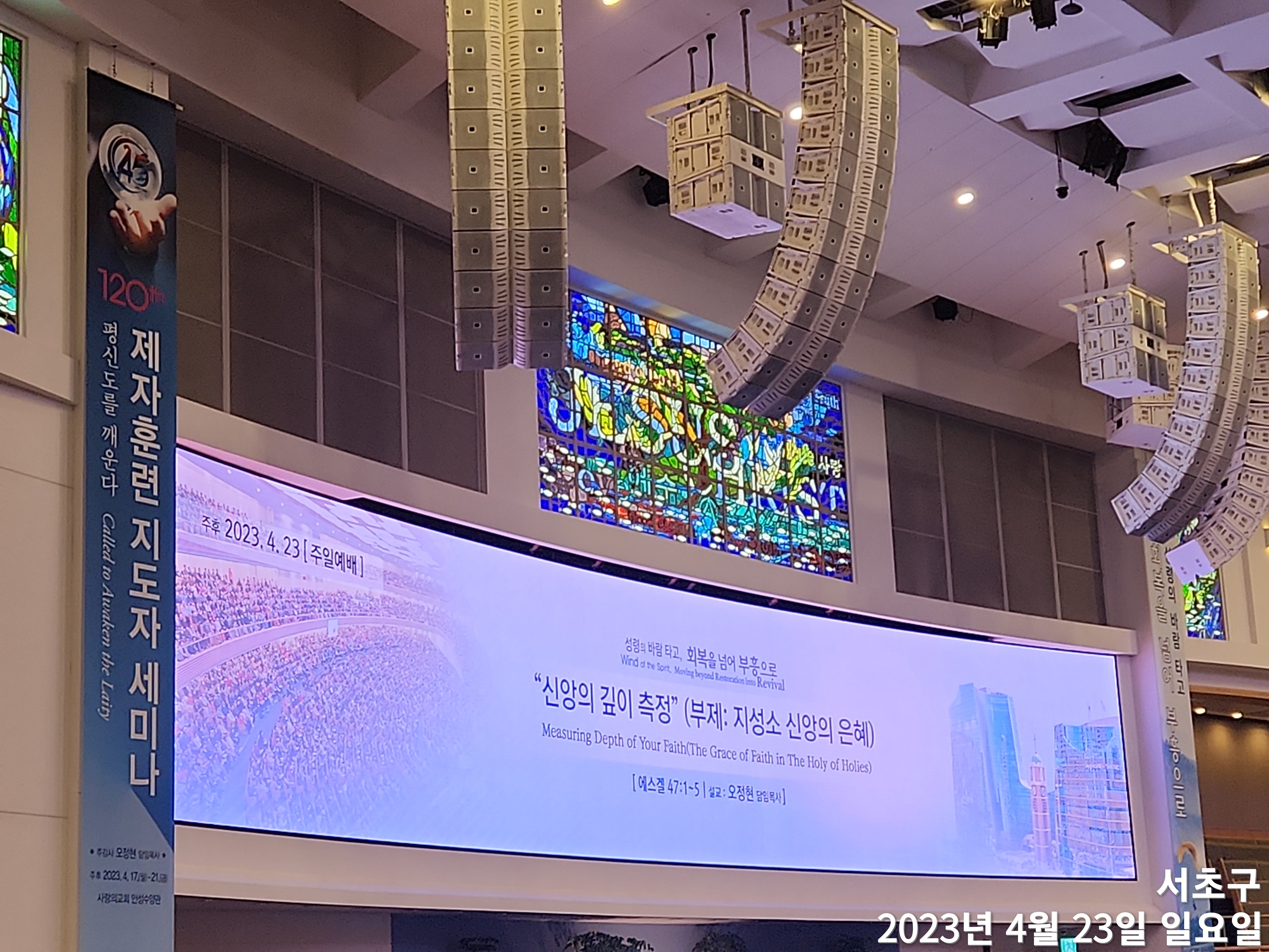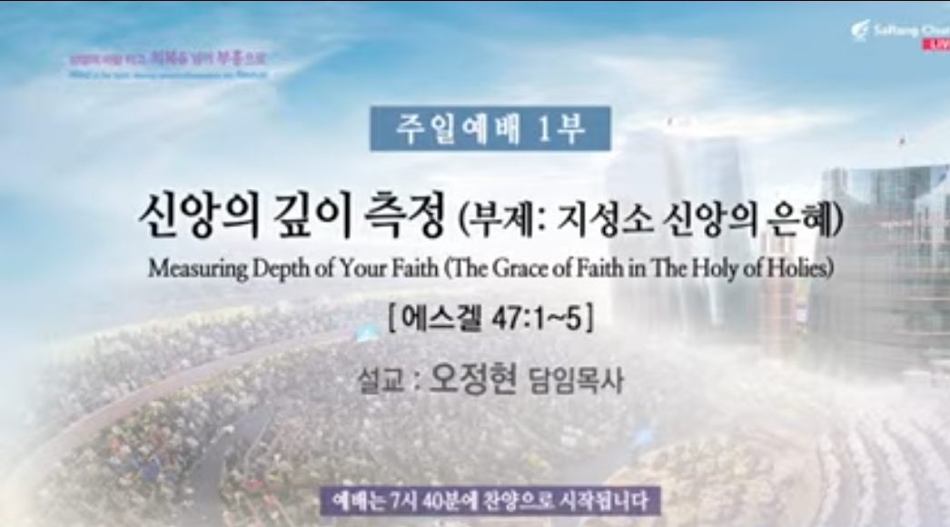 주일예배(2023년 4월 23일) 제목: "신앙의 깊이 측정" 부제: 지성소 신앙의 은혜 말씀: 에스겔47:1~5 찬양인도: 쉐키나(이 다니엘 부목사님), 영광찬양대(1부) 대표기도: 남동우 부목사님(1부) 사회: 천동원 부목사님(1부) 설교자: 오정현 담임목사님 ㅡㅡㅡㅡㅡ *에스겔47:1~5, 1 그가 나를 데리고 성전 문에 이르시니 성전의 앞면이 동쪽을 향하였는데 그 문지방 밑에서 물이 나와 동쪽으로 흐르다가 성전 오른쪽 제단 남쪽으로 흘러내리더라. 2 그가 또 나를 데리고 북문으로 나가서 바깥 길로 꺾여 동쪽을 향한 바깥문에 이르시기로 본즉 물이 그 오른쪽에서 스며 나오더라. 3 그 사람이 손에 줄을 잡고 동쪽으로 나아가며 천 척을 측량한 후에 내게 그 물을 건너게 하시니 물이 발목에 오르더니. 4 다시 천척을 측량하고 내게 물을 건너게 하시니 물이 무릎에 오르고 다시 천척을 측량하고 내게 물을 건너게 하시니 물이 허리에 오르고. 5 다시 천척을 측량하시니 물이 내가 건너지 못할 강이 된지라 그 물이 가득하여 헤엄칠 만한 물이요 사람이 능히 건너지 못할 강이더라. ----------- ▶오늘 주일 예배에 은혜의 지성소가 되게 하신 주님을 찬양한다. 이 자리가 얼마나 감사한지, 우리가 기도한 대로 오늘이 작은 부활절이다. 영광의 대관식이다. 영광의 잔치가 되는 것이다. 그래서 일주일 가운데 이 시간이 가장 피크가 되어야 나머지 삶도 은혜의 지성소의 물이 흘러서 은혜의 축복이 되는 것이다. 오늘은 구한 찬송이다. 강단에 모란 작약이 피었다. 오늘은 장애인 주일인데 1년에 함께 축하의 자리이다. 축하의 꽃인 것 같다. 예배에 함께 하고 또한 수고하시는 교사들과 교역자님과 모두께 감사의 박수를 전하자. 예수 믿는다는 것은 감사하고 좋은 것이다. 지난주일 CAL세미나 너무 잘 마쳤다. 제가 특새 하고 CAL세미나 하고 목소리가 갔다. 그러니까 목이 갔지만 거룩한 목소리가 되었으면 좋겠다. 양해하기 바란다. 120기 제자훈련 37년 동안 CAL세미나를 했다. 얼마나 감사한가! 전 세계가 한결 같은 역동성을 가지고 유지하는 것은 쉬운 일이 아니다. 지금까지 오게 하신 하나님께 감사하다. 그리고 CAL세미나 중에 하나가 우리가 교회 성장 방법론을 전달하는 노하우가 아니고, CAL세미나의 목회의 본질과 사역의 뿌리가 무엇이냐? 그리고 어떻게든 흔들릴 수 없는 토대, 근거와 신념과 뿌리가 무엇인지 우리가 다루고 싶다. 뿌리가 깊으니까 흔들림이 없다. 그래서 CAL세미나를 통해 목회자로, 중직 자가 살고, 지역교회가 살면 교회가 사는 줄로 확신한다. 교회가 살면 이 민족이 사는 것이다. 그래서 우리는 오늘은 신앙의 깊이 뿌리로 지성소의 신앙으로 부제로 붙여보았다. 19번째 부흥헌신 ‘신앙의 깊이를 측정’하는 제목으로 설교를 하겠다. 흔히들 신앙의 나이가 있고 신앙의 경력, 신앙의 연수, 신앙의 역사를 묻는다. 엄격히 말하면 신앙은 나이나 길이에 의해서 결정되는 것이 아닌, 신앙은 깊이에 의해서 결정된다. 묻겠다. 적당히 교회 10년 왔다가 가는 것과, 1년 제자훈련 제대로 하는 신앙과의 누가 더 깊이가 있겠는가? 누가 더 신앙의 깊이가 있는가? 1년 제자훈련이다. 주님을 더 깊이 알아가고 제대로 제자훈련이 신앙이 깊은 것이다. 마태복음 20장을 보면 포도원 일꾼의 비유가 있다. *마태복음 20:16, 16 이와 같이 나중 된 자로서 먼저 되고 먼저 된 자로서 나중 되리라. -신앙도 길이도 중요하지만 깊이가 중요하다. 우리 교회도 신앙의 깊이와 뿌리가 내려지기를 바라는 것이다. 이것은 자연법칙과도 이와 같다. 나무의 뿌리도, 건물의 높이는 기초공사에 의해서 결정이 된다. 얼마나 튼실하냐에 따라서 결정되는 것이다. 그러나 우리는 상식으로는 다 안다. 다 알지만 그것이 깊이나 뿌리가 당장 눈에 보이지 않고 겉만 보고 판단하기 때문이다. 겉만 멀쩡하면 속을 수가 있다. 그래서 시편 1편에 보면, 복 있는 사람은,,, *시편 1:3, 3 그는 시냇가에 심은 나무가 철을 따라 열매를 맺으며 그 잎사귀가 마르지 아니함 같으니 그가 하는 모든 일이 다 형통하리로다. -그 핍박과 유혹에 뜨거운 이글거리면서 사람을 막 뜨겁고 힘들게 하더라고 변함이 없이 꾸준하게 열매를 맺는 이유는 그 뿌리의 근원이 샘에 있기 때문이다. 우리의 평생, 우리의 현장이 은혜의 깊은 강수를 마칠 수 있고 그것을 체험할 수 있는 우리의 뿌리가 있기를 바라는 것이다. 자연스럽게 잎사귀가 열매를 맺게 되는 것이다. 내가 신앙의 깊이가 있는가, 없는가의 측정은 내가 열매가 있는가, 없는가이다. 여러분 3년 내로 여러분 때문에 예수 믿는 분이 있는가? 한다. 여러분 때문에 정말 신앙의 어떤 열매의 변화가 되어서 그런 분들이 주위에 있는가? 우리가 그런 면에서 감사한 면이 있겠지만 많은 분들이 내가 왜 이러는가? 나 때문에 귀한 영향을 받아서 예수를 믿는다든지 나 때문에 주님 길에 들어서는 사람이 얼마나 있겠는지, 내 신앙의 수준과 내 측정이 어느 정도인가를 되돌아보아야 한다. 그것을 오늘 본문을 가지고 보면, 에스겔서의 47장을 보면, 에스겔의 환상을 보면, *시편 1:3, 3 그는 시냇가에 심은 나무가 철을 따라 열매를 맺으며 그 잎사귀가 