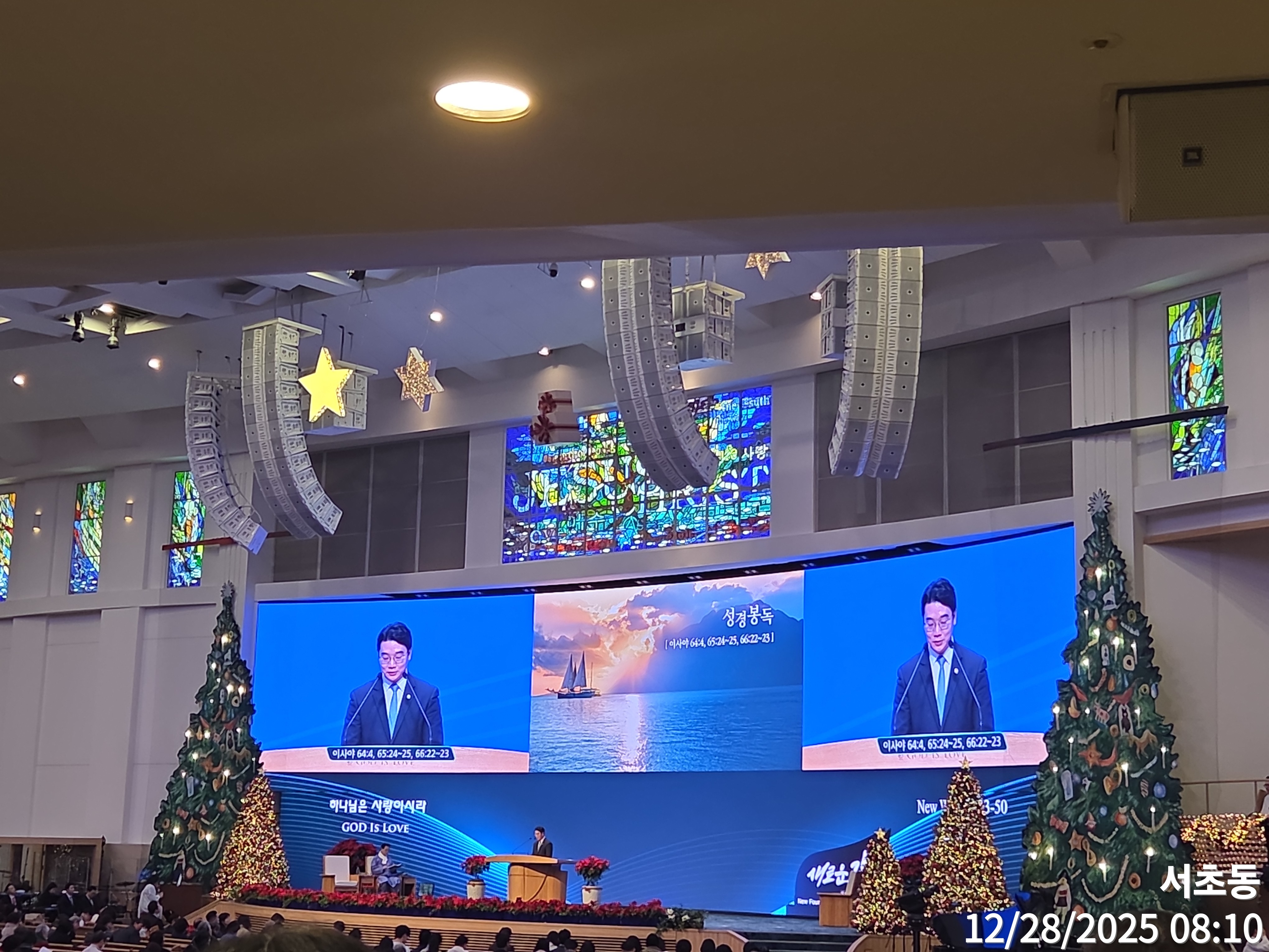 ♣주일예배(주후 2025년 12월 28일)-이사야 시리즈 ㉝ 설교제목: ”마지막 계시와 환상(The Final Revelation and Vision)“ 성경본문: 이사야 64:4, 65:24~25, 66:22~23 찬양인되 쉐키나(이 다니엘 부목사님) 대표기도: 백두산 부목사님(1부) 사회: 임병영 부목사님 설교: 오정현 담임목사님 ----- *이사야 64:4, 4 주 외에는 자기를 앙망하는 자를 위하여 이런 일을 행한 신을 옛부터 들은 자도 없고 귀로 들은 자도 없고 눈으로 본 자도 없었나이다. *이사야 65:24~25, 24 그들이 부르기 전에 내가 응답하겠고 그들이 말을 마치기 전에 내가 들을 것이며. 25 이리와 어린 양이 함께 먹을 것이며 사자가 소처럼 짚을 먹을 것이며 뱀은 흙을 양식으로 삼을 것이니 나의 성산에서는 해함도 없겠고 상함도 없으리라 여호와께서 말씀하시니라. *이사야 66:22~23, 22 내가 지을 새 하늘과 새 땅이 내 앞에 항상 있는 것 같이 너희 자손과 너희 이름이 항상 있으리라 여호와의 말이니라. 23 여호와가 말하노라 매월 초하루와 매 안식일에 모든 혈육이 내 앞에 나아와 예배하리라. ----- ▶1. 보이지 않는 환상 1-1. 보이지 않는 것을 향한 믿음 - 보이지 않는 것을 보는 것이 계시이며, 이는 바울의 고백에서 나타남 - 눈에 보이지 않는 성령의 세계를 믿고, 성령의 은혜를 받아야 함 - 계시는 눈에 보이는 것이 아니라, 영혼을 열어야 보이게 함 - 이사야는 계시를 본 선지자로, 1장부터 66장까지 하나님의 환상을 그렸음 - 이사야는 본문에서 보이지 않는 영적 세계에 대해 눈으로 봄을 주시고, 새 하늘과 새 땅을 주심으로 믿게 함 1-2. 이사야의 환상 - 이사야는 하나님께서 다윗과 솔로몬의 전성기 이후의 데스로트 시기를 위로해 주시기 위해 환상을 주심 - 웃시아 왕의 죽음 이후, 사람들이 낙심하고 희망이 없어짐 - 이사야는 이 순간을 비관주의에 빠진 사람들에게 하나님의 환상을 주심으로 비관을 깨뜨리고 새 하늘과 새 땅을 약속함 - 이사야는 본문에서 보이지 않는 세계에 대해 이야기하며, 눈에 보이지 않는 것을 향한 믿음을 주심 - (중요) 보이지 않는 원인에 의해 보이지 않는 세계가 나타난다는 것이 성경의 분명한 가르침임 1-3. 보이지 않는 세계에 대한 믿음 - 보이지 않는 세계를 믿고, 성령의 역사하심을 의지해야 함 - 눈에 보이지 않는 것, 즉 영적인 세계를 보고 깨달아야 함 - 눈에 보이는 것은 보이지 않는 원인에 의해 나타난 결과임을 기억해야 함 - 세계에서 가장 먼저 제일의 권력은 보이지 않는 것을 볼 수 있는 능력임 - 이사야의 본문은 보이지 않는 세계에 대한 믿음을 위한 계시임 2. 보이지 않는 세계의 힘 2-1. 보이지 않는 것에 주목함 - 인생은 무엇으로 행복해지는지 연구했지만, 행복은 물질이 아닌 인간 관계에 있음 - 하나님과의 올바른 관계가 인생의 행복을 결정함 - 보이지 않는 하나님의 말씀이 우리의 인생을 결정함 - 하버드대 연구에서 보이지 않는 세계의 최고의 접점은 하나님의 말씀이라고 밝힘 - (중요) 72절을 암송하면 장례가 결정되고, 인생이 결정될 수 있음 2-2. 암송의 힘 - 보이지 않는 세계에 주목하면 영적인 세계에 눈이 열리고, 하나님의 섭리적인 손이 의식됨 - 지금 우리가 겪는 일에 일희일비 하지 않고, 하나님을 찬양하며 그분의 뜻을 의지함 - 우리가 보이지 않는 세계에 눈이 열리면, 영광스러운 즐거움과 기쁨이 찾아옴 - 예수님을 보지 못했지만, 믿고 말할 수 없는 영광스러운 즐거움으로 기뻐함 - 어려움이 아니라, 마음이 거룩한 성숙이 있는 것처럼 하나님의 뜻을 의심하는 것이 중요함 2-3. 보이지 않는 세계의 섭리 - 보이지 않는 세계에 눈을 뜨면, 하나님의 보이지 않는 섭리적인 손이 의식됨 - 우리가 겪는 어려움과 문제는 우리가 그 말씀을 통해 해결책을 찾을 수 있음 - 우리가 하나님의 말씀을 따라갈 때, 선을 이루게 됨 - 보이지 않는 세계에 눈이 열리면, 하나님의 환상과 계시를 경험하게 됨 - 예수님을 사랑하는 마음이 이 땅에서 꿈이 되고, 천국에서 주인처럼 살게 됨 3. 하나님의 비전 3-1. 새 하늘과 새 땅 - 본문에서 보이지 않는 새 하늘과 새 땅이 언급됨 - 그곳에는 해함도, 상함도 없으며, 모두 해와 상함이 없는 곳임 - 우리가 살아가는 땅에는 해와 상함이 있음 - 해와 상함은 가해자와 피해자의 입장으로, 가해자로 인한 죄악과 피해자의 상처로 인한 억울함이 있음 - 새 하늘과 새 땅은 해와 상함이 없는 곳임 3-2. 새 하늘과 새 땅의 비전 - 요한계시록의 제자인 사도 요한은 비전을 받아들이고 이를 발전적으로 해석함 - 요한계시록 27장 4절과 21장 4절을 인용하여 설명함 - 모든 눈물을 닦아 주시고, 사망과 애통, 상함이 없는 세상을 경험하게 하겠다고 약속함 - 저주가 없으며, 눈이 열린 사람에게 초대교회 성도들은 비전을 맛보기를 기대함 - 해와 상함이 없는 세상과 영의 눈이 열린 사람에게 하나님의 나라가 기다리고 있음 3-3. 비전의 결과 - 우리는 세상의 상처에 굴복하지 않고, 소망으로 인해 하나님 나라의 방식으로 살아감 - 해와 상함이 없는 세상을 기다리며, 상처를 주지 않고 받지 않는 하나님의 백성의 특징을 강조함 - 한국 교회는 더 이상 상처를 주지 말고, 상처를 받지도 말기를 바란다고 함 - 하