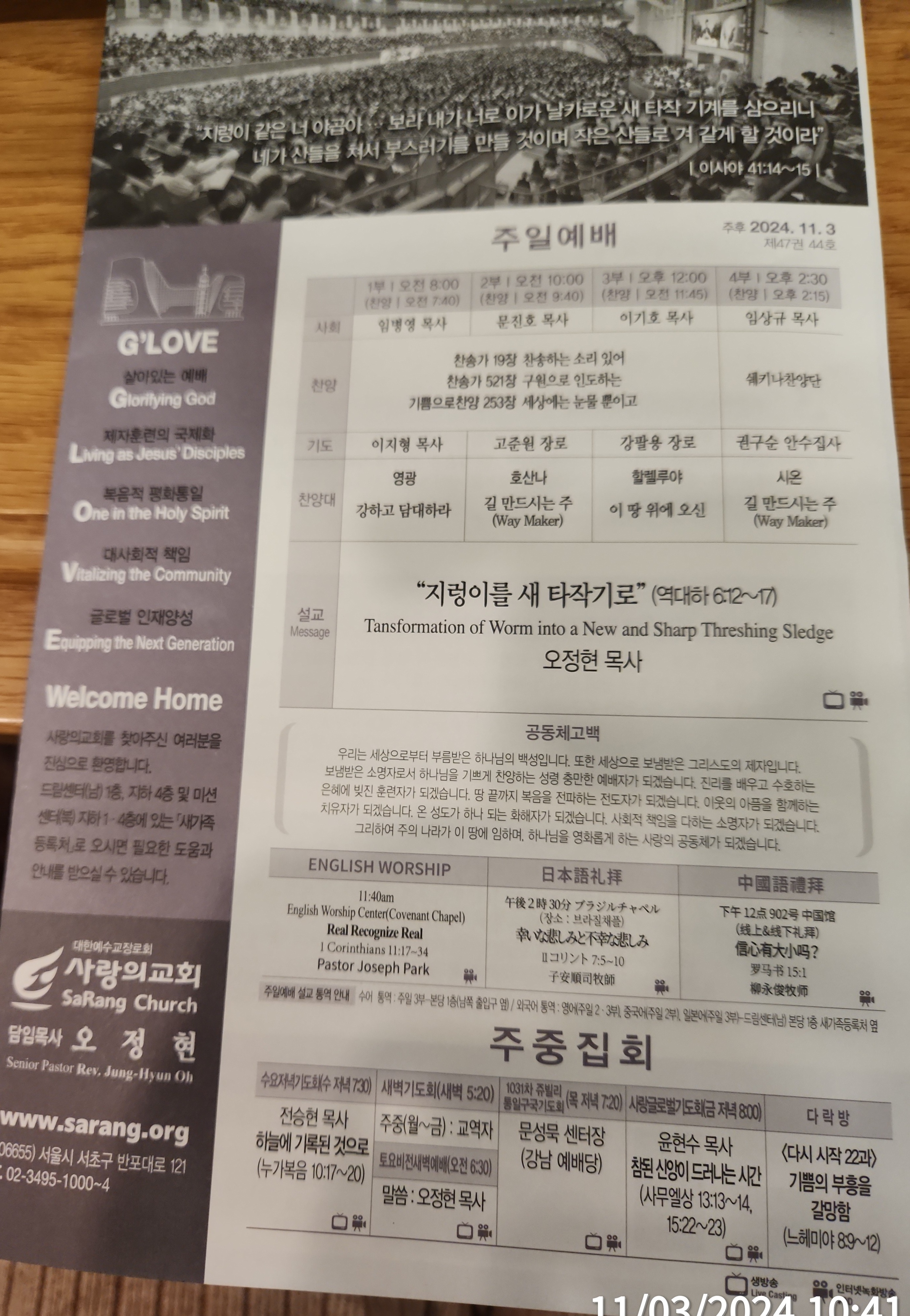 ☆ ♣주일예배(주후 2024년 11월 03일)"지렁이를 새 타작기로"(오정현 담임목사님)-사랑의 교회 ☆