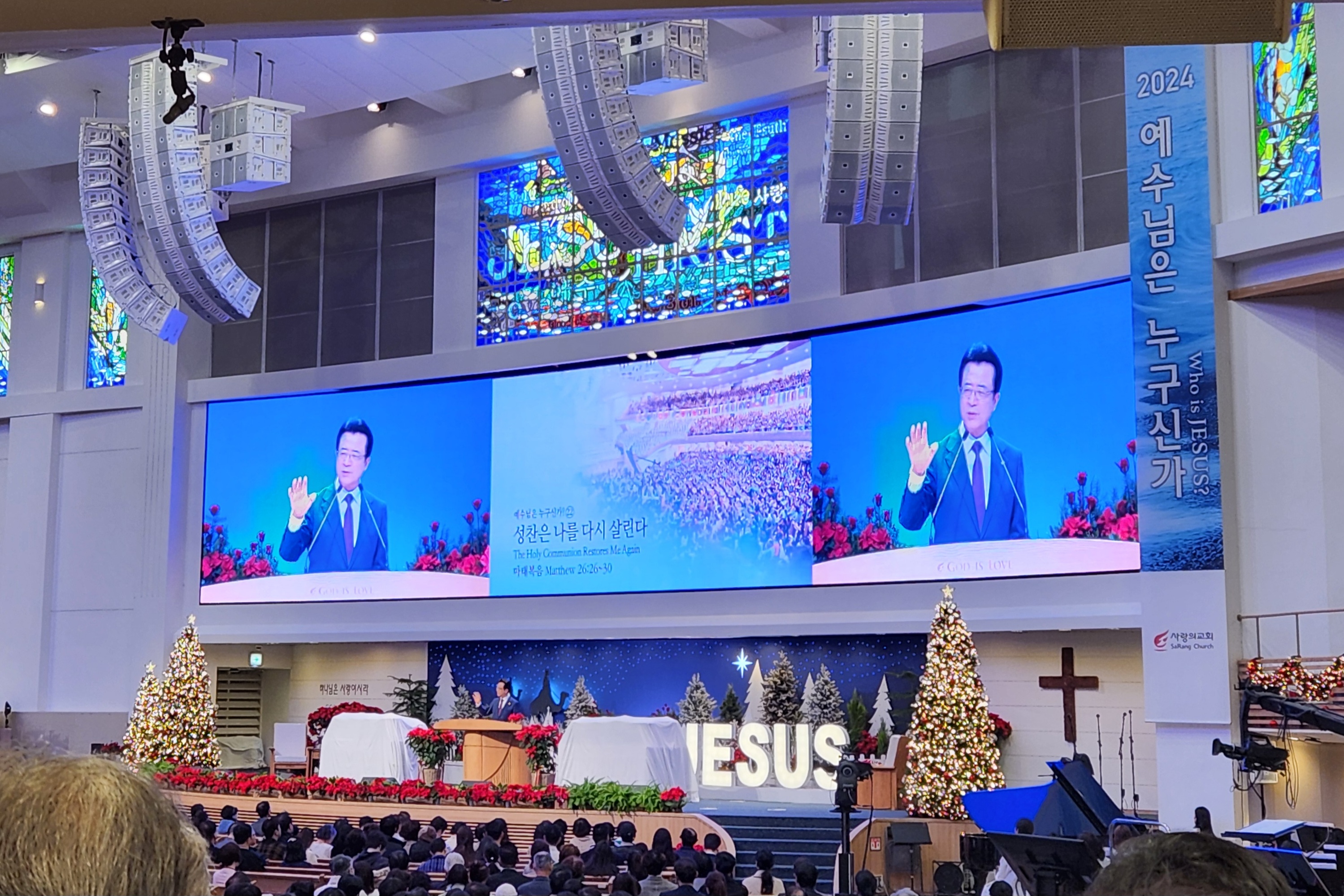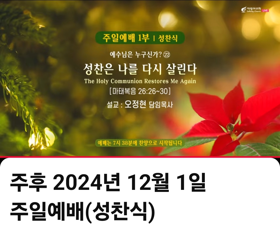 ♣주일예배(주후 2024년 12월 01일)-성찬식(聖餐式) 제목: "성찬은 나를 다시 살린다" 말씀: 마태복음 26:26-30, 찬양인도: 쉐키나(이 다니엘 부목사님), 영광찬양대 외 대표기도: 남수현 부목사님 외 사회: 임병영 부목사님(1부) 외 설교자: 오정현 담임목사님 ㅡㅡㅡㅡㅡ *마태복음 26:26-30, 26 그들이 먹을 때에 예수께서 떡을 가지사 축복하시고 떼어 제자들에게 주시며 이르시되 받아서 먹으라 이것은 내 몸이니라 하시고. 27 또 잔을 가지사 감사 기도 하시고 그들에게 주시며 이르시되 너희가 다 이것을 마시라. 28 이것은 죄 사함을 얻게 하려고 많은 사람을 위하여 흘리는 바 나의 피 곧 언약의 피니라. 29 그러나 너희에게 이르노니 내가 포도나무에서 난 것을 이제부터 내 아버지의 나라에서 새것으로 너희와 함께 마시는 날까지 마시지 아니하리라 하시니라. 30 이에 그들이 찬미하고 감람 산으로 나아가니라. ㅡㅡ ▶12월 첫날이자 우리 주일이 되었습니다. 한 해에 이제 연말연시가 시작되는 주일인데 우리가 이와 같이 성찬을 통하여 우리 연말연시 준비하게 하신 주님을 찬양합니다. 세례는 평생 1번 받지만, 단회적이지만 성찬은 반복적이고, 지속적인 것입니다. 성령님께서 예배하신 성찬의 충만한 해가 이 연말연시에 마음이 좀 텅 비기 쉬운데 그 텅 빈 마음을 성찬의 크신 은혜로 채워주시기를 바랍니다. 성찬(聖餐)에 대해서 얘기할 때에, 성만찬은 앞으로 어린 양의 혼인 잔치를 이 세상에서 미리 맛보는 예표(豫表)의 시간이다. 이렇게 말할 수 있는데, 그러니까 예수님 오늘 살과 피를 통하여 주님과 영원한 영생의 식사를 우리가 미리 맛본다고 말할 수 있습니다. 영생의 식사를 통하여, 고갈된 우리 한 해 동안 고갈된 우리의 영적 체력이 회복되고 다시 체력이 비축되기를 바라는 겁니다. 아직까지 제가 좀 이따 말씀을 자세히 더 드릴 텐데, 저는 이 말씀을 준비하면서 야 영생의 식사를, 천국에 어린 양에 혼인잔치에 식사를 이 성찬을 통해 미리 맛본다. 그럴 때 갑자기 지난 주말에 저희 어머님이 막 생각나는 거예요. 우리 어머니 평생 고생 많으시다 돌아가셨는데, 그래도 앞으로 우리 천국에서 어머님과 함께 이 은혜의 잔치가 있어질 것이라 생각하니까 마음이 좀 뭉클해지는 거예요. 아주 아주 그 아주 그랬어요. 복음의 은혜가 얼마나 강력한지, 얼마나 소중한지, 그래서 오늘 저는 ‘성찬은 나를 다시 살린다’ 성만찬의 주인이신 예수 그리스도라는 제목으로 말씀을 드리겠습니다. 첫 번째 성만찬은 누가 제정한 걸까요? I. 첫 번째, 성만찬은 예수님이 제정하신 것이다. -이거는 기독교의 한 예식 정도가 아니다. 이것은 기독교의 한 전통 정도가 아니다. 성찬은 누가 제정한 거라고요. 주님이 제정한 것이에요. 오늘 26절 본문에 보니까, *마태복음 26:26-27, 26 그들이 먹을 때에 예수께서 떡을 가지사 축복하시고 떼어 제자들에게 주시며 이르시되 받아서 먹으라 이것은 내 몸이니라 하시고. 27 또 잔을 가지사 감사 기도 하시고 그들에게 주시며 이르시되 너희가 다 이것을 마시라. 28 이것은 죄 사함을 얻게 하려고 많은 사람을 위하여 흘리는 바 나의 피 곧 언약의 피니라. -이것은 누구의 몸이라 내 몸이다. 내가 내 몸이라. 그다음 27절에 보니까, 이것을 마시라 이것은 죄 사함을 얻게 하려고 많은 사람을 위하여 흘리는 바 나의 피고 다시 한번 뭐예요? 언약에 피니라 언약의 피니라. 그러니까 이것은 다른 사람이 이렇게 말한 것이 아니라, 누가 말씀하셨어요? 예수님이 직접 말씀하셨어요. 그러니까 예수님께서 직접 말씀하시고, 예수님이 직접 제정하신 것이다. 이걸 바울 사도가 그대로 캐치를 해 가지고 너무 지혜롭게 잘 캐치를 해 가지고, 성찬에 아주 영원한 본문 중의 하나인데, 고전 11장 23절에 뭐라고 말씀하시는가? *고린도전서 11:23, 23내가 너희에게 전한 것은 주께 받은 것이니 곧 주 예수께서 잡히시던 밤에 떡을 가지사. -내가 너희에게 전한 것은 이 성찬식하는 것은 누구에게 받은 거라고요? 주님께로부터 받은 것이다. 오늘 소중한 것입니다. 오늘 이 성찬은 주님께로 교회의 단순한 어떤 전통이나 예전 정도가 아니라 주님께로부터 받은 것이다. 베드로로부터 배운 것도 아니고, 요한사도로부터 받은 것도 아니고, 당시 예루살렘의 목자였던 야고보를 통하여 받은 것도 아니고, 주님께로부터 받은 것이다. 주님이 제정하신 것이다. 아멘... 그래서 이것은 성찬은 전적으로 주님의 생각이요. 주님의 아이디어다 그 말이에요. 그만큼 성찬에는 예수님의 진심과 전심이 담겨있는 것입니다. 주님이 제정하신 것이기 때문에, 성찬의 주인이 주님이시기 때문에, 이것은 세계 최고의 지성의 전당 어떤 명문대학이 할 수 있는 것이 아니고, 이것은 세계적인 기업 대기업이 할 수 있는 것도 아니고, 이것은 대법원의 판결로 할 수 있는 것도 아니에요. 오직 스님이 세우신 교회에서만 할 수 있는 것이에요. 이것은... 주님이 제정하신 하나님의 교회에서 신비한 전통과 의식을 가지고 지나간 이천년 교역사를 통하여 이 일을 감당하고 있는 것이에요. 따라서 오늘 여러분들 이 예배에 오셔서 이 성찬에 참여한 것이