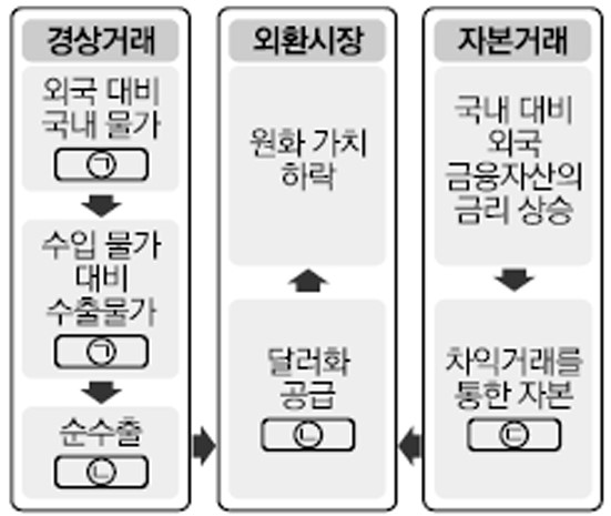 ㉠ ㉡ ㉢ ▶ 해설 외환시장에서 환율의 실물 경제에서 파생된 경상수지와 자본 거래에서 파생된 자본 수지의 영향을 받는다. 외국에 비해 국내 물가상승률이 높으면 수입품 대비 수출품의 상대가격이 상승하여 수출기업의 가격 경쟁력이 저하된다. 이에 따라 순수출이 감소하고 무역수지 및 경상수지가 악화된다. 한편 국내 대비 외국 금융자산의 금리가 상승하면 차익거래의 의해 자본 유출이 발생하고 자본수지가 악화된다. 이 두 가지 경우 모두 외환시장에서 달러화 공급을 감소시키는 요인으로 작용한다. 달러화 공급 감소는 원화 대비 달러화 가치 상승(달러화 대비 원화 가치 하락)으로 이어진다. 정답은 ③. |