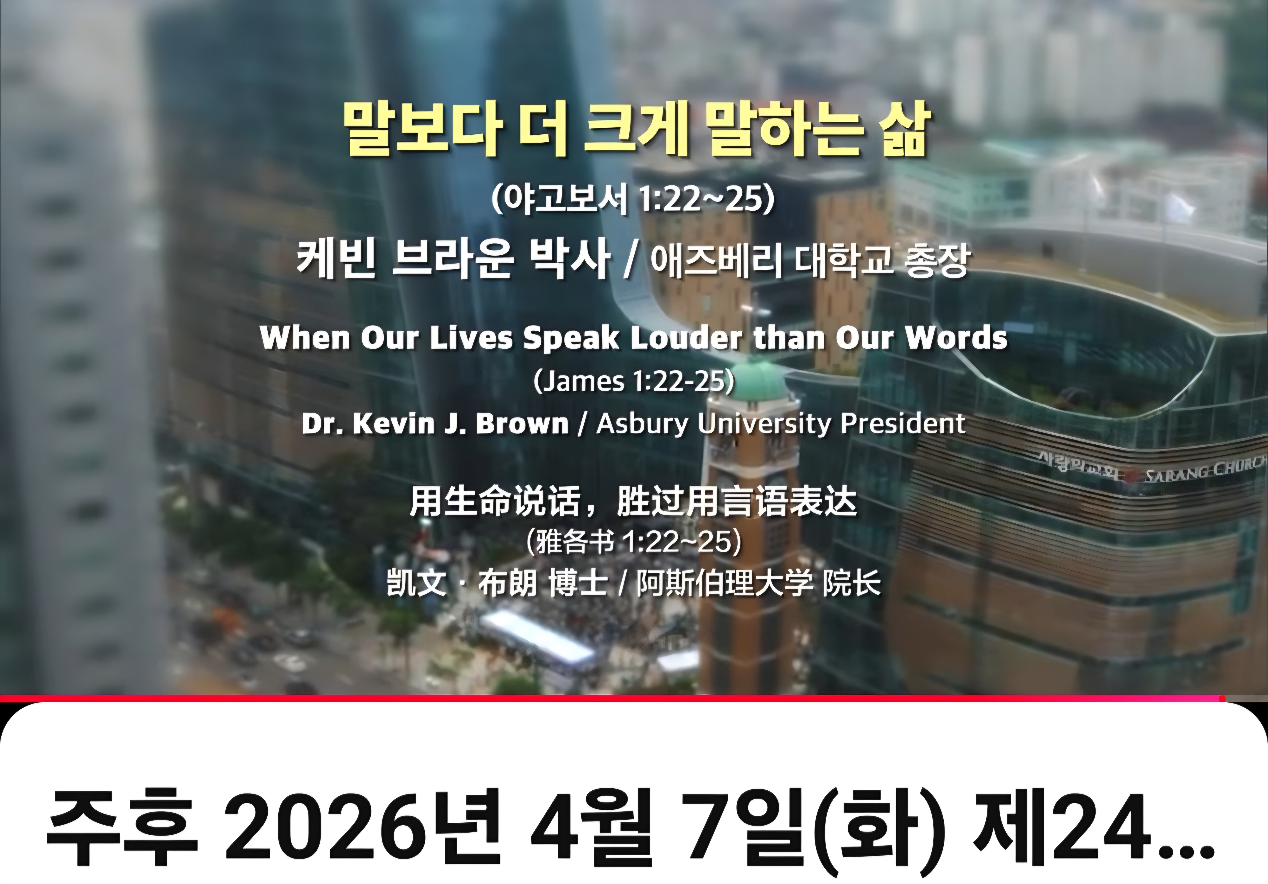 ♣제24차 봄 글로벌 특별새벽부흥회(주후 2026년 04월 07일)-두 번째날(1부) 제목: "말보다 더 크게 말하는 삶" 말씀: 야고보서 1:22-25 설교자: 캐빈 브라운 박사님(에즈베리 대학교 총장) ----- *야고보서 1:22-25, 22 너희는 말씀을 행하는 자가 되고 듣기만 하여 자신을 속이는 자가 되지 말라. 23 누구든지 말씀을 듣고 행하지 아니하면 그는 거울로 자기의 생긴 얼굴을 보는 사람과 같아서. 24 제 자신을 보고 가서 그 모습이 어떠했는지를 곧 잊어버리거니와. 25 자유롭게 하는 온전한 율법을 들여다보고 있는 자는 듣고 잊어버리는 자가 아니요 실천하는 자니 이 사람은 그 행하는 일에 복을 받으리라. ----- ▶야고보서는 진술선호와 현시선호(現示選好)가 일치된 삶을 살라고 요청합니다. 신앙의 위기는 우리의 행동이 입술의 고백과 다른 가치를 드러낼 때, 찾아오기 때문입니다. 따라서 참된 믿음은 행함으로 증명되어야 합니다. 세상이 주는 혼란과 오염, 부주의함의 불균형을 경계하고 말씀에 온전히 집중할 때, 성도는 하나님의 말씀을 살아낼 수 있습니다. 그리고 성도가 그렇게 하나님의 말씀을 살아낼 때, 세상은 우리를 통해 살아계신 그리스도의 능력을 목격하고 온전한 믿음에 이르게 될 것입니다. ![]() ![]() ![]() ㅁ |