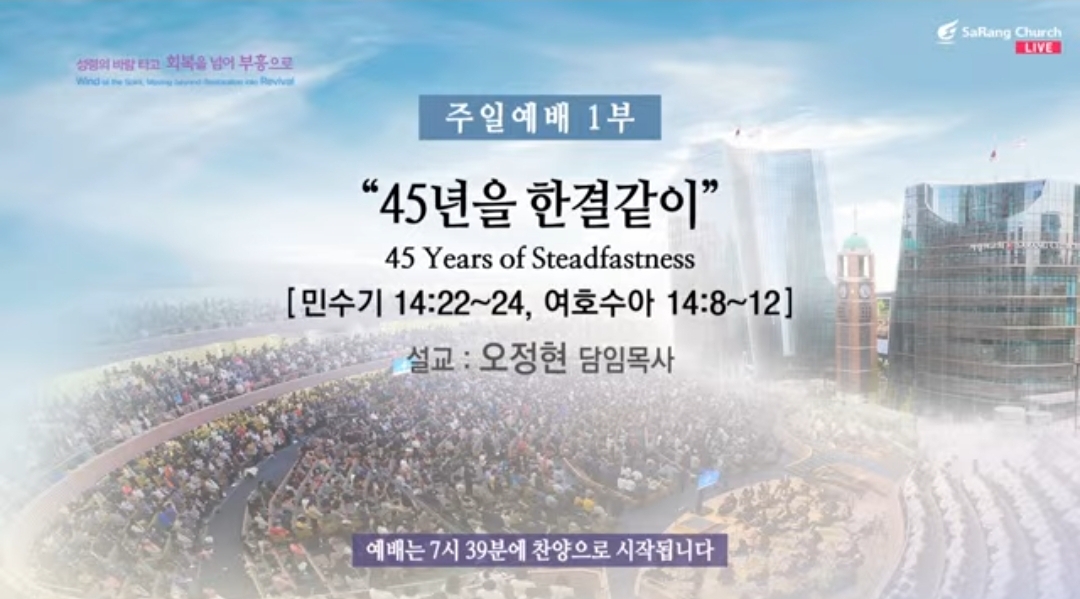 지난 45년을 하나님께서 사랑의 교회를 인도하셨다. 강남 예배당, 서초 예배당 주의 종들을 통하여 사랑의 교회를 오늘까지 붙잡아 주셨다. 45주년을 고 선대 옥한흠 목사님, 한 사람 한 사람을 그리스도의 제자로 키워야 한다는 목적으로 25년 동안 사역을 하시게 하시고 부족한 종이 이어받아서 그 한 사람 한 사람 그리스도의 제자로 온전한 사람 되도록 최선을 다하고 지난 20년을 붙잡고 왔다. 저는 놀랍다. 그리고 우리 교회 초창기부터 성도님들이 45년 동안 한 결 같이 주님을 섬겼다. 이제 45주년을 맞이하는 이 한 해를 어떻게 할 것인가? 오늘 우리가 해야 할 것은 회복을 넘어 부흥으로 갈렙의 자세로 보면,