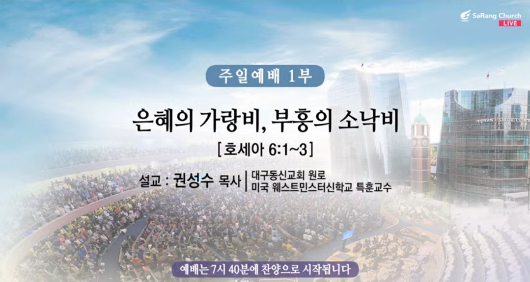 ♣주일예배(주후 2024년 02월 04일) 재목: "은혜의 가랑비, 부흥의 소낙비" 말씀: 호세아 6:1-3 대표기도: 박단열 부목사님(1부) 찬양인도: 쉐키나(오준석 부목사님), 영광찬양대 설교자: 권성수 목사님(대구동신교회 원로-초빙) ----- * 호세아 6:1-3, 1 오라 우리가 여호와께로 돌아가자 여호와께서 우리를 찢으셨으나 도로 낫게 하실 것이요 우리를 치셨으나 싸매어 주실 것임이라. 2 여호와께서 이틀 후에 우리를 살리시며 셋째 날에 우리를 일으키시리니 우리가 그의 앞에서 살리라. 3 그러므로 우리가 여호와를 알자 힘써 여호와를 알자 그의 나타나심은 새벽 빛 같이 어김없나니 비와 같이, 땅을 적시는 늦은 비와 같이 우리에게 임하시리라 하니라. ----- ▷사회: 이제 대구 동신교회 원로이시며 미국 웨스트민스터 신학교 특훈 교수이신 권성수 목사님께서 은혜의 가랑비, 부흥의 소낙비라는 제목으로 주일 말씀을 전해주시겠습니다. ▶사랑의 교회 예배에 참여하신 여러분들, 또 온라인으로 예배드리신 여러분 모두가 평소에 은혜의 가랑비에 영혼이 젖으시면서 하나님의 때에 부흥의 소낙비도 체험하시기를 주님의 이름으로 축원합니다. -요즘 제가 강의 혹은 설교 전후에 자주 듣는 말이 있습니다. ‘지금은 뭘 해도 안 됩니다. 되는 게 없습니다.’ 웬만한 교회는 제자 훈련 다 하고 좋은 프로그램이 있다 그러면 다 따라서 하는데 ‘생명의 변화가 없습니다. 개척교회도 안 되고 또 기존교회도 안 됩니다. 부목사로 기존 교회 들어가려면 100대 1입니다.’ 상대적으로 예전에 비해서 풍요로운 환경 속에서 안 된다는 좌절감과 패배 의식이 가득하다는 것을 느낍니다. 호세아 시대, BC 722년, 722년이 중요한 것은 BC 722년에 북쪽 이스라엘이 아수르의 침공을 받아서 망했기 때문이죠. 북쪽 이스라엘이 망하기 직전 한 30년 동안 예언을 했던 사역자가 호세합니다. 그때도 지금처럼 물질적으로는 풍요로운 편이었지만 ‘낮에도 넘어지고 밤에도 넘어진다.’ 하나는 고백이 터져 나왔습니다. 어떻게 회복하고 어떻게 다시 한 번 재기해야 하겠습니까? 요즘 회복을 넘어 부흥으로라고 하는 캐치 프레이즈를 걸고 교회마다 한국교회가 다시 한 번 회복하고 부응해야 한다는 갈망으로 매진하고 있습니다. 어떻게 하면 부응할 수 있을까요? 어떻게 하면 회복을 체험할 수 있을까요? 오늘 본문 중에 2절에 보시면, *호세아 6:2, 2 여호와께서 이틀 후에 우리를 살리시며 셋째 날에 우리를 일으키시리니 우리가 그의 앞에서 살리라. -말씀이 있습니다. 이틀 후에 셋째 날 이것은 그렇게 중요한 것은 아니죠. 오랜 세월 아니고 얼마 후에 바로 얼마 후에 바로 하나님께서 우리를 살리시며, 살리시며, 살린다. 라고 할 때 NIV 성경을 보면 리 바이블(Rebible)로 나와 있어요. 부흥이 영어로 뭡니까? 리바이벌입니다. 부흥을 주시며 우리에게 부흥을 주시며, 그리고 그 밑에 보면 셋째 날 우리를 일으키시리니 우리가 그의 앞에 살리라 일으키신다. 이것은 리스토어(Restore)-회복시키시다. 리스토어 그러니까 부흥도 주시고 회복도 주신다. 그러면 우리가 하나님 앞에서 살 것이다 하는 그런 말씀이죠. 이 부흥이라고 하는 거는 하나님께서 주셔야 하는 겁니다. 회복을 주셔야 되고 부흥을 주셔야 하고 그렇게 되면 우리가 하나님 앞에서 사는 것 답게 사명을 감당하면서 보람을 느끼고 축복을 받으며 사는 것이죠. 이게 부흥인데 다시 살리신다는 말씀에 전제되는 것이 무엇일까요? 죽었다는 것이에요. 멀쩡하게 살아있는데 뭘 죽었다고 하느냐? 이런 질문이 나올 수 있지만 여기서 말하는 암시된 죽었다는 것은 영적으로 죽었다는 것이죠. 물론 예수 안 믿는 사람들은 영적으로 죽었지만 예수를 믿은 사람도 믿고 있지만 영적으로 죽은 상태 혹은 겁 안 죽은 상태 죽어가는 상태에 있을 수 있습니다. 그것이 무엇일까요? 여러분 성경을 보시면, 요한일서 2장 15절에서 17절까지, *요한일서 2:15-17, 15 이 세상이나 세상에 있는 것들을 사랑하지 말라 누구든지 세상을 사랑하면 아버지의 사랑이 그 안에 있지 아니하니. 16 이는 세상에 있는 모든 것이 육신의 정욕과 안목의 정욕과 이생의 자랑이니 다 아버지께로부터 온 것이 아니요 세상으로부터 온 것이라. 17 이 세상도, 그 정욕도 지나가되 오직 하나님의 뜻을 행하는 자는 영원히 거하느니라. -이 세상과 세상에 있는 것들을 사랑치 말라. 세상에 있는 것은 육신의 정욕과 안목의 정욕과 이생의 자랑이니 이렇게 말씀을 하죠. 이 세상이라고 할 때, 육신의 정욕, 탐욕, 또 눈에 보이는 대로 갖고 싶어 하는 안목의 정욕, 그렇게 되면 은근히 자랑하고 대놓고 자랑하는 이생의 자랑 이 세상에 살아가는 모습이죠. 근데 신자들도 세상에서 살다 보면 세속화하려고 세속화하는 것이 아니고 저절로 세석화가 됩니다. 왜 그럴까요? 하나님은 눈에 보이지 아니하고, 귀로 들리지 아니하고, 손으로 만져지지 않지만, 눈에 보이는 것은 세상이오, 귀로 들리는 것은 세상이오, 손으로 만져지는 것은 세상입니다. 당장 눈앞에 보이고 들리고 만져지는 이 세상이 있기 때문에, 보이지 않고 들리지 않고 만져지지 않는 하나님을 잊어버