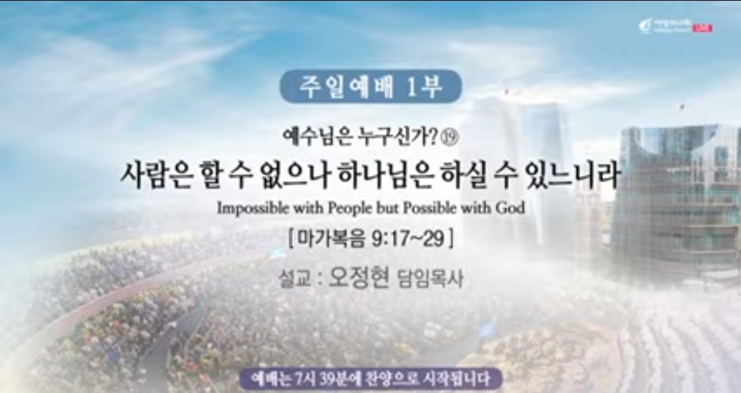 ♣주일예배(주후 2024년 10월 6일) 제목: "사람은 할 수 없으나 하나님은 하실 수 있느니라"-예수님은 누구신가?⑲ 말씀: 마가복음 9:17-29 찬양인도: 쉐키나(이 다니엘 부목사님), 영광찬양대(1부) 대표기도: 김주혁 부목사님(1부) 설교자: 오정현 담임 목사님 ㅡㅡㅡㅡㅡ *마가복음 9:17-29, 17 무리 중의 하나가 대답하되 선생님 말 못하게 귀신 들린 내 아들을 선생님께 데려왔나이다. 18 귀신이 어디서든지 그를 잡으면 거꾸러져 거품을 흘리며 이를 갈며 그리고 파리해지는지라 내가 선생님의 제자들에게 내쫓아 달라 하였으나 그들이 능히 하지 못하더이다. 19 대답하여 이르시되 믿음이 없는 세대여 내가 얼마나 너희와 함께 있으며 얼마나 너희에게 참으리요 그를 내게로 데려오라 하시매. 20 이에 데리고 오니 귀신이 예수를 보고 곧 그 아이로 심히 경련을 일으키게 하는지라 그가 땅에 엎드러져 구르며 거품을 흘리더라. 21 예수께서 그 아버지에게 물으시되 언제부터 이렇게 되었느냐 하시니 이르되 어릴 때부터니이다. 22 귀신이 그를 죽이려고 불과 물에 자주 던졌나이다 그러나 무엇을 하실 수 있거든 우리를 불쌍히 여기사 도와주옵소서. 23 예수께서 이르시되 할 수 있거든이 무슨 말이냐 믿는 자에게는 능히 하지 못할 일이 없느니라 하시니. 24 곧 그 아이의 아버지가 소리를 질러 이르되 내가 믿나이다 나의 믿음 없는 것을 도와 주소서 하더라. 25 예수께서 무리가 달려와 모이는 것을 보시고 그 더러운 귀신을 꾸짖어 이르시되 말 못하고 못 듣는 귀신아 내가 네게 명하노니 그 아이에게서 나오고 다시 들어가지 말라 하시매. 26 귀신이 소리 지르며 아이로 심히 경련을 일으키게 하고 나가니 그 아이가 죽은 것 같이 되어 많은 사람이 말하기를 죽었다 하나. 27 예수께서 그 손을 잡아 일으키시니 이에 일어서니라. 28 집에 들어가시매 제자들이 조용히 묻자오되 우리는 어찌하여 능히 그 귀신을 쫓아내지 못하였나이까. 29 이르시되 기도 외에 다른 것으로는 이런 종류가 나갈 수 없느니라 하시니라. ----- ▶사랑하는 형제자매 여러분, 오늘 이 메시지가 사람의 지혜나 생각으로 하는 메시지가 아니라, 성령 안에서 영이 통하는 메시지가 되기를 바랍니다. 그리고 신앙생활이라는 거는 물에 물 탄 듯 겨우겨우 하는 것, 억지로 하는 것이 아니라 신앙생활은 살아계신 하나님의 말씀, 또 영광 돌리는 예배를 통하여 영적인 쾌거를 경험하는 것입니다. 그래서 오늘 여러분 모두가 다 복락의 강수를 경험하게 하시고, 영혼의 세포가 춤을 추게 하여 주시기를 바랍니다. 오늘 처음 우리 교회에 오신 분들은 저게 도대체 무슨 말인가, 잘 이해가 안 되시더라도 어쨌든 오늘 한 가지는 꼭 해결하시고 얻고 가시기를 바랍니다. 오늘 열아홉 번째⑲, 예수님이 누구신가? 시리즈 사람으로는 할 수 없지만, 하나님은 하실 수가 있느니라 그리고 부제로 말하면 “우리의 믿음 없는 것을 도와주옵소서” 또 우리 예수님 시리즈로 말하면 “참 믿음을 가르쳐 주시는 예수 그리스도”에 대해서 오늘 말씀을 나누도록 하겠습니다. 오늘 본문은 귀신 들린 어린아이가 제자들을 통하여 해결안 받지 못하고 이제 나중에 예수님께서 고쳐주시는 과정이 나와 있는데, 오늘 본문 앞에 보면 예수님께서 변화산성의 열두 제자 가운데서도 베드로 야고보 요한 3명을 데리고 올라갔고 그 나머지 이 제자들이 밑에서 이제 이 귀신들린 정말 어쩔 줄 모르는 그 힘든 아이를 갖고 있는 아버지가 와 가지고 고쳐달라고 그랬을 때, 제자들이 고치지를 못했습니다. 그러니까 제자들이 몇 명 남아있었죠. 9명,,, 벌써 계산이 안 됩니까? 12 제자 가운데 몇 명 올라갔어요. 3명이 올라가고 그다음에 9명이 남아 있었죠. 이 9명이 남아있었는데, 해결을 못 했습니다. 그런데 여러분 이 9명의 제자들이 뭐 오늘 처음 잘 못하고, 뭐 처음 못 고치고, 이런 게 아니에요. 이 마가보문 9장 앞에 보면 마가복음 6장이 있는데, 6장의 예수님께서 제자들을 세우실 때에 그냥 어리버리 하게 그렇게 세운 거 아니고, 6장 우리 7절에 보면 이렇게 나와 있습니다. 같이 보죠. *마가복음 6:7, 7 열두 제자를 부르사...더러운 귀신을 제어하는 권능을 주시고. *마가복음 6:13, 13 많은 귀신을 쫓아내며 많은 병자에게 기름을 발라 고치더라. -12제자를 부르사 그 다음에 더러운 귀신을 제어하는 권능을 주시고, 아무것도 없이 제자 세운 게 아니라 더러운 귀신을 제어하는 권능을 주셨습니다. 그리고 또 그냥 권능 그냥 주시기만 한 것이 아니라 이것이 실제적으로 효과가 발생될 수 있도록 6장 13절에 보니까, 많은 귀신을 쫓아내는 현장도 경험하게 하신 주님이셨습니다. 근데 오늘은 무슨 일이 벌어졌는가, 귀신을 오늘따라 못 쫓아내니까, 아주 의아해하고 번민(煩悶)에 빠지고 궁지(窮地)에 몰린 것 같은 다급한 상황이었어요. 이때 스승이신 예수님께서 변화산성에 내려오셔 가지고, 무슨 일이냐 물으시니까, 귀신들린 아이의 아버지가 18절에 뭐라고 되어 있는가, 내가 선생님의 제자들에게 내쫓아달라고 그랬는데, 그들이 능히 하지 못했다. 19절에 보니까, 그래서 그를 내게 데려오라. 20절에 보니까 이