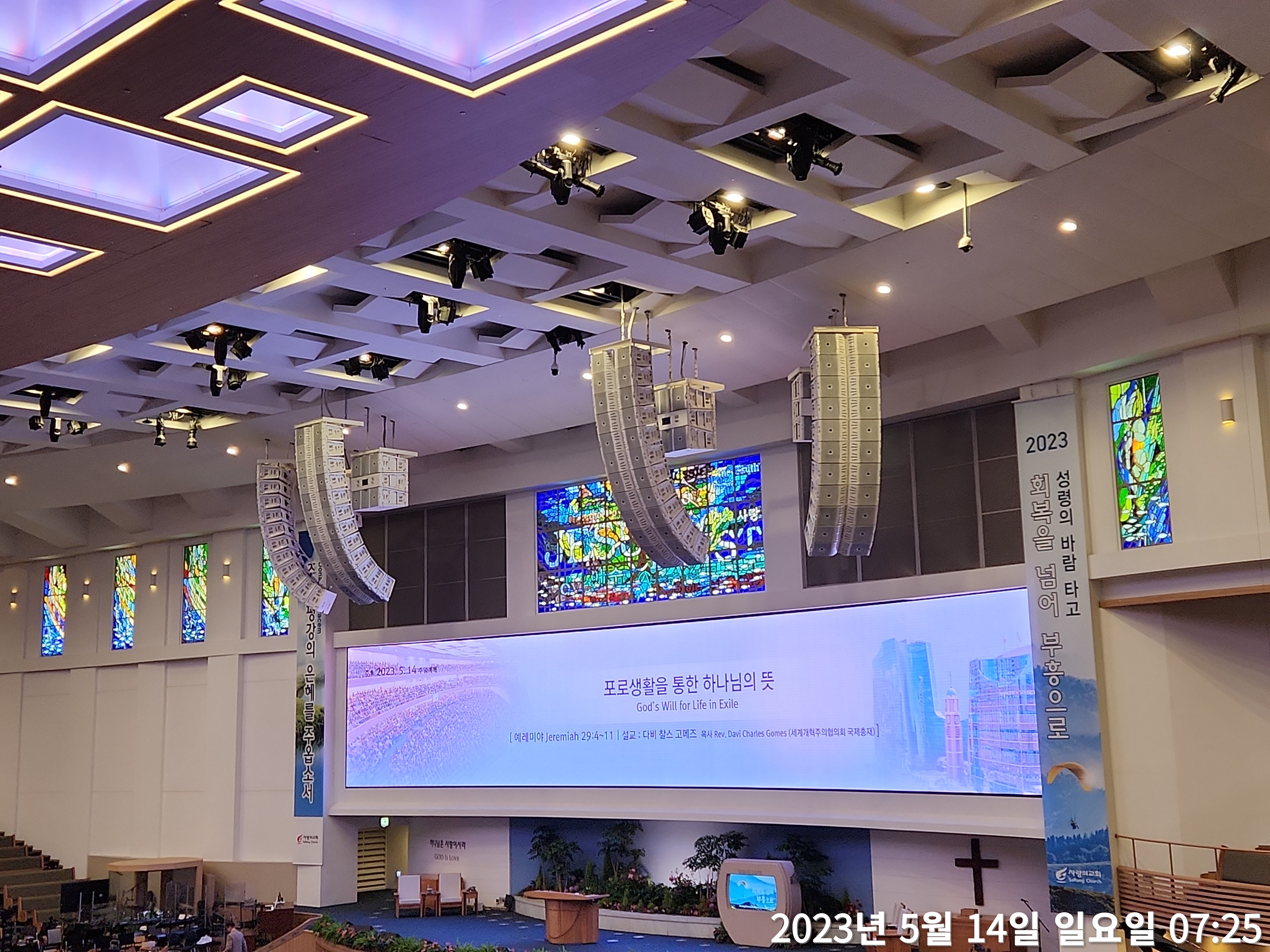 주일예배(2023년 5월14일) 제목: "포로생활을 통한 하나님의 뜻" 말씀:예레미야 29:4-11, 시편 23:5 대표기도: 김건 부목사님 찬양인도: 쉐키나(), 영광찬양대 사회: 천동원 부목사님 설교자: (디비 찰스 고메즈 목사님(1,2부), 데이비드 솬 목사님(3,4부) ------------- *예레미야 29:4-11, 시편 23:5, 말씀: 예레미야 29:4~11, 4 만군의 여호와 이스라엘의 하나님께서 예루살렘에서 바벨론으로 사로잡혀 가게 한 모든 포로에게 이와 같이 말씀하시니라. 5 너희는 집을 짓고 거기에 살며 텃밭을 만들고 그 열매를 먹으라. 6 아내를 맞이하여 자녀를 낳으며 너희 아들이 아내를 맞이하며 너희 딸이 남편을 맞아 그들로 자녀를 낳게 하여 너희가 거기에서 번성하고 줄어들지 아니하게 하라. 7 너희는 내가 사로잡혀 가게 한 그 성읍의 평안을 구하고 그를 위하여 여호와께 기도하라 이는 그 성읍이 평안함으로 너희도 평안할 것임이라. 8 만군의 여호와 이스라엘의 하나님께서 이와 같이 말하노라 너희 중에 있는 선지자들에게와 점쟁이에게 미혹되지 말며 너희가 꾼 꿈도 곧이 듣고 믿지 말라. 9 내가 그들을 보내지 아니하였어도 그들이 내 이름으로 거짓을 예언함이라 여호와의 말씀이니라. 10 여호와께서 이와 같이 말씀하시니라 바벨론에서 칠십 년이 차면 내가 너희를 돌보고 나의 선한 말을 너희에게 성취하여 너희를 이 곳으로 돌아오게 하리라. 11 여호와의 말씀이니라 너희를 향한 나의 생각을 내가 아나니 평안이요 재앙이 아니니라ㅡ 너희에게 미래와 희망을 주는 것이니라. -------- 3,4부-데이비드 현 목사님(3,4부) 말씀: 시편 23:5, *시편 23:5, 5 주께서 내 원수의 목전에서 내게 상을 차려 주시고 기름을 내 머리에 부으셨으니 내 잔이 넘치나이다. ㅡㅡㅡㅡ ▶(디비 찰스 고메즈 목사님(1,2부)-통역 고영규 목사님-"포로생활을 통한 하나님의 뜻" -우리 형제자매 여러분들과 함께 귀한 예배를 드리면서 감사하다. 영어로 말하고 습니다. 저는 포르투갈로도 말씀을 전하겠다. 저는 여러분들과 함께 외국인으로 나그네로 또 혹은 포로의 생활로 삶을 산다는 것이 무엇인가를 나누고 싶습니다. 저 역시 그렇다. 제가 이 세상을 돌아다니면서 또 어디를 여행할 때, 저는 외국인이고, 나그네라는 것을 저는 느낄 수 있다. 그러나 하나님 이런 상황 속에서 하나님의 백성들과 함께 있을 때 그것은 좀 다르다. 제가 지금 이 예배드리기에 들어왔을 때, 그리고 함께 우리가 찬송을 부를 때, 그 찬송은 저의 심장을 그렇게 깨워주고 있었다. 저는 마치 그것이 제 집에 있는 것처럼 저의 교회인 것처럼 느낄 수 있다. 미국에 ‘조지 쉐이’ 라고 하는 사람이 전에 있었다. 그는 미국 가수였다. 노래를 잘 하고 피아노도 잘 치고, 노래에 재주가 있는 사람이었다. 음악계의 거장 한 프로듀서가 그 사람을 초청해서 그 사람의 노래를 들을 수 있도록 있는데, 노래를 듣자마자 이 청년을 유명한 당대 가수로 만들겠다고 그렇게 생각했다. 그런데 이 젊은이는 피아노를 치면서 노래를 했던 친구인데 빌리그래함이 강연을 할 때, 데리고 다니면서 강연을 하고 그 때 피아노를 쳤던 사람이기도 하다. 그래서 그 때에 그는 심한 갈등을 시작했다. 내가 계속해서 이제 복음 전달자를 쫓아다니면서 내가 찬양을 할 것인가? 그 당대 유명한 가수가 되어서 세계적으로 내 이름의 명성을 날릴 것인가에 갈등에 빠졌던 밤에 그가 그 고통 속에서 그는 영감을 받게 되었다. 그가 작곡을 하면서 만든 곡이 우리가 함께 불렀던 찬양이 ‘주 예수보다도 귀한 것은 없네’ 이다. 그 찬양으로 한 가족, 한 교회에 있는 것을 느꼈다. 바로 이 세상의 어떤 보물보다도 우리는 더 이세상과 견줄 수 없는 예수 그리스도를 선택하고 예수 그리스도 앞에 나온 사람들이다. 이 세상을 우리는 모두 누린다고 할지라도 결국은 우리는 어두움에 노예가 되는 것보다는 하나님을 선택했다. 그래서 계속해서 빌리그레함과 함께 복음을 전하면서 수 백명의 사람들과 그는 함께 이 찬양을 불렀다. 그래서 우리는 70년이 흐른 다음에 동일하게 지금 이 상황 속에서 그 모든 것을 내려놓고 그 찬양을 우리가 함께 불렀다. 그래서 저는 이 아침에 특별히 이 찬양을 부르면서 마치 제 가정과 제 교회에 있는 것처럼 그러한 평안함을 느끼고 있다. 그런데 외 이 아침에 제가 이 교회에서 나의 교회, 나의 가족 같다고 하는 것일까? 오늘 우리가 읽은 말씀이다. 그것은 이 세상에서 포로생활을 하고 있는 사람들에게 주시는 말씀이다. 여러분 우리가 이 교회에 나가서 세상으로 살 때는 마치 같은 지역에 살고 있지만 우리가 외국인 같고, 나그네 같고 고독하게 살면서 흩어진 사람처럼 산다는 그런 느낌을 받는다. 지금 세상은 격변기이고 변화무쌍한 그런 무한한 변화 속에서 어쩔 줄 모르게 우리는 살아가고 있다. 브라질 어떤 시인은 다름과 같이 이야기 한다. 지금 살면 살수록 내가 본 고향에 살지만 시간이 지나면 지날수록 나는 마치 객지 생활을 하는 것 같다고 표현했다. 그것은 마치 내가 눈을 떠 봤더니 내가 알지 못하는 세상에 와 있는 것처럼 그런 상황 속에서 사는 것 같다. 여러분은 잘 알고 있을 것이다. 여러분 