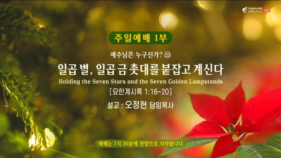 ♣주일예배(주후 2024년 12월 08일) 제목: "일곱 별, 일곱 금 촛대를 붙잡고 계신다" 예수님은 누구신가? (Holding the Seven Stars and the Seven Golden Lampstands)-예수님은 누구신가? 23번째. 말씀: 요한계시록 1:16~18 대표기도: 윤현수 부목사님 찬양인도: 쉐키나(이 다니엘 부목사님), 영광찬양대(1부) 사회: 임병영 부목사님(1부) 설교자: 오정현 담임목사님 ㅡㅡㅡㅡ *요한계시록 1:16~18, 16 그의 오른손에 일곱 별이 있고 그의 입에서 좌우에 날선 검이 나오고 그 얼굴은 해가 힘있게 비치는 것 같더라. 17 내가 볼 때에 그의 발 앞에 엎드러져 죽은 자 같이 되매 그가 오른손을 내게 얹고 이르시되 두려워하지 말라 나는 처음이요 마지막이니. 18 곧 살아 있는 자라 내가 전에 죽었었노라 볼지어다 이제 세세토록 살아 있어 사망과 음부의 열쇠를 가졌노니. 19 그러므로 네가 본 것과 지금 있는 일과 장차 될 일을 기록하라. 20 네가 본 것은 내 오른손의 일곱 별의 비밀과 또 일곱 금 촛대라 일곱 별은 일곱 교회의 사자요 일곱 촛대는 일곱 교회니라. ---- *요한계시록 1:16~18, 16 그의 오른손에 일곱 별이 있고 그의 입에서 좌우에 날선 검이 나오고 그 얼굴은 해가 힘있게 비치는 것 같더라. 17 내가 볼 때에 그의 발 앞에 엎드러져 죽은 자 같이 되매 그가 오른손을 내게 얹고 이르시되 두려워하지 말라 나는 처음이요 마지막이니. 18 곧 살아 있는 자라 내가 전에 죽었었노라 볼지어다 이제 세세토록 살아 있어 사망과 음부의 열쇠를 가졌노니. 19 그러므로 네가 본 것과 지금 있는 일과 장차 될 일을 기록하라. 20 네가 본 것은 내 오른손의 일곱 별의 비밀과 또 일곱 금 촛대라 일곱 별은 일곱 교회의 사자요 일곱 촛대는 일곱 교회니라. ---- ▶사람들은 지금 대한민국의 미래가 어떻게 될 것인가? 특별히 우리 그리스도인들은 기도하고, 또 염려하고 또 기대하고 있습니다. 제가 생각하기에 대한민국의 장래는 대한민국에 근대 역사가 증명했듯이 한국 교회가 어떻게 하느냐에 따라서 대한민국의 장래가 결정된다고 저는 확신합니다. 교회가 바로 가면 이 민족의 장래는 보장되는 겁니다. 그래서 나라가 어떻다 지도자가 어떻다 할 게 아니라 우리가 바로 하면 되는 것입니다. 오늘 저는 일곱 별, 일곱 금 촛대를 붙잡고 계시는 예수님 그리고 오늘 23번째로, 교회를 붙잡고 계시는 예수님에 대한 말씀을 나누도록 하겠습니다. 아 예수님은 마태복음 16장에 보면, 내가 내 교회를 세우겠다. 그리고 성령을 보내셔서 예루살렘 교회를 세우시고, 지상교회를 세우셨습니다. 예수님이 세우신 지상교회는 좋은 교회입니다. 아름다운 교회입니다. 귀한 교회입니다. 아름답고 귀하고 좋은 교회가 예수님이 세우신 교회입니다. 그럼 어떤 교회가 좋은 교회입니까? 나이가 황혼력에 들어 가지고 한 80이 돼 가지고 어떤 할아버지가 황혼력의 세례를 받으셨습니다. 그 딸들과 자녀들을 평생 아버지 예수 믿도록 기도했는데, 그 아버지가 성부와 성자와 성령 이름으로 세례를 주노라. 하면서 할 때 그 아버지도 울고, 세례 마치고 난 다음에 딸들이 와서 아버지 품에 안경해서 아빠! 하면서 아버지 제2의 생일을 축하합니다. 여러분 어떤 교회가 좋은 교회입니까? 복음이 살아있는 교회, 생명의 역사가 있는 교회, 진리가 선포되는 교회가 좋은 교회입니다. 사랑의 교회 권사님이 나이 60대 초반, 50대 후반에 몸이 아파 갖고 갑자기 하나님께 부름을 받았습니다. 근데 그 아내의 아픔을 위하여 눈물로 기도하던 남편은 그 순간 하늘이 무너지는 것 같은 느낌을 가졌습니다. 내가 어떻게 살겠노~~ 아내가 갑자기 죽었는데 그럴 때 다락방 순장, 식구들이 와서 그 남편을 위로하고 격려하고 기도해주고 슬픔과 어려움 가운데 참 위로가 있는 참 위로가 있는 교회가 좋은 교회입니다. 목사님이 여러분, 성찬식 하면서 주님의 몸과 피를 기념하는 이 순간 마음이 찜찜한 거 있고, 사람들과 어떤 미움의 관계에 있고, 사람들과의 갈등관계에 있는 사람들은 오늘 이 성찬식 마치고 난 다음에 다 화해하세요. 그 말을 듣고 교인들이 성차식 마치고 전화를 하고, 편지를 쓰고, 서로 미안하다 그러고 여러분 화해와 용서가 있는 교회가 좋은 교회예요. 아니 하나님의 말씀이 실천되는 교회가 좋은 교회가 되는 것입니다. 새벽에 우리 아이들이 모여 가지고 토요일날 새벽에, 다음 세대 우리 아이들이 나라를 위하여 기도하고, 캠퍼스를 위한 선교사가 되겠다고, 미국 같은 경우는 그렇게 아이들 뭐 예수 믿는다 그러지만 저 아이비리그 같은 데 가갖고 하루만 있으면 애들이 다 세상으로 오염되고, 남녀 공동 샤워장을 쓰고 성적으로 무너지고, 세속주의 가치관이 무너지고, 다 무너지는데 그 아이들을 영적인 전사로 키우고 교회가 믿음에 어떤 훈련을 시켜가지고, 캠퍼스에 선교사로 파송하고, 그래서 내 일이 있고, 젊은이를 키우고 사명이 있고, 비전있는 교회가 좋은 교회인 줄로 믿습니다. 오늘 이런 마음을 앞에 놓고 요한계시로 1장, 2장 오늘 이 말씀을 가지고 어떤 교회가 좋은 교회냐, 우리는 어떤 교회를 이루어 가야 할 것인가? 그리고 민족의 희망과 민족의 장래가 한국 교회에 달려 있다
